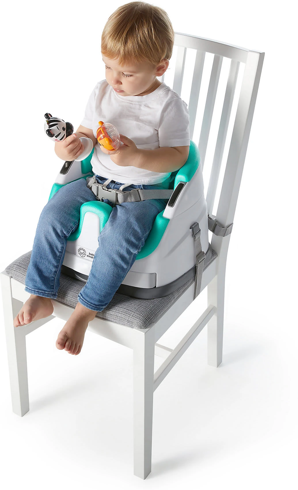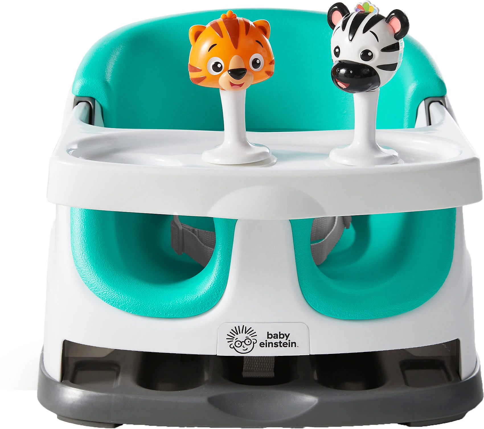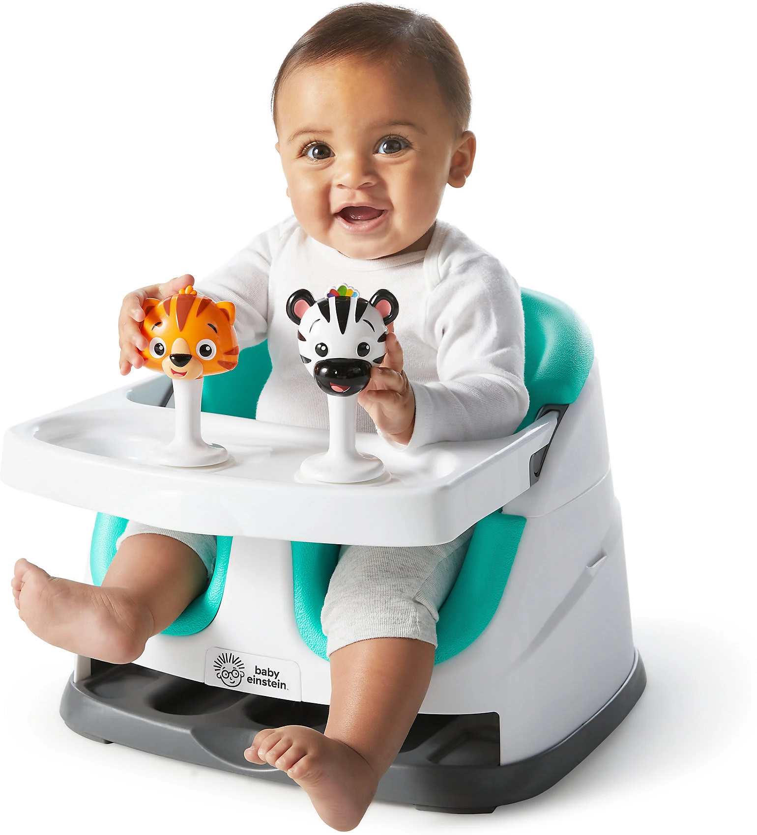 Diese tolle Sitzerhöhung “Dine & Discover Multi-Use” aus der “baby einstein”-Kollektion von Kids II kann kinderleicht an den meisten Esszimmerstühlen befestigt werden und bietet Kindern einen bequemen und sicheren Sitzplatz. Die Erhöhung wird mit Gurten sicher am Stuhl befestigt und auch für das Kind gibt es einen Sicherheitsgurt. Auf der Vorderseite lässt sich ein Tablett anbringen, das als Esstischlein oder als Spieltisch verwenden lässt. Die beiden lustigen Saugnapf-lspielzeuge “Tinker der Tiger” und “Zen das Zebra” sorgen für besonders große Begeisterung! Wird das Tablett gerade nicht gebraucht, kann man in dem Fach der Sitzerhöhung verstauen.