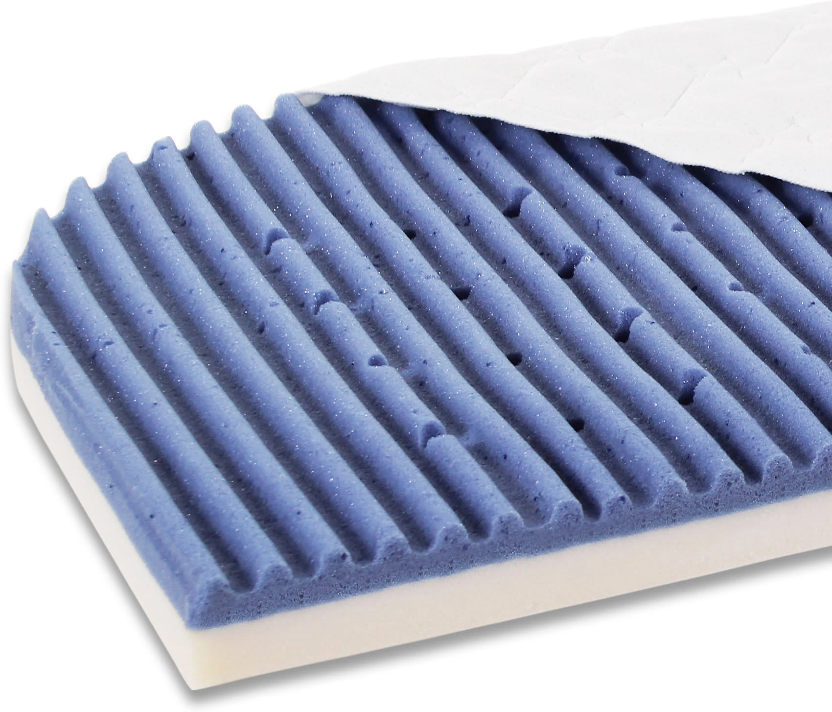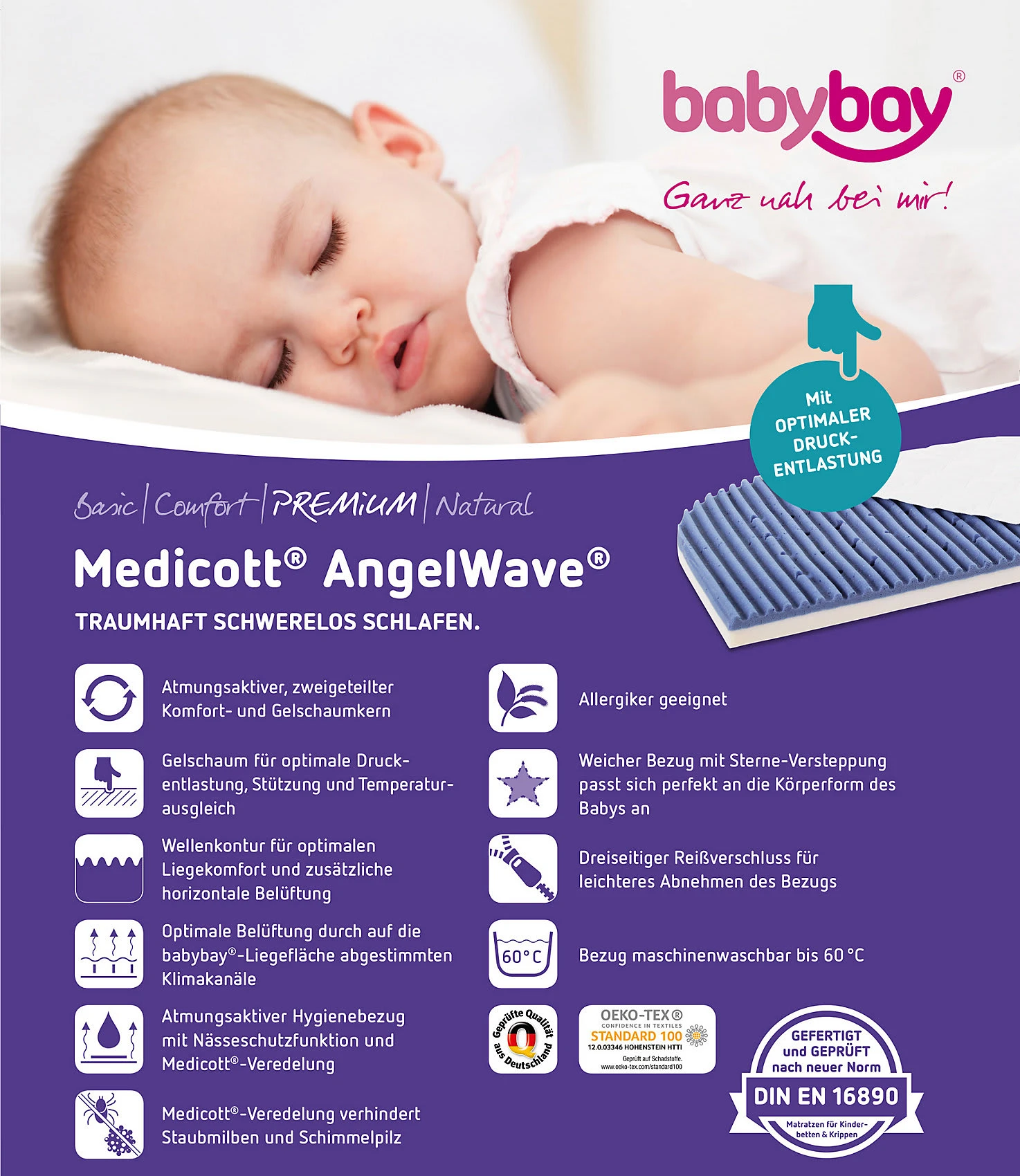 Die TOBI Matratze Medicott AngelWave® für babybay Maxi und Boxspring ermöglicht Ihrem Kind einen guten Schlaf. Der Bezug verhindert das Durchdringen von Nässe und Feuchtigkeit, ist aber dennoch luftdurchlässig – Sie benötigen keine zusätzliche wasserabweisende Auflage. Der Gelschaum Angelpearl® sorgt für die optimale Balance aus sanfter Druckentlastung, Stützung und Temperaturausgleich. Angelpearl® Gelkomfortschaum bietet mit seiner offenzelligen Struktur die perfekte Basis für einen optimalen Körpertemperaturausgleich. Feuchtigkeitsabsorption und hohe Luftzirkulation bieten ein frisches und angenehmes Schlafgefühl – zu jeder Jahreszeit. Die vertikalen Klimakanäle im Gel- und Komfortschaumstoffkern sorgen für eine erhöhte Luftzirkulation und sind auf die Lüftungsschlitze der babybay Liegefläche abgestimmt. Die bessere Sauerstoffzufuhr beugt einem Wärmestau vor. Der Schaumstoffkern passt sich durch die Versteppung des Bezuges der Körperform Ihres Lieblings an, wirkt stützend und sorgt so für einen tiefen, langen, erholsamen und traumhaften Babyschlaf. So fühlt sich Ihr Baby rundum wohl. Der Bezug lässt sich durch seinen dreiseitigen Reißverschluss jederzeit leicht abnehmen und ist bis waschbar.