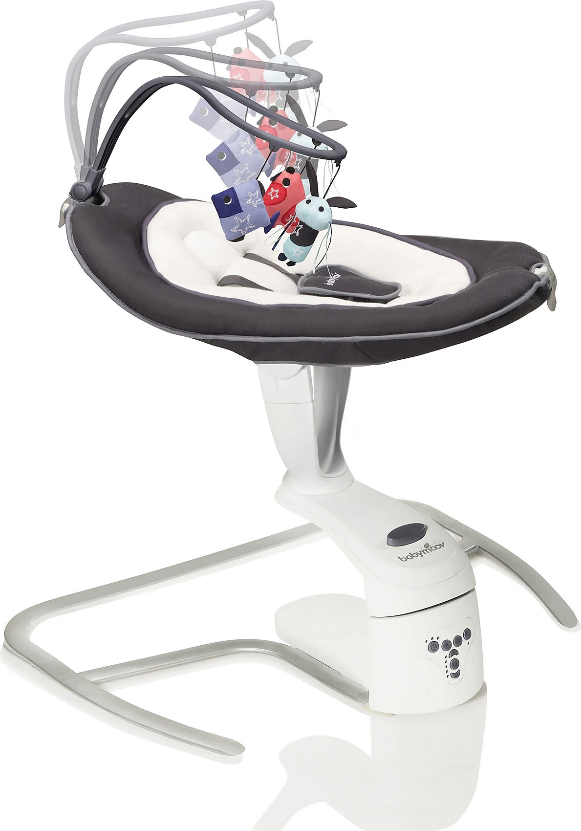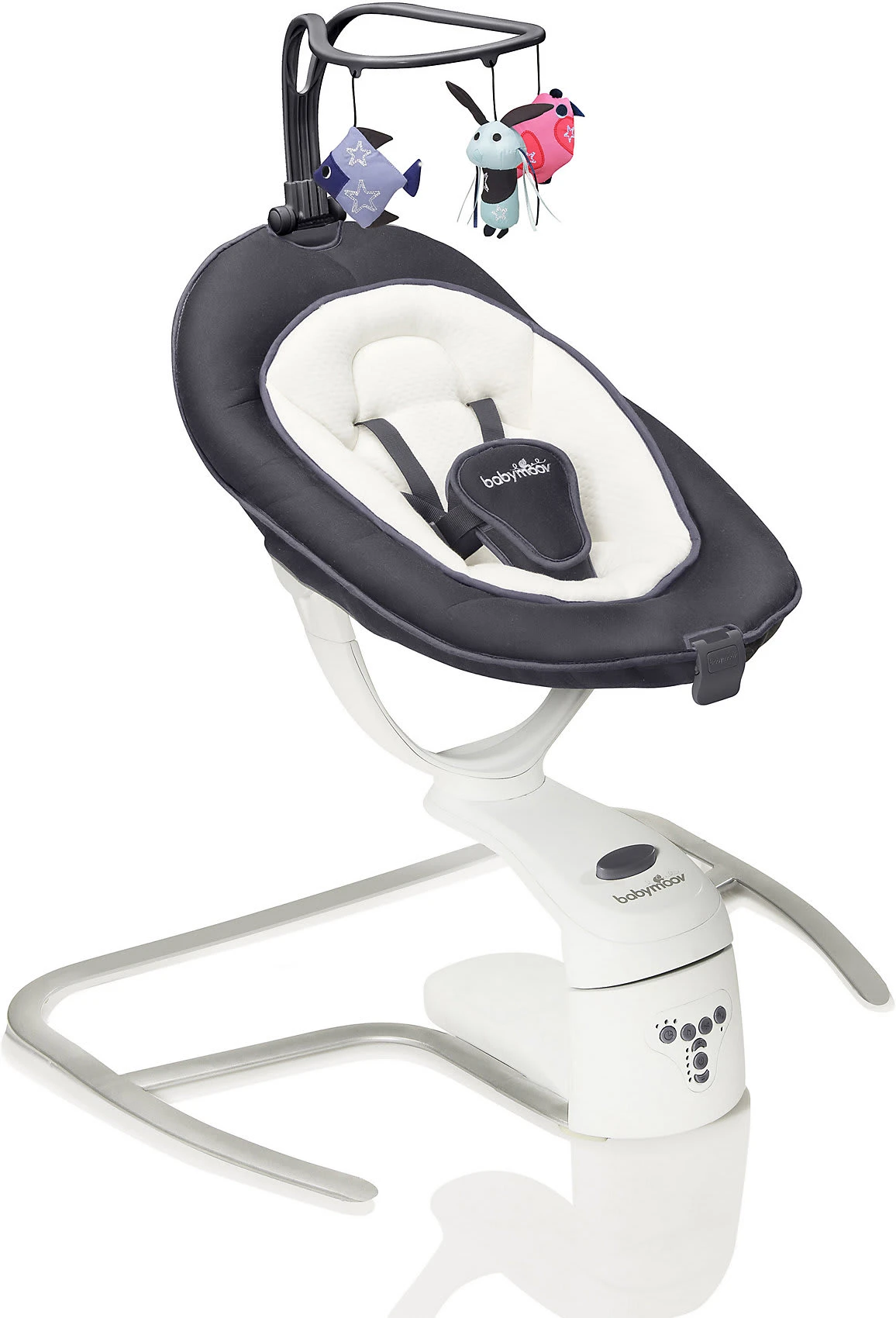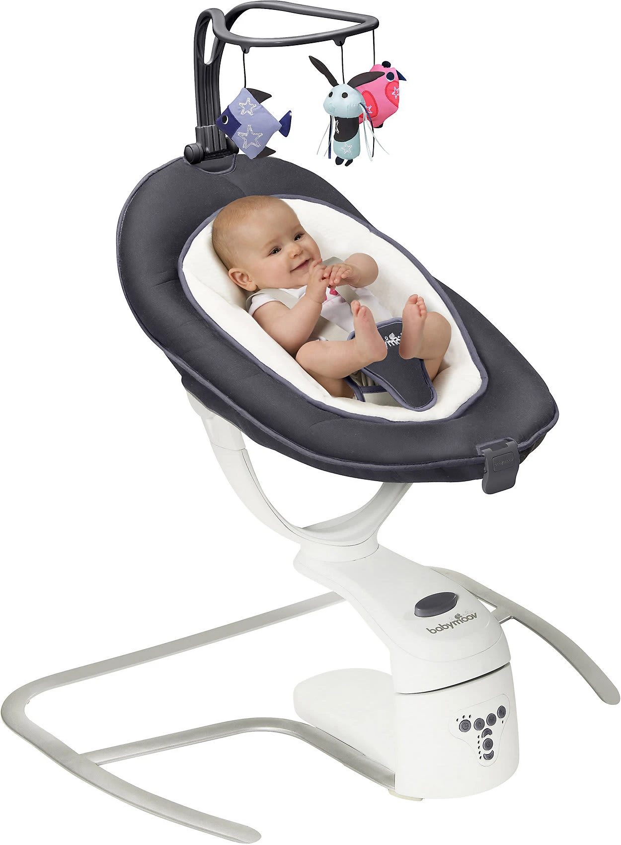 Die Babyschaukel Swoon Motion von Babymoov ist eine perfekte Kombination aus beruhigender Schaukel und Anregung für Ihr Baby. Die Schaukel bietet eine Drehung der Sitzfläche um 360°, eine Schaukelfunktion mit 5 Geschwindigkeiten, 8 Melodien/Naturgeräusche mit MP3 Soundqualität und einer Laustärkenregelung. Ein innovativer Bewegungsmelder kann ebenfalls programmiert werden, d.h., wenn Ihr Baby weint, wird die Schaukelbewegung wieder automatisch ausgelöst. Die Rückenlehne und Fußablage sind unabhängig voneinander mit nur einer Hand einstellbar (jeweils 3 Positionen). Das kleinere Liegekissen ist herausnehmbar und eignet sich ideal für Neugeborene. Der Spielbogen stimuliert Ihr Baby, lässt sich auf 3 Positionen einstellen und ermöglicht deshalb ein einfaches Herausnehmen Ihres Babys aus der Schaukel.