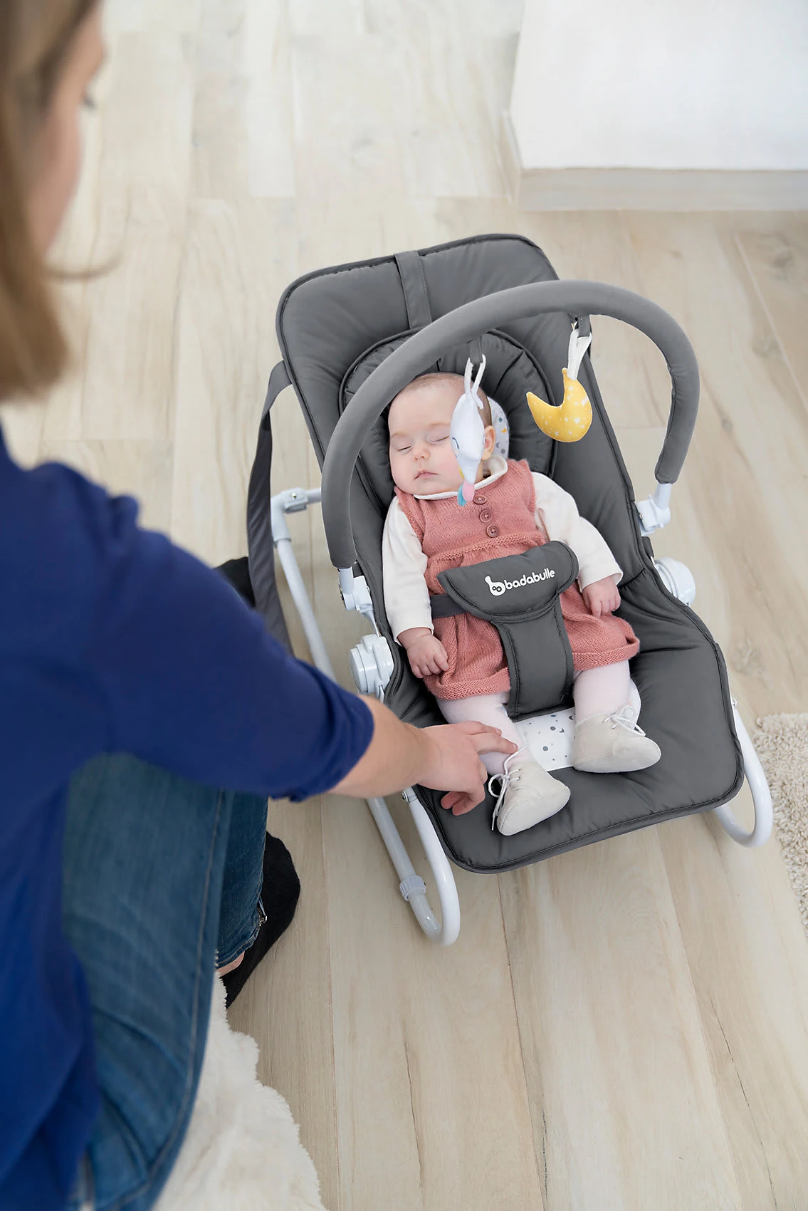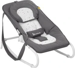 Die Babywippe Easy Moonlight von BADABULLE ist praktisch und komfortabel zugleich! Die weiche, gepolsterte Sitzfläche dieser Babywippe ist an den Babykörper angepasst und ab der Geburt einsetzbar. Die abnehmbare ergonomische Kopfstütze und der Drei-Punkt-Gurt bieten dem Kind guten Halt. Die Rückenlehne lässt sich in mehrere Positionen neigen und die Füße im hinteren Bereich können heruntergeklappt werden. Damit ist die Wippe in einer Position fixiert Für sanfte Schaukelbewegungen lassen sich die Füße ganz einfach einklappen. Der Spielbogen ist in verschiedenen Positionen einstellbar und kann abgenommen werden. Die Babywippe Easy lässt sich kompakt zusammenklappen und ist mit zwei großen Henkeln für einen unkomplizierten Transport ausgestattet. Das Sitzpolster kann in der Maschine gewaschen werden.
