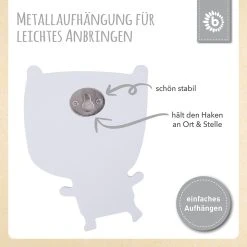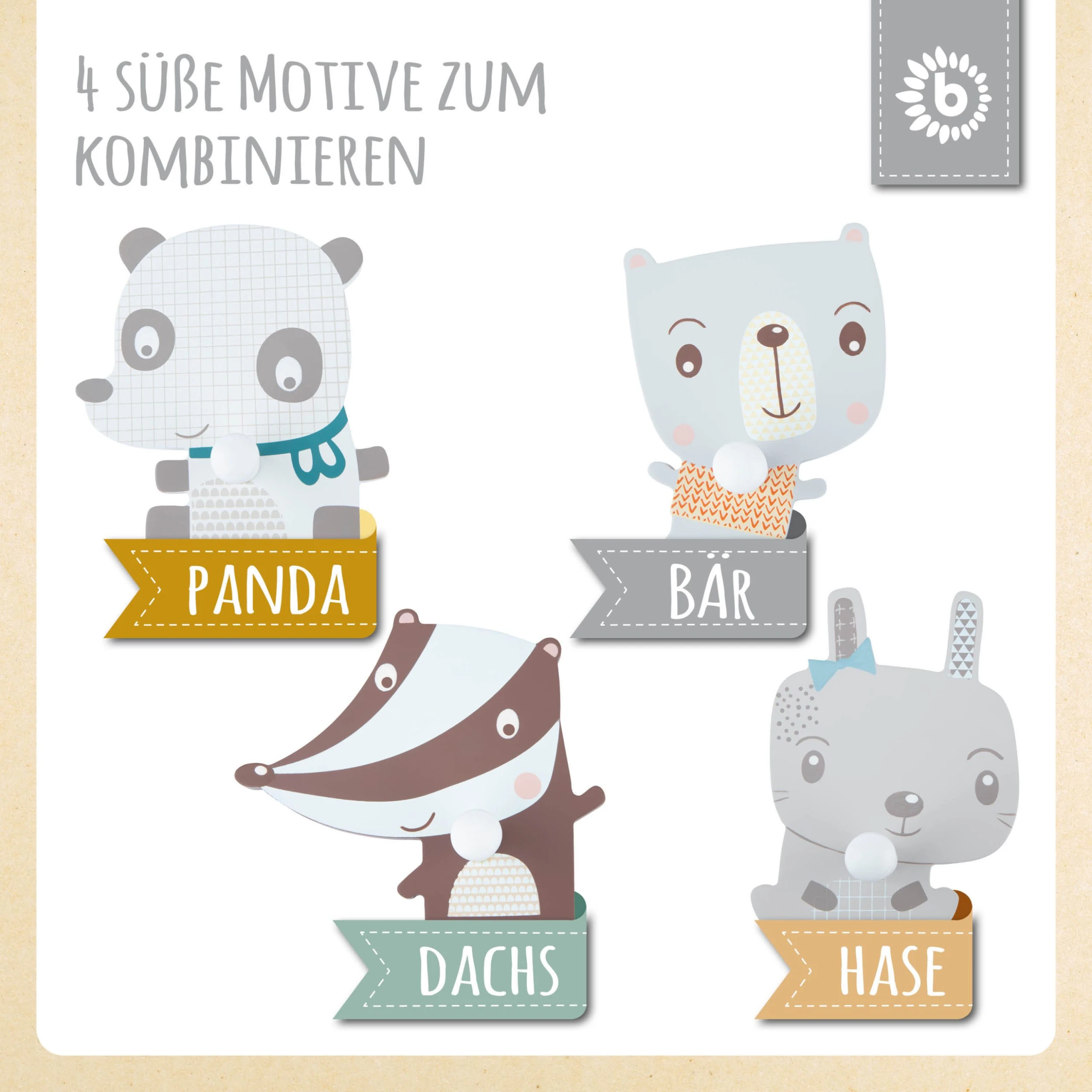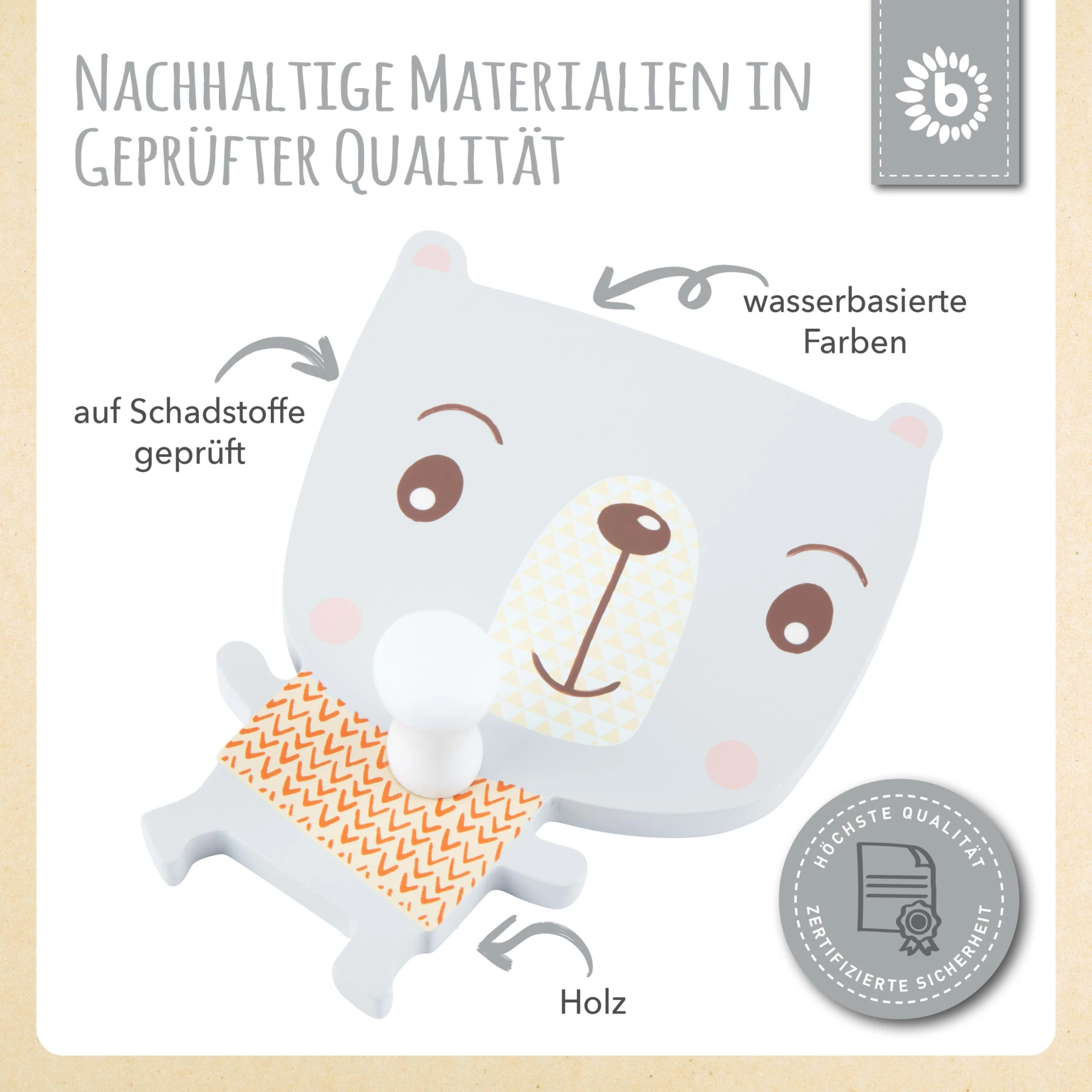Im Kinderzimmer, im Flur oder bei Oma und Opa mit diesem schönen Garderobenhaken von Bieco wird Dein Kind gern Ordnung halten. Die kleinen Wandhaken sind ein Hingucker und praktisch zugleich. Der robuste Haken im Hasen Motiv ist aus Holz gefertigt und bewacht Jacken, Rücksäcke und Co., für eine dekorative Wand und ein aufgeräumtes Zimmer. Wähle oder kombiniere zwischen den vier Motiven: Dachs, Hase, Panda und Katze. Die Marke Bieco steht seit vielen Jahren für höchste Qualität und innovative Produktentwicklung. Unsere Spielwaren für Babys und Kleinkinder unterliegen allesamt den strengsten Richtlinien deutscher Produkt- und Sicherheitsstandards. Bieco möchte Kindergesichter zum Leuchten bringen, deshalb werden alle Designs für unsere Kleinen mit Liebe gefertigt.