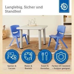 Standsicher, komfortabel und pflegeleicht! der praktische und formschöne Kinderstuhl von Bieco ist aus hochwertigem, wetterfestem Kunststoff in einem trendigen blauen Farbton gefertigt. Dadurch sieht dieser Stuhl außergewöhnlich schick aus und wird Mädchen wie Jungen gleichermaßen begeistern. Die ergonomische Form gewährleistet einen bequemen Sitzkomfort und der sichere Gebrauch ist durch die abgerundeten Kanten, der soliden Standfestigkeit und der hohen Belastbarkeit bis zu 80 Kilogramm gegeben. Die Sitzhöhe beträgt ca. 25 cm und die Abmessungen L/b/H betragen ca. 36x34x51,5 cm. Somit ist der Stuhl optimal für Kleinkinder geeignet, welche bereits sicher sitzen können. Wenn der Stuhl gerade nicht benötigt wird, kann der er platzsparend gelagert werden, da er sich optimal mit baugleichen Stühlen von Bieco aufeinander stapeln lässt, welche es auch in anderen attraktiven Farben gibt. Kombiniere die Stühle zum Beispiel mit dem 62x62x62 cm großen Bieco Kindertisch grün mit der Artikel Nummer 04000033. Durch das witterungsbeständige Kunststoffmaterial kann der Stuhl problemlos draußen als Gartenstuhl, Balkonstuhl oder Terrassenstuhl von den kleinen genutzt werden. Natürlich ist er auch für drinnen bestens geeignet und eine unkomplizierte, kindgerechte und pflegeleichte Sitzgelegenheit fürs Kinderzimmer. Gereinigt werden kann der stapelbare Kindersessel ganz einfach mit einem feuchten Tuch. Die Marke Bieco steht seit vielen Jahren für höchste Qualität und innovative Produktentwicklung. Unsere Spielwaren für Babys und Kleinkinder unterliegen allesamt den strengsten Richtlinien deutscher Produkt- und Sicherheitsstandards. Bieco möchte Kindergesichter zum Leuchten bringen, deshalb werden alle Designs für unsere kleinen mit Liebe gefertigt.