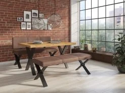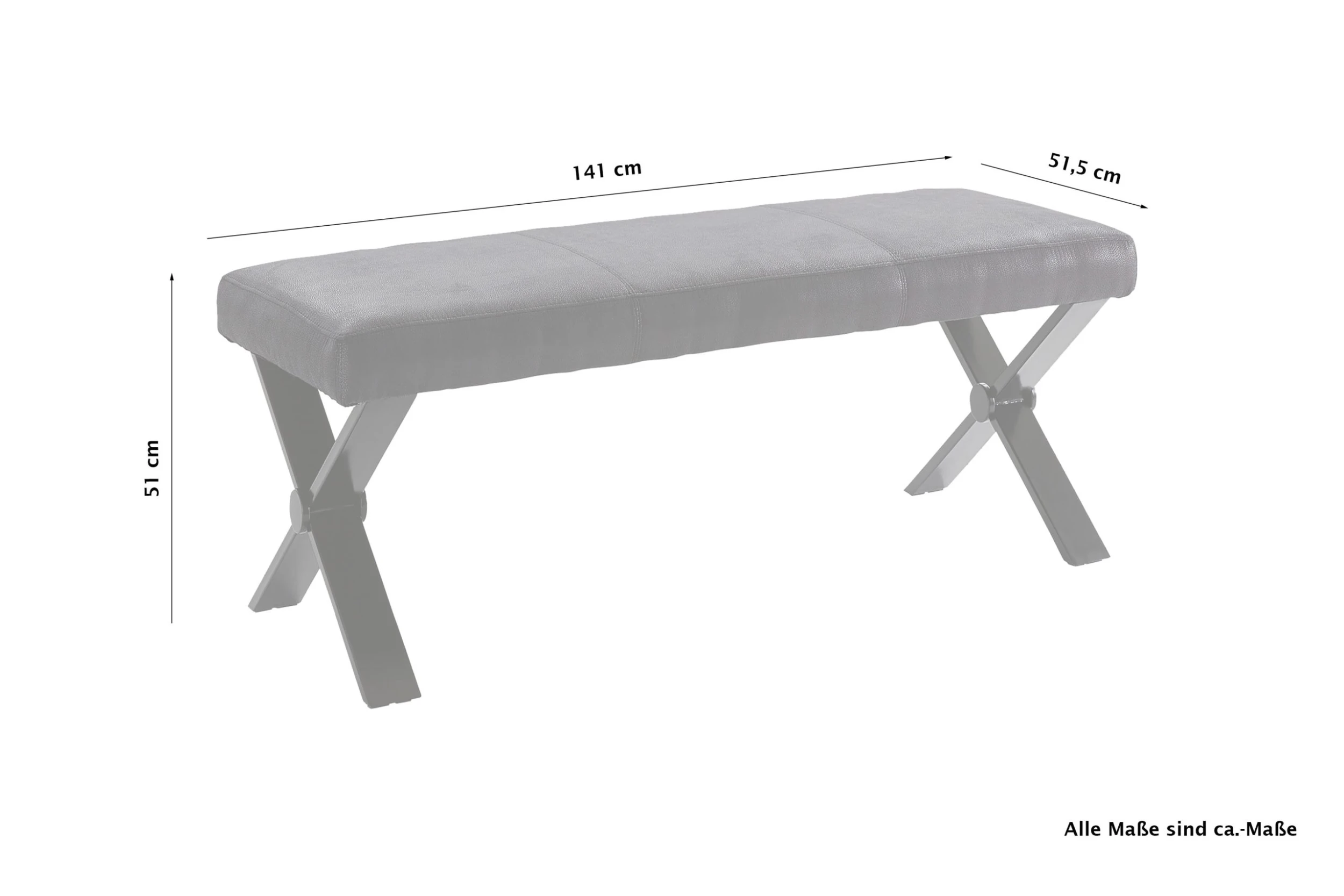 Die Vorbank CLAUDE ist modern und trendig, sie lässt sich zu verschiedensten Einrichtungsstilen kombinieren und verleiht mit ihrem edlen Design jedem Zimmer einen individuellen und stilvollen Charakter. Die weich gepolsterte Sitzfläche sowie die Nosagfederung bieten einen angenehmen Sitzkomfort und eine großzügige Sitzfläche. Die bequeme Polsterbank ist mit edlem Vintage-Stoff bezogen, das neben der ansprechenden Optik auch mit einer angenehm pflegeleichten Oberfläche überzeugt. Den Industrial Stil verleihen der Bank die schwarzen Beine in X-Form. Die Bank ohne Rücken kann vielseitig genutzt werden, ob im Esszimmer, im Schlafzimmer oder im Flur, sie verwandelt jeden Raum in ein trendigen Ort.
