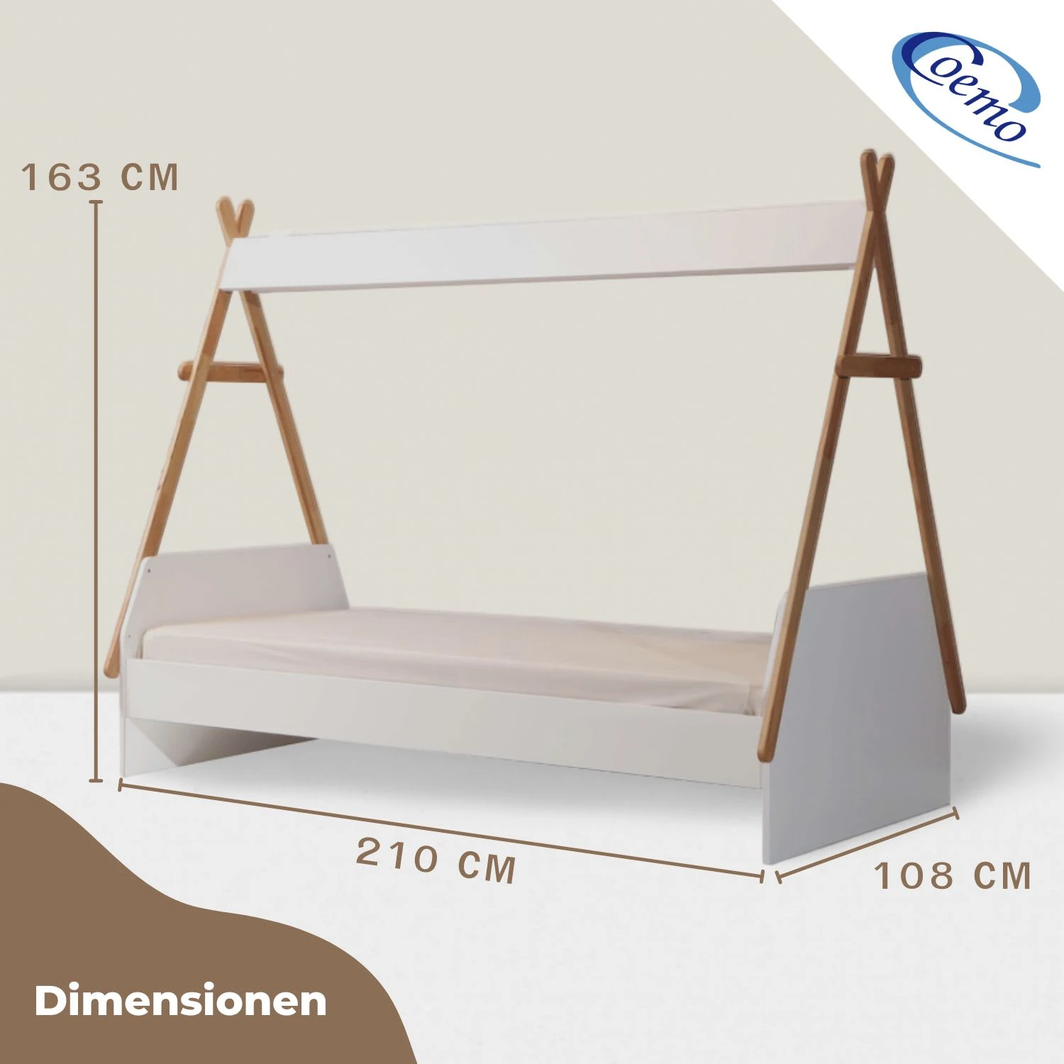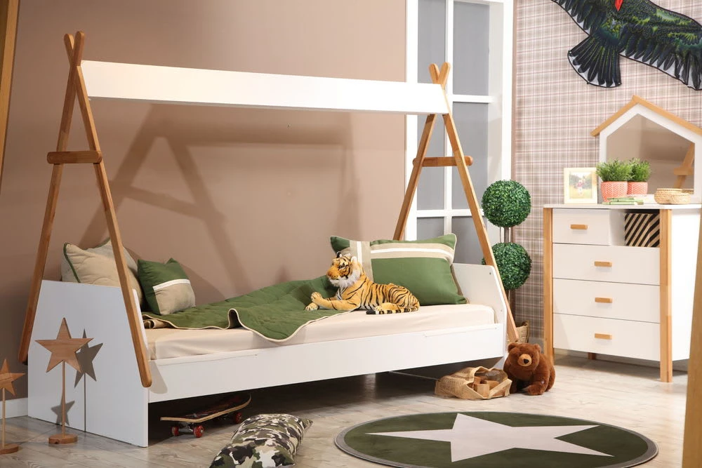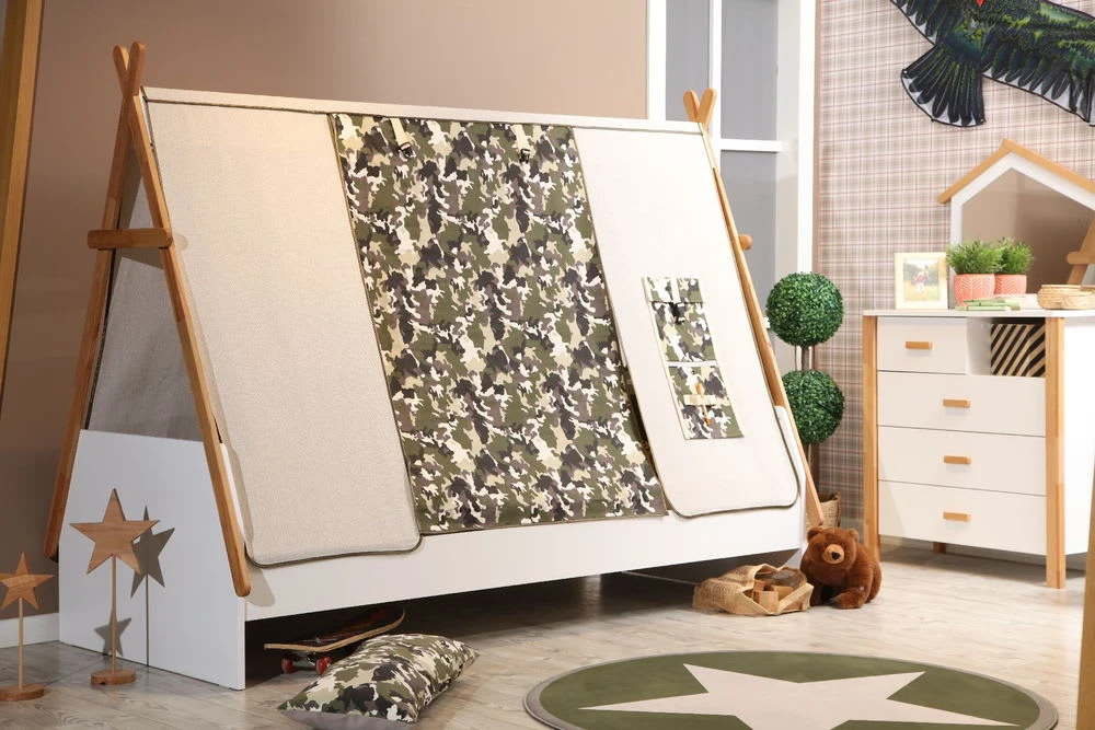 Dieses hübsche Standardbett mit Dach lässt die Formen eines Zeltes erkennen. Das schöne Kinderbett für Mädchen und Jungen hat eine einzigartige Optik, die für viel Spaß im Kinderzimmer sorgt. Das Zeltdach wurde besonders aufwendig gestaltet. Die Frontseite besteht aus drei Bahnen, wovon die mittlere aufgerollt und festgeschnallt werden kann. Eine Bahn wurde zusätzlich mit Taschen versehen. Hier finden kleine Utensilien ihren Platz. Die Rückseite hat einen Fensterausschnitt. Mit diesen Merkmalen ausgestattet, wird das Bett sofort zu einem besonderen Ort im Kinderzimmer. Die Möglichkeiten sind endlos, um eine individuelle Spiel- und Schlafumgebung zu schaffen – Abenteuerspielplatz inklusive.