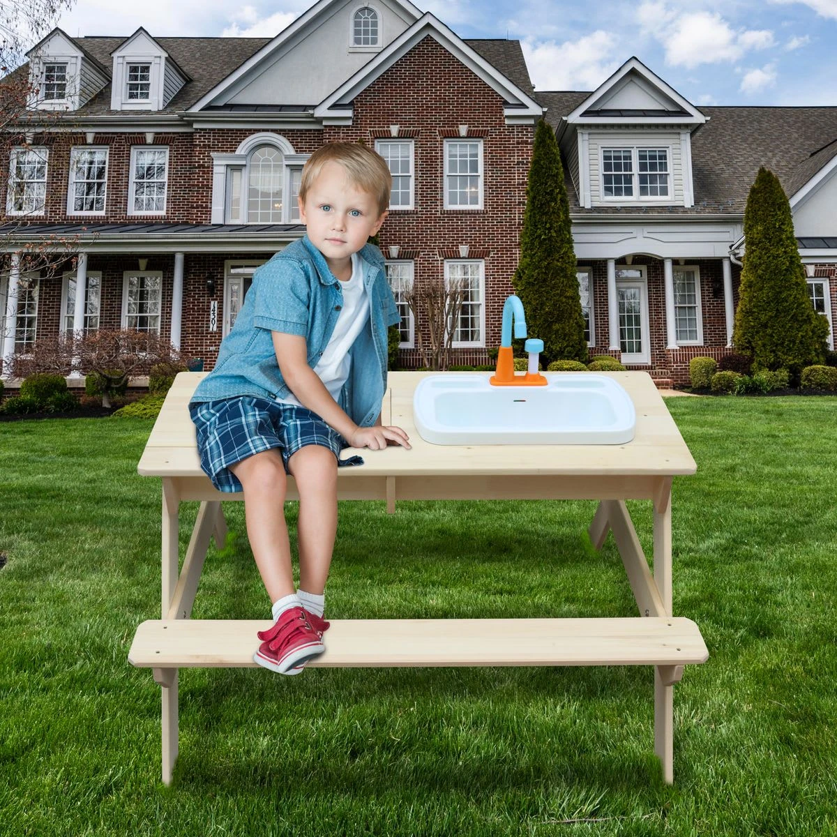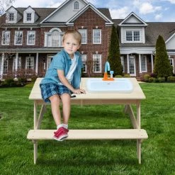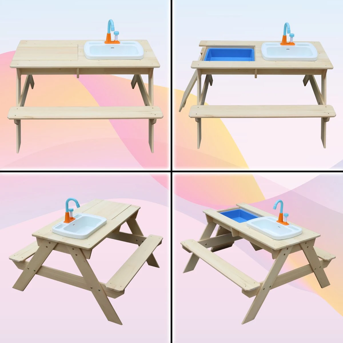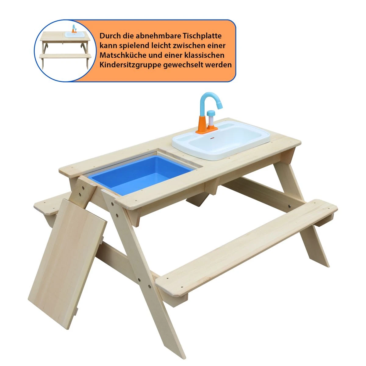 Die Kindersitzgarnitur mit Spielwanne und Wasserhahn ist aus hochwertigem, robustem Massivholz produziert. Die gelungene Kombination aus Sitzgarnitur und Matschtisch bietet Gartenspaß für Jungs und Mädchen. Der multifunktionale Sand- und Wasserspieltisch dient als Sitzgarnitur zum Picknicken und dank abnehmbarer Tischplatte auch als Spieltisch für Sand, Wasser und Matsch. Die fest verschraubten Sitzbänke bieten komfortablen und sicheren Sitz für Kinder. Die Tischplatte der Sitzgruppe ist halbseitig abnehmbar. Darunter verbirgt sich eine Wasserwanne aus robustem Kunststoff. Ihre Kinder können mit Wasser spielen und Sandburgen bauen. Besonders originell: der Wasserhahn ist mit einem Wassertank unterhalb der Tischplatte verbunden. So kann Wasser in das Waschbecken gepumpt werden.