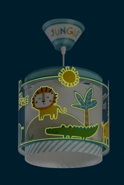 Die Deckenlampe Little Jungle spendet ein angenehmes Licht. Die verschiedenen Dschungeltiere und Hintergünde leuchten sogar im Dunkeln noch weiter. Deckenlampe Little Jungle von Dalber mit Dschungelmotiven runder, doppelter Lampenschirm fluoreszierender Effekt abnehmbarer Lichtdiffusor höhenverstellbar aus Polypropylen Die lustigen Dschungeltiere begeistern kleine Tierfreunde sofort: Ein Löwe, eine Giraffe, ein Zebra, ein Elephant, ein Tukan und ein Krokodil tummeln sich auf dem äußeren Schirm. Auf dem Inneren sorgen Palmen, eine Sonne und Blätter für die perfekte Hintergrundkulisse. Die Deckenleuchte ist höhenverstellbar: So fügt sie sich ideal in jeden Raum ein. Die Leuchte ist aus transparentem Polypropylen gefertigt und verfügt über einen abnehmbaren unteren Lichtdiffusor. Der sorgt für indirektes Licht, damit Dein Kind nicht geblendet wird. Faszinierend: Die Umrisse der Tiere und Hintergründe leuchten im Dunkeln noch einige Minuten weiter. So schlummert Dein Mini noch entspannter ein. Hinweis Das passende Leuchtmittel (E27, 15W LED) ist nicht im Lieferumfang enthalten.