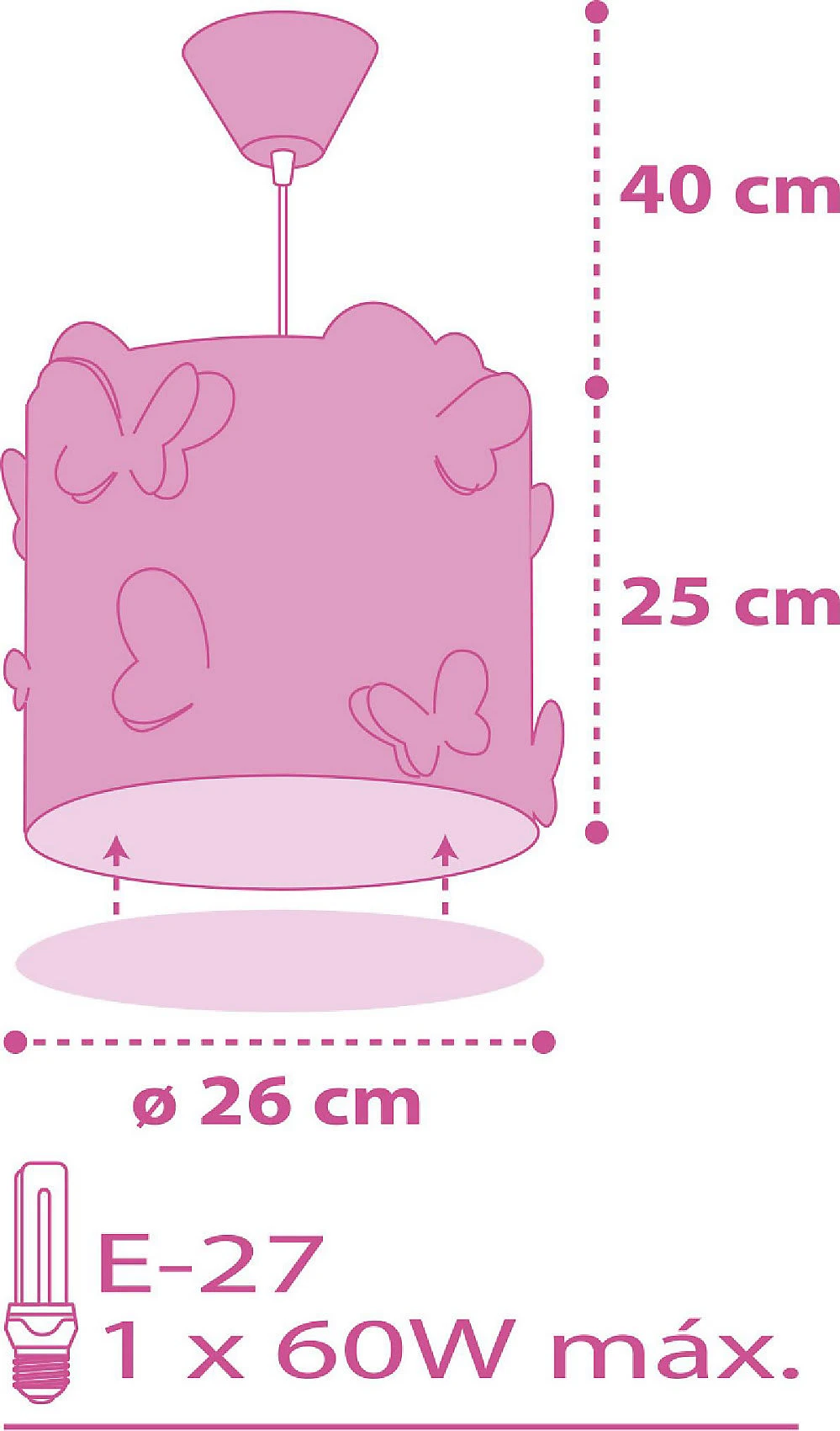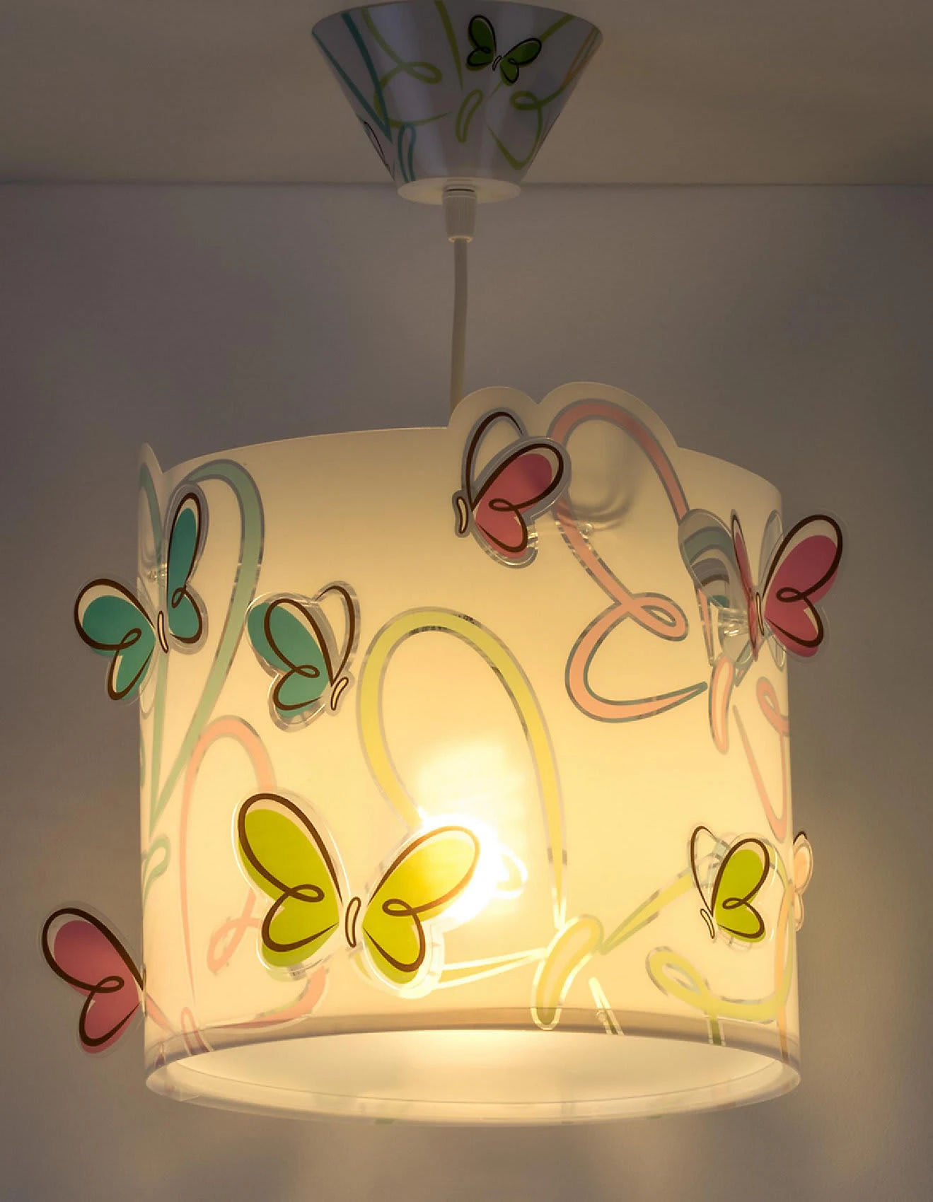 Diese Hängelampe von Dalber überzeugt durch ihre Hochwertigkeit und das wunderschöne Design. Auf dem Schirm haben sich bunte Schmetterlinge niedergelassen sodass besondere Lichteffekte im Kinderzimmer entstehen.