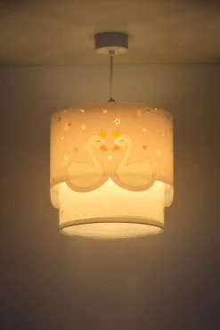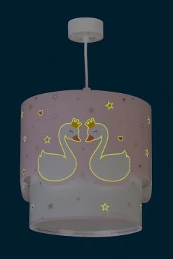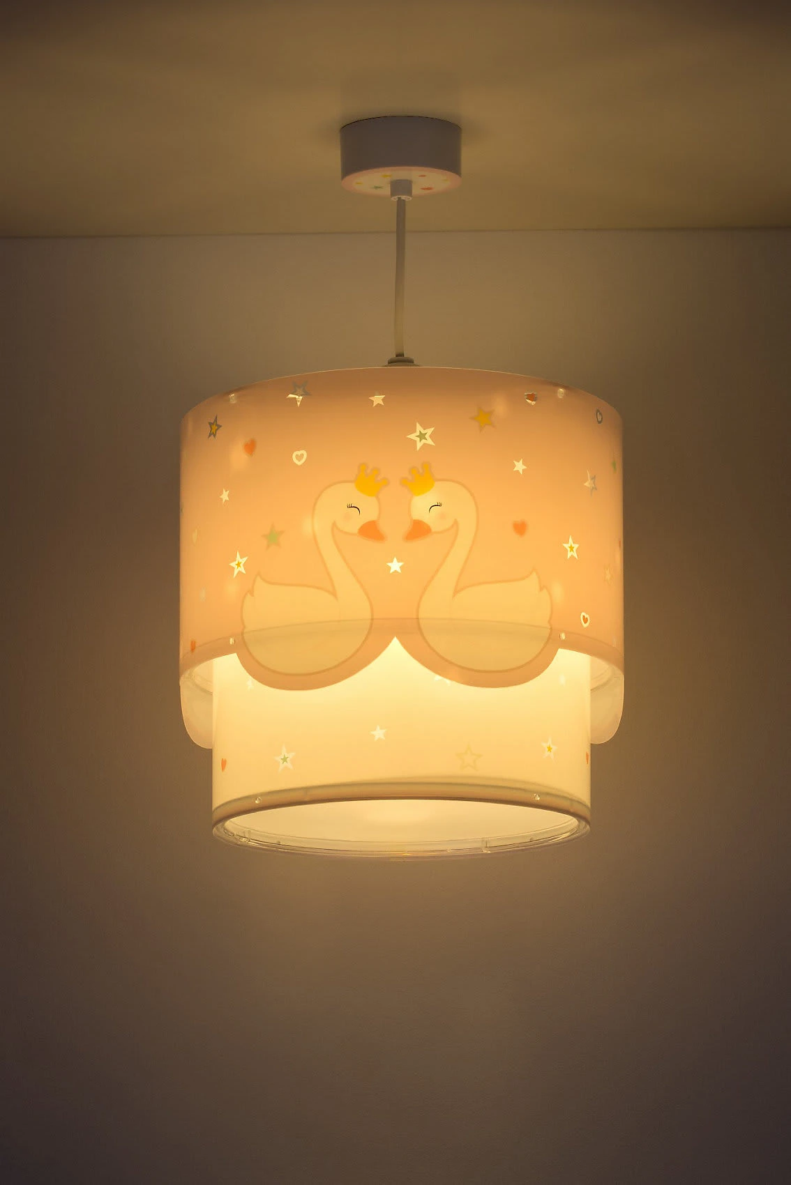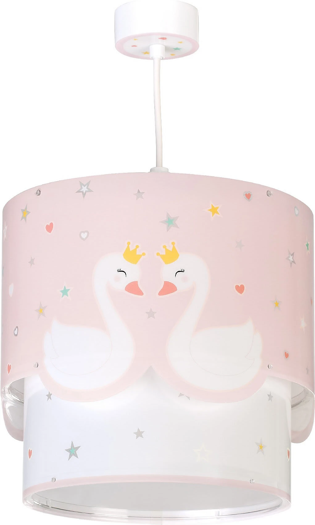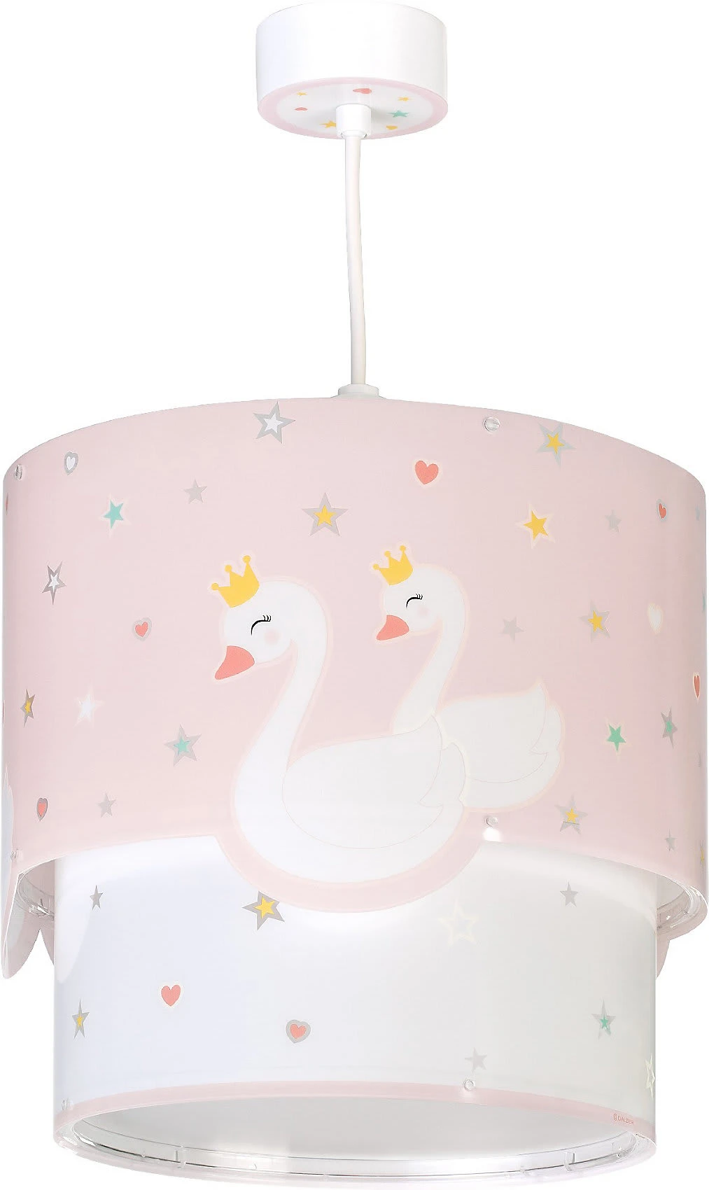 Ein niedliches Schwanenpaar prägt das Design der Deckenlampe Sweet Love von Dalber. Das angenehme Licht schafft eine behagliche Atmosphäre. Deckenlampe Sweet Love von Dalber mit Stern-, Herz- und Schwanenpaarmotiven runder, doppelter Lampenschirm fluoreszierender Effekt abnehmbarer Lichtdiffusor höhenverstellbar aus Polypropylen Die Deckenlampe aus der Kollektion Sweet Love besticht mit einem niedlichen Design. Ein Schwanenpaar, Herzen, Kronen und Sterne ermuntern Deinen Mini zum Anschauen. Die Lampe ist mit einem doppelten Lampenschirm aus transparentem Polypropylen ausgestattet. Ihr Licht wirkt warm und entspannend. Sie ist höhenverstellbar, damit sie sich perfekt an die Raumhöhe anpassen lässt. Die Leuchte verfügt über einen abnehmbaren unteren Lichtdiffusor. So wird Dein Kind nicht geblendet. Der Clou nach dem Ausschalten: Der Fluoreszenzeffekt lässt die Umrisse der Schwäne und Sterne noch einige Minuten nachleuchten. Das Einschlummern gelingt dann viel besser. Hinweis Das passende Leuchtmittel (E27, 15W LED) ist nicht im Lieferumfang enthalten.