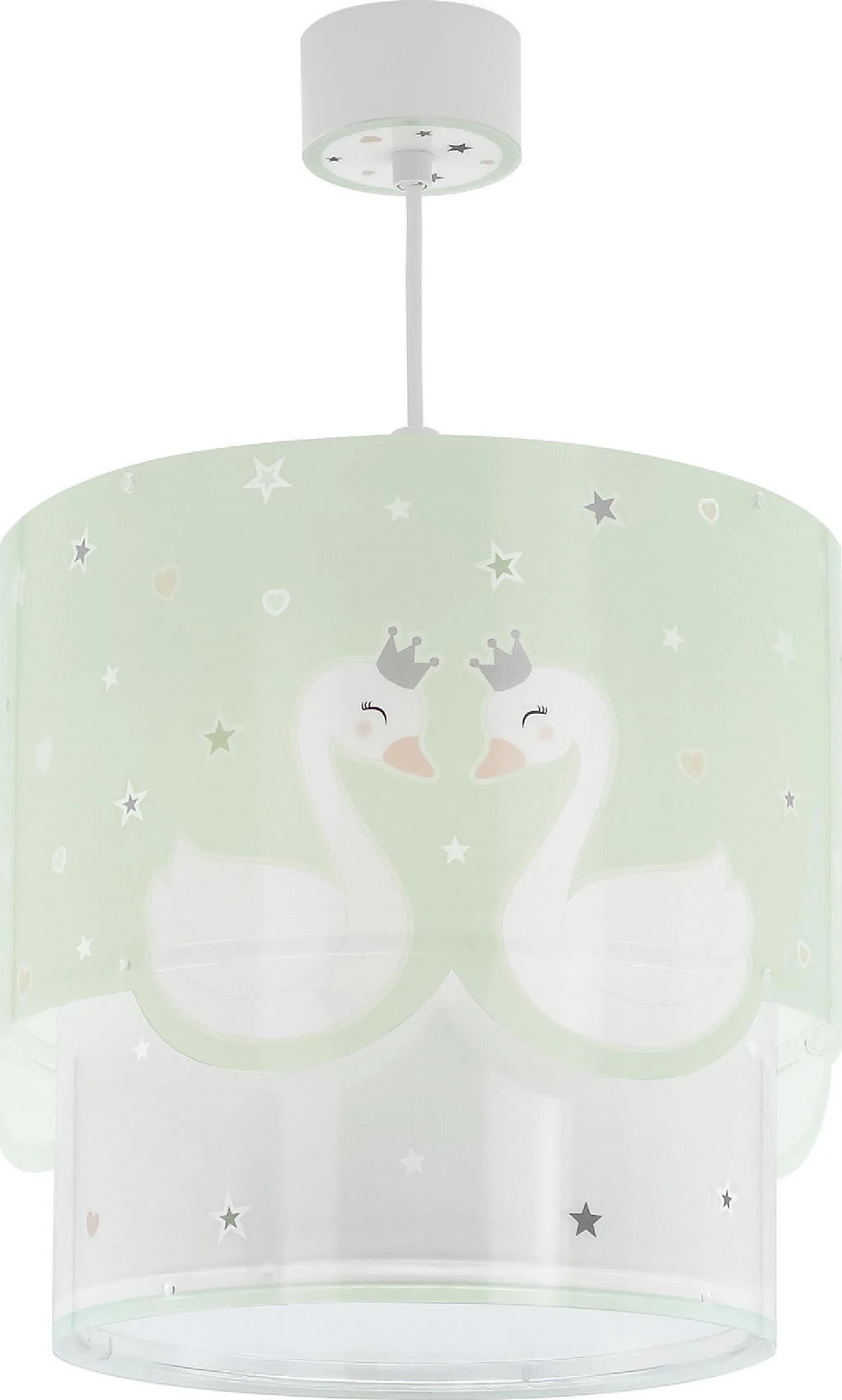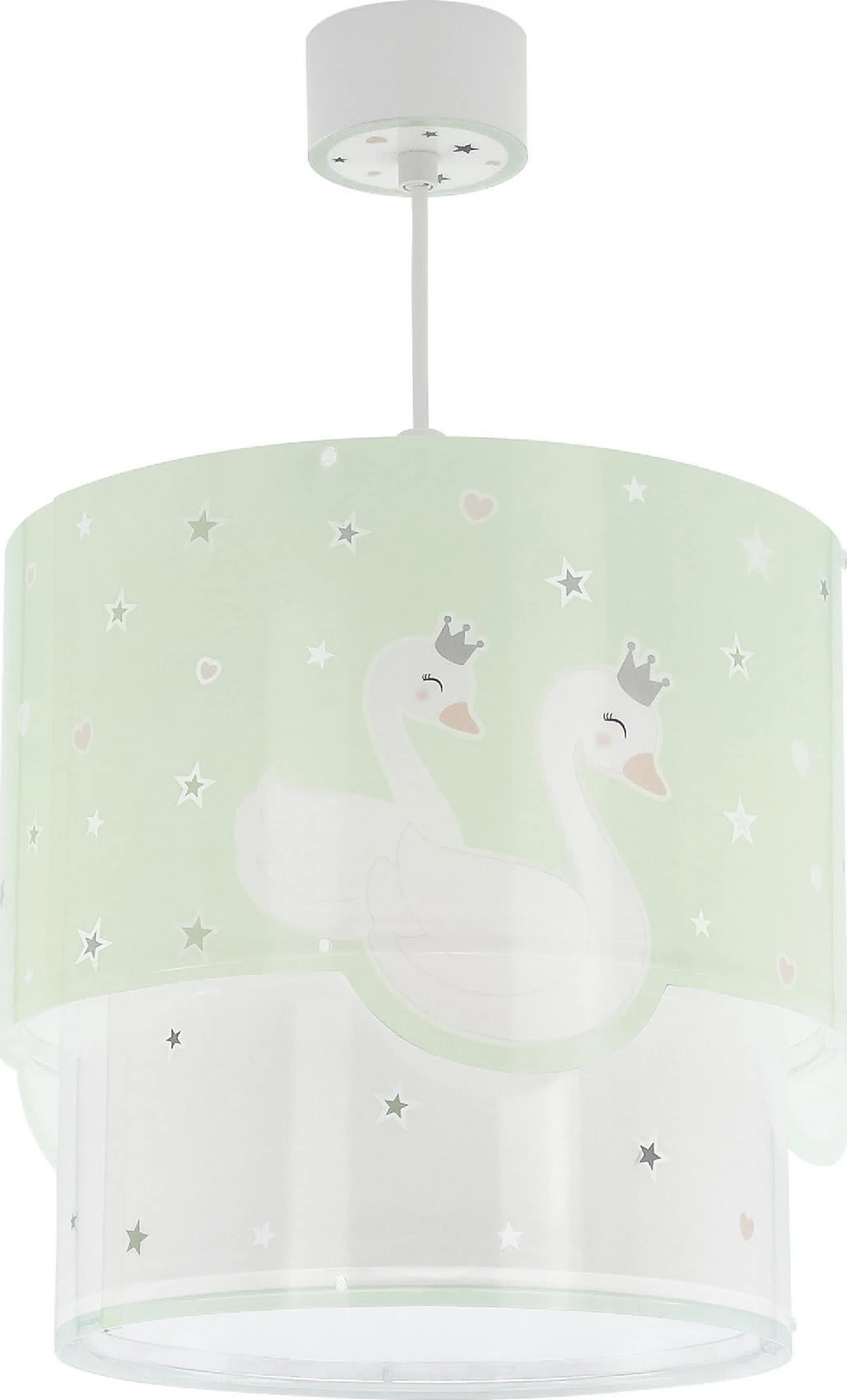 Ein niedliches Schwanenpaar prägt das Design der Deckenlampe Sweet Love von Dalber. Das angenehme Licht schafft eine behagliche Atmosphäre. Deckenlampe Sweet Love von Dalber mit Stern-, Herz- und Schwanenpaarmotiven runder, doppelter Lampenschirm fluoreszierender Effekt abnehmbarer Lichtdiffusor höhenverstellbar aus Polypropylen Die Deckenlampe aus der Kollektion Sweet Love besticht mit einem niedlichen Design. Ein Schwanenpaar, Herzen, Kronen und Sterne ermuntern Deinen Mini zum Anschauen. Die Lampe ist mit einem doppelten Lampenschirm aus transparentem Polypropylen ausgestattet. Ihr Licht wirkt warm und entspannend. Sie ist höhenverstellbar, damit sie sich perfekt an die Raumhöhe anpassen lässt. Die Leuchte verfügt über einen abnehmbaren unteren Lichtdiffusor. So wird Dein Kind nicht geblendet. Der Clou nach dem Ausschalten: Der Fluoreszenzeffekt lässt die Umrisse der Schwäne und Sterne noch einige Minuten nachleuchten. Das Einschlummern gelingt dann viel besser. Hinweis Das passende Leuchtmittel (E27, 15W LED) ist nicht im Lieferumfang enthalten.
