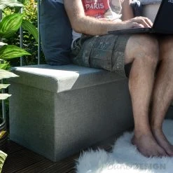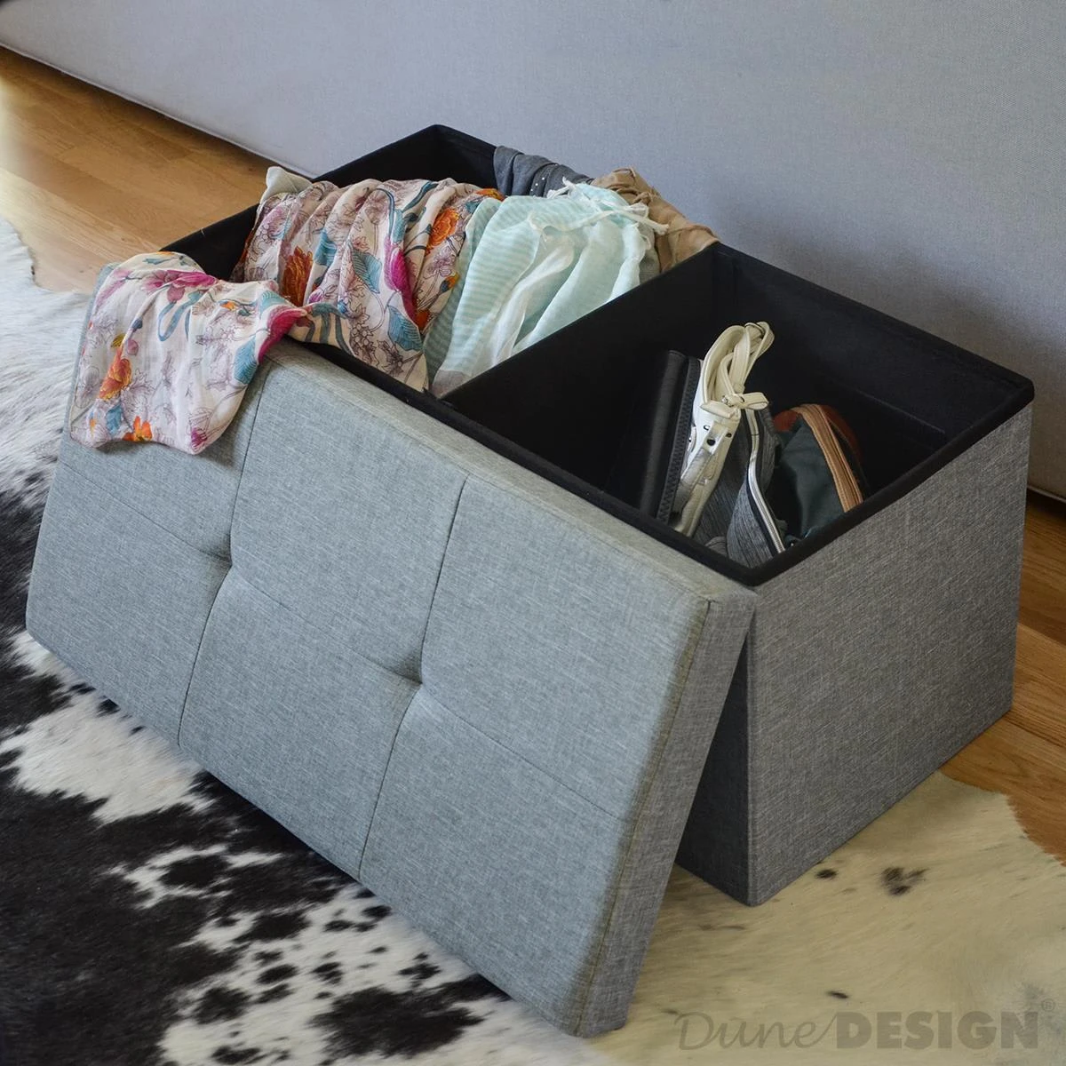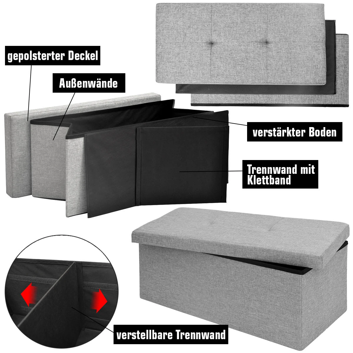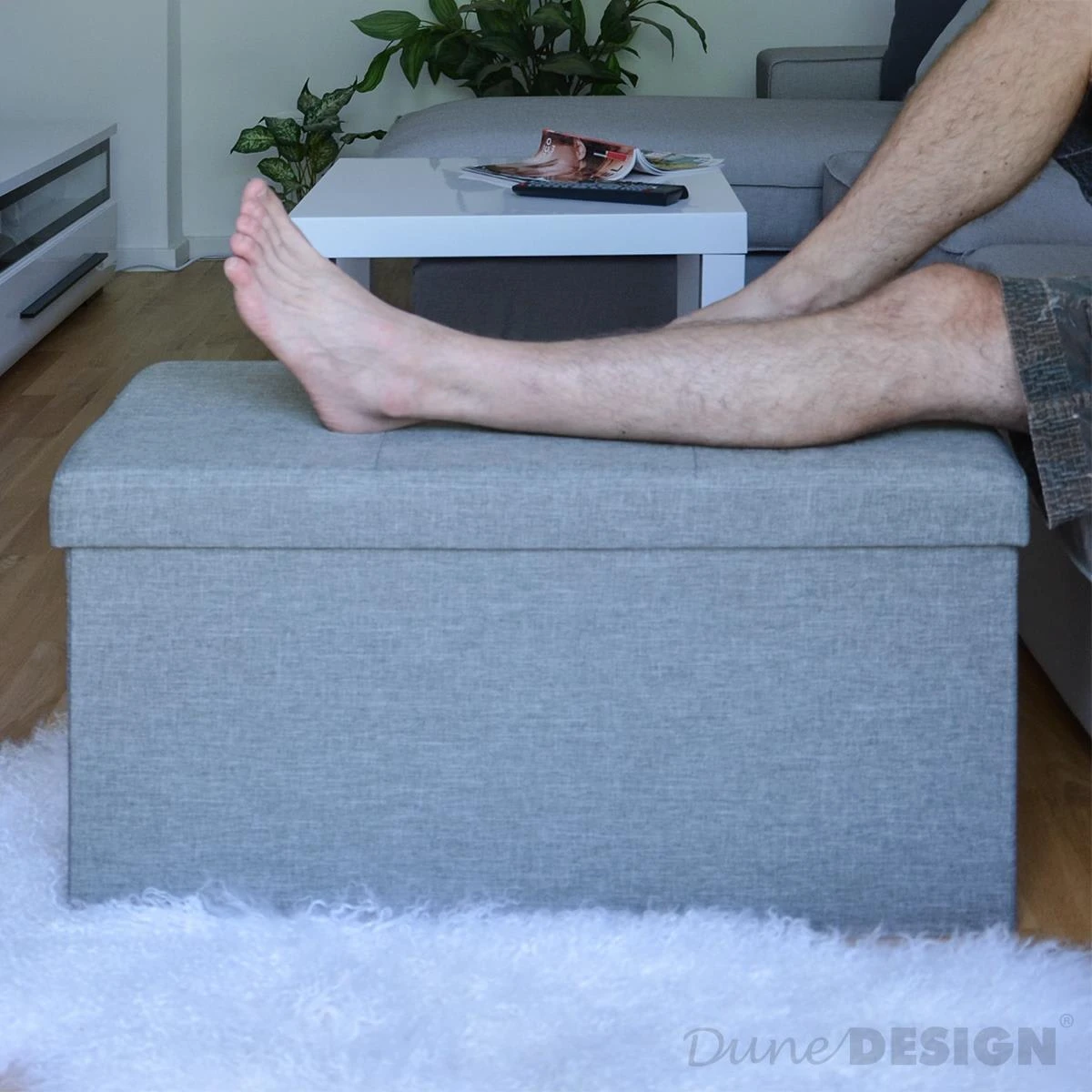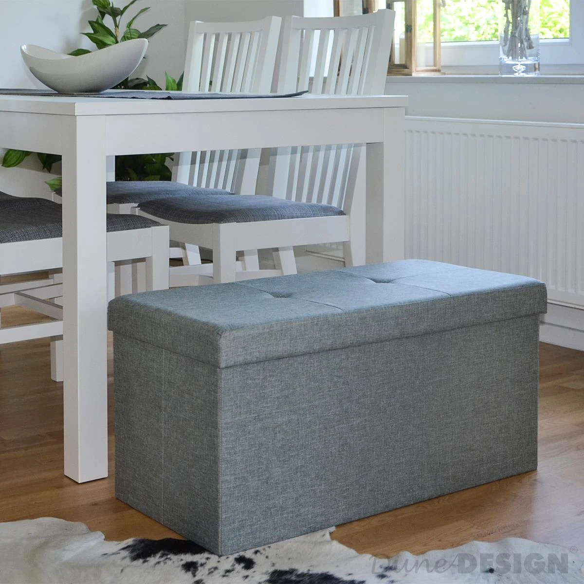 Der 2-Sitzer faltbare Bank mit verstellbarer Innen-Trennwand von DuneDesign ist mehr als eine Bank! Das schöne Möbelstück besticht nicht nur durch seine moderne, edle Leinen-Optik, die zu jedem Einrichtungsstil passt, sondern auch durch seine Doppel-Funktionalität. Die faltbare Truhe kann als bequeme Sitzgelegenheit für mehrere Personen, Fußablage, als kleiner Beistell- oder Nachtisch und natürlich als stauraum reiche Aufbewahrungskiste verwendet werden: Im Schlafzimmer vor dem Bett als Bettkasten, im Wohnzimmer vor der Couch als Fußhocker oder im Esszimmer als zusätzliche, attraktive, komfortable Sitzgelegenheit für Ihr Besuch. Egal ob Kinder oder Erwachsene – der Polstersitz ist bis 250 kg belastbar und hält viel aus. Auch im Kinderzimmer als große Spielzeugbox oder im Flur oder Diele als Schuhbank – die vielseitige Klapptruhe mit ca. 80 Liter Stauraum findet überall ihren Platz.
