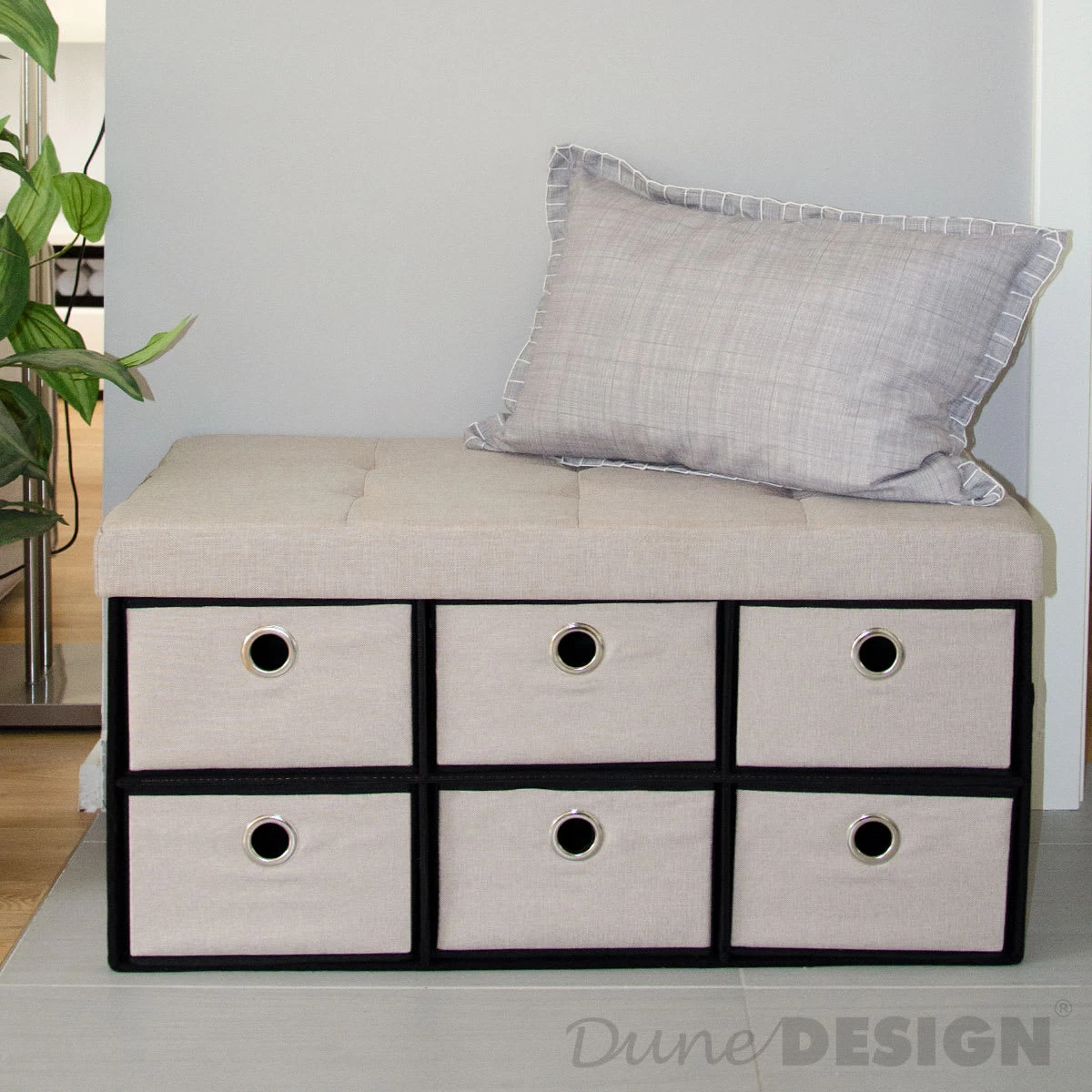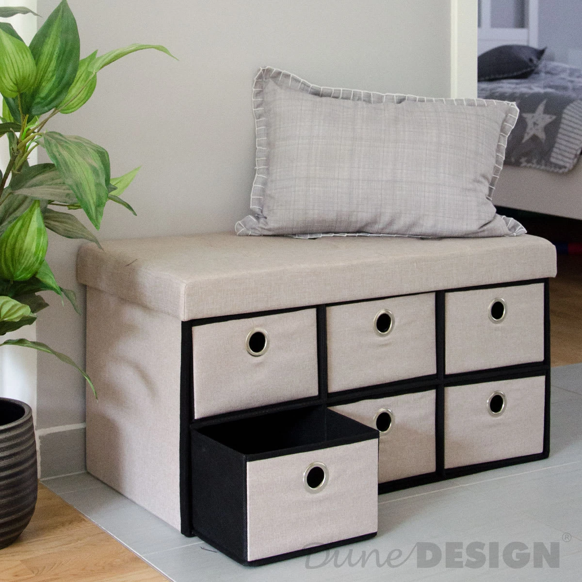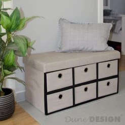 Der 2-Sitzer faltbare Bank mit Schubladen von DuneDesign ist mehr als eine Bank! Das schöne Möbelstück besticht nicht nur durch seine moderne, edle Leinen-Optik, die zu jedem Einrichtungsstil passt, sondern auch durch seine Doppel-Funktionalität. Die faltbare Truhe kann als bequeme Sitzgelegenheit für mehrere Personen, Fußablage, als kleiner Beistell- oder Nachtisch und natürlich als stauraumreiche Aufbewahrungskiste verwendet werden. Im Schlafzimmer vor dem Bett als Bettkommode, im Wohnzimmer vor der Couch als Fußhocker oder im Esszimmer als zusätzliche, attraktive Sitzgelegenheit für Ihr Besuch, im Kinderzimmer als große Spielzeugbox, im Flur oder Diele als Schuhbank – die vielseitige Klapptruhe findet überall ihren Platz.