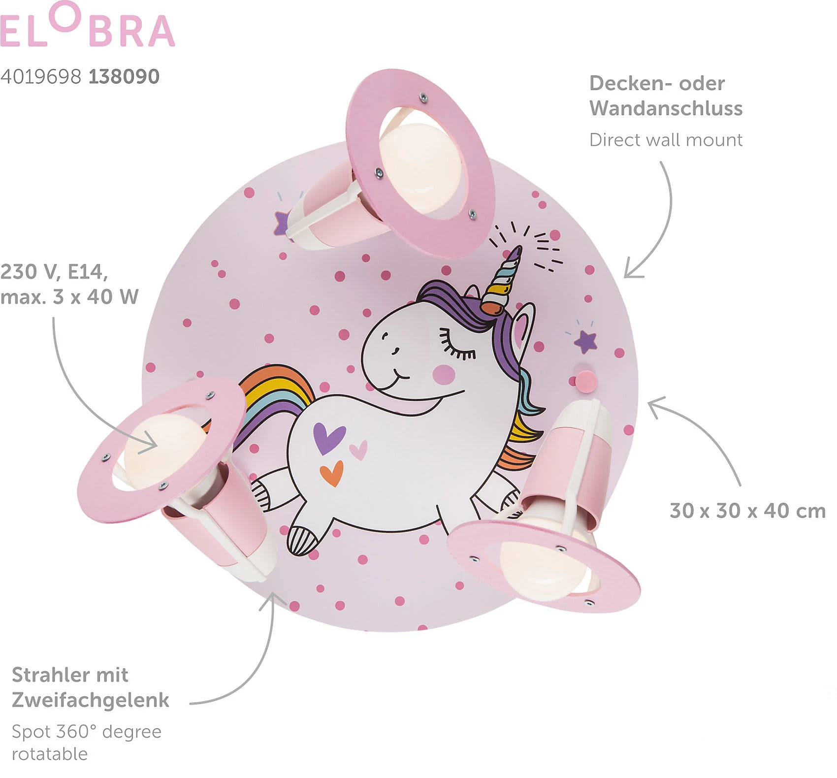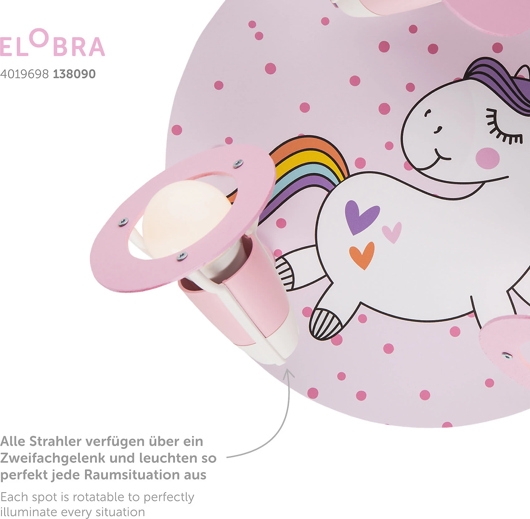 Die Elobra Deckenleuchte Rondell “Einhorn Babsy” kann an der Wand oder der Decke angebracht werden. Die Strahler mit Zweifachgelenk lassen sich beliebig drehen. So kann der Raum bestens ausgeleuchtet werden.