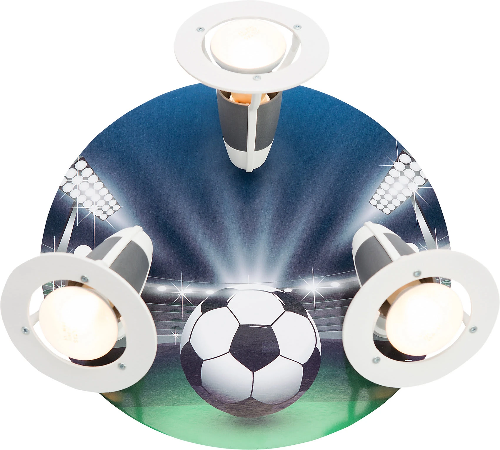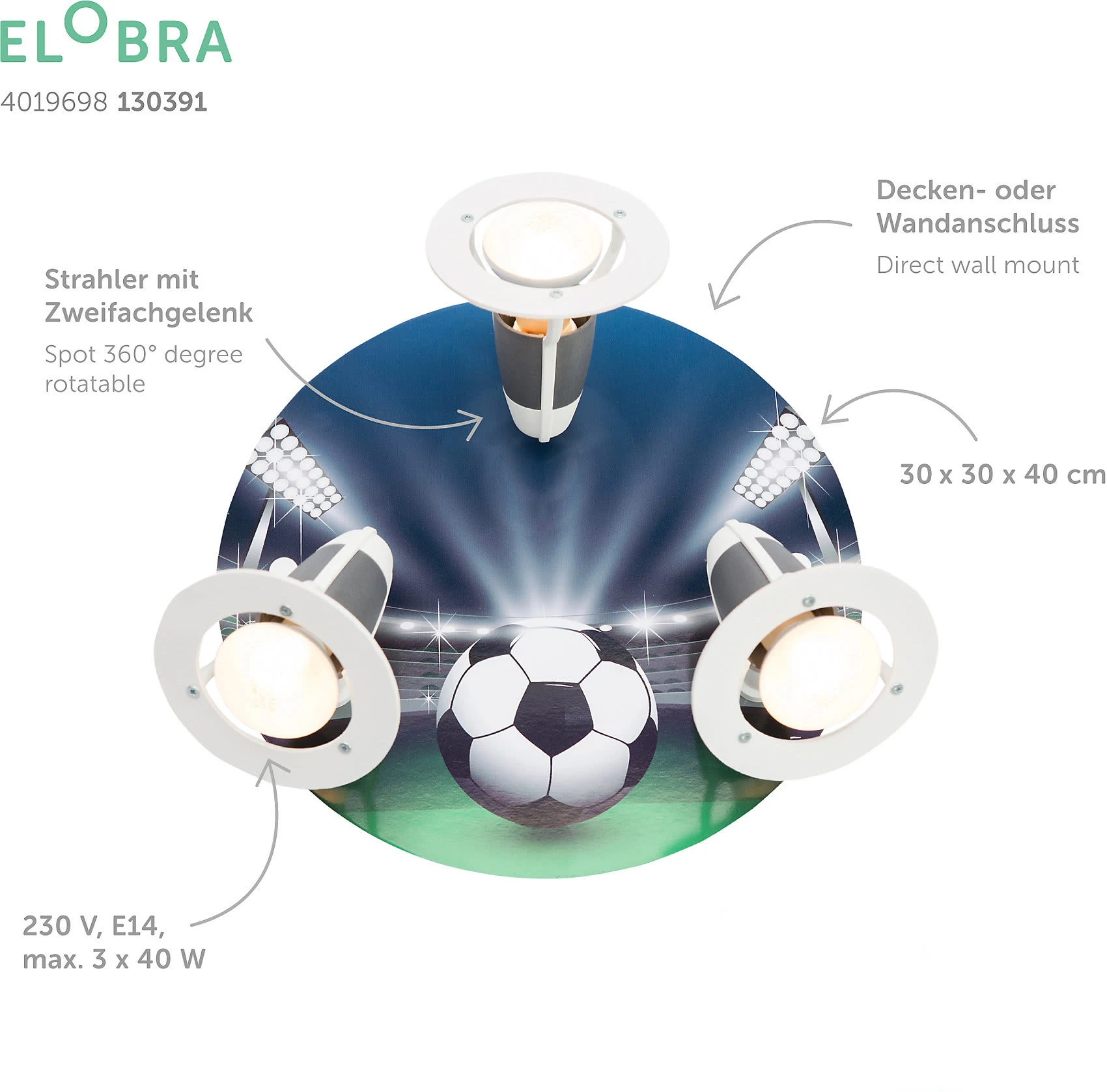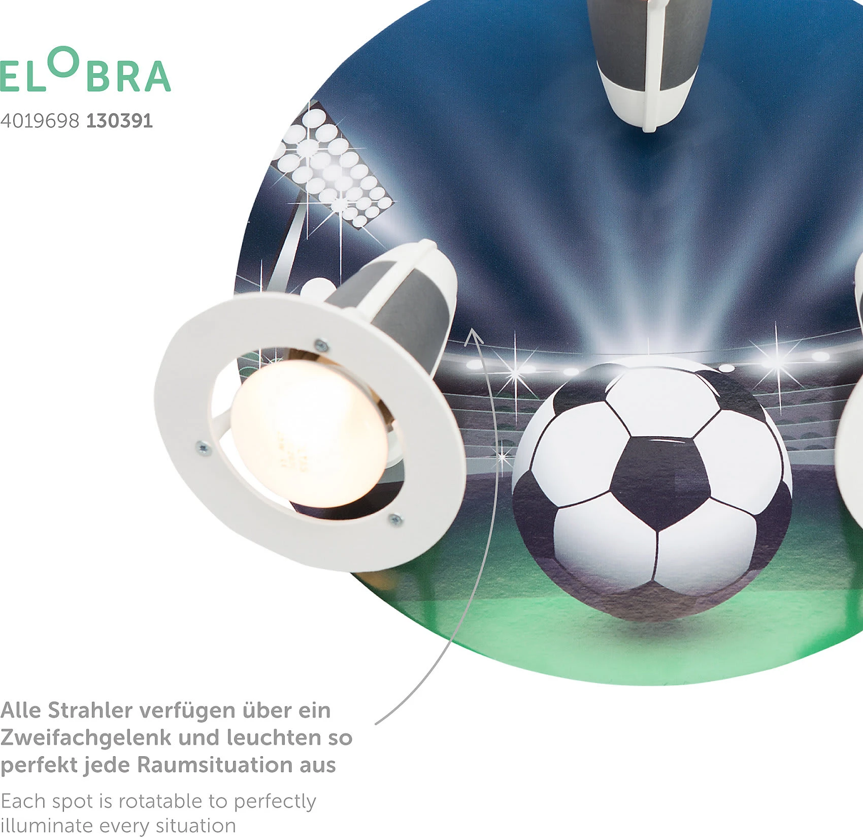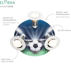 Die Elobra Deckenleuchte Rondell “Fußball Arena” kann an der Wand oder der Decke angebracht werden. Die Strahler mit Zweifachgelenk lassen sich beliebig drehen. So lässt sich der Raum bestens ausleuchten.