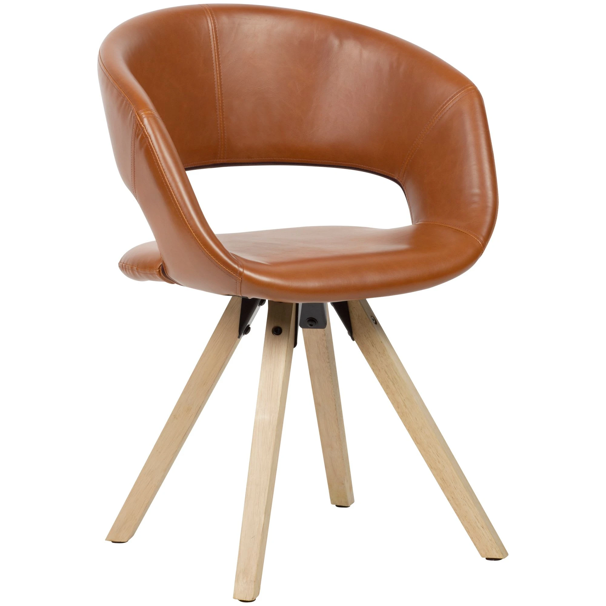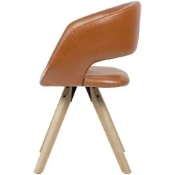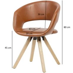 Design Trendiger Esszimmerstuhl im coolen Retro-Design Geschwungene & gepolsterte Sitzschale mit Rückenlehne Das massive Vierbeingestell rundet das Design gekonnt ab Abmessungen Breite: 56 cm Höhe: 80 cm Tiefe: 43 cm Sitzhöhe: 45 cm Sitzfläche (BxT): 39 x 43 cm Besonderheiten Filzgleiter an der Unterseite der Beine verhindern ein Quietschen oder Kratzen auf Ihrem Boden Die Sitzschale in Verbindung mit der üppigen Polsterung schafft längeren Genuss am Esstisch Empfohlene Maximalbelastbarkeit des Stuhls: 110 kg Das strapazierfähige, edle Kunstleder ist der optimale Gegensatz zum harten und hellen Holz Material Sitzschalenbezug: Kunstleder Beine: Hevea Massivholz Textilzusammensetzung Bezug Sitzschale: 100 % Polyurethan Lieferumfang Ein Esszimmerstuhl ohne Dekoration Montage Lieferzustand: teilmontiert, lediglich die Beine müssen angebracht werden. Pflegehinweise Kunstleder ist sehr pflegeleicht. Flüssigkeiten mit einem trockenen Küchentuch aufsaugen und anschließend vorsichtig mit einem weichen, angefeuchtetem Tuch die Rückstände entfernen.
