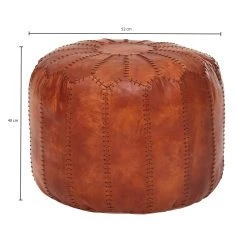 Design Runder Sitzhocker in orientalischem Design Sichtbare und dicke Stoßnähte Üppige Polsterung für ein angenehmes Sitzgefühl Abmessungen Breite: 52 cm Höhe: 40 cm Tiefe: 52 cm Farbe Kompletter Sitzhocker: Braun Besonderheiten In liebevoller Handarbeit gefertigt – jedes Stück ein Unikat Hochwertiges und strapazierfähiges Echtleder für eine lange Lebensdauer Die Oberfläche bekommt, dank der positiven Eigenschaft des Echtleders, mit der Zeit einen angesagten Used-Look Empfohlene Maximalbelastbarkeit: 130 kg Material Sitzflächenbezug: Ziegenleder Hockerunterseite: Stoff Nähte: Mischgewebe Textilzusammensetzung Bezug des Sitzhockers: 100% Echtleder Sitzunterseite: 100% Leinen Nähte: 50% Baumwolle, 50% Nylon Lieferumfang Ein Sitzhocker ohne Dekoration Montage Lieferzustand: Montiert Pflegehinweise Die Oberfläche mit einem lauwarmen & angefeuchteten Baumwolltuch reinigen. Kein Scheuermittel, scharfe Reinigungsmittel oder tropfnasse Tücher verwenden. Zweimal pro Jahr sollten Sie das Leder mit einer Lederpflege bearbeiten, damit die elastische Eigenschaft des Leders beibehalten wird.