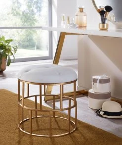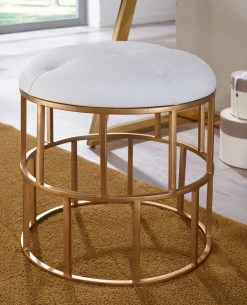 Design Stylischer Polsterhocker in modernem Design Hocker mit offen gestaltetem Gestell und dickem Polster Harmonische Farbkombination aus Weiß & Gold Stilvolles Chesterfieldmuster auf der Sitzfläche Abmessungen Breite: 44 cm Höhe: 48 cm Tiefe: 44 cm Sitzfläche (BxT): 44 x 44 cm Sitzhöhe: 48 cm Höhe des Sitzpolsters: ca. 8,5 cm Weitere Abmessungen finden Sie im Maßbild Farbe Sitzfläche: Weiß Gestell: Golden Besonderheiten Üppige Sitzfläche bietet einen angenehmen Sitzkomfort Dank der schlanken und kompakten Form lässt sich der Hocker in jedem Raum platzieren Jeder Sitzhocker wurde liebevoll von Hand hergestellt und ist daher ein Unikat Anti-Rutsch-Noppen am Gestell schützen Ihren Fußboden vor Kratzern Fester und stabiler Stand dank des robusten Metallgestells Empfohlene Maximalbelastbarkeit: 120 kg Material Sitzfläche: Samt Gestell: lackiertes Eisen Textilzusammensetzung Sitzflächenbezug: 95% Polyester, 5% Baumwolle Lieferumfang Eine Polsterhocker ohne Dekoration Montage Lieferzustand: komplett montiert und sicher verpackt Pflegehinweise Die Oberfläche mit einem lauwarm angefeuchteten Baumwolltuch reinigen. Kein Scheuermittel, scharfe Reinigungsmittel oder tropfnasse Tücher verwenden.