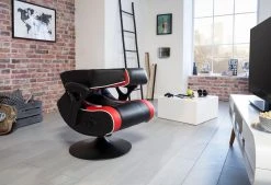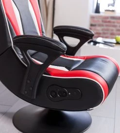 Design Bequem gepolstert für hervorragenden Sitzkomfort 1 Subwoofer (4 W) mit integriertem Lautsprecher (2 W) auf der Rückseite Zwei weitere Lautsprecher (5 W) rechts und links an den Kopfseiten unter dem perforiertem Stoff Kopf – bzw. Nackenstütze bereits integriert Kompletter Stuhl im Racing Design mit schönem Muster Formschöner Trompetenstandfuß aus Metall Armlehnen mit bequemer Polsterung Bluetooth Verbindung Verbinden Sie Ihr Smartphone oder andere Audio Geräte ganz einfach via Bluetooth mit dem Soundchair Farbe Armlehnen, Bedienfeld & Lautsprecher: Schwarz Subwoofer: Schwarz Armlehnenbezug: Schwarz Besonderheiten Gaming Sessel ist zusammenklappbar Musiksessel ist um 360° drehbar Audioeingang erfolgt über 3,5 mm Klinke Lautstärke und Bass separat einstellbar Soundstuhl ist auch ohne Sound ein bequemer Sessel Abmessungen Höhe: 113 cm Breite: 65 cm Tiefe: 76 cm Sitzflächenbreite: 52 cm Sitzflächentiefe: 52 cm Sitzhöhe: 44 cm Armlehnenhöhe (vom Sitz aus): 20 cm Material Kunstleder Textilzusammensetzung Bezug: 100% Polyurethan Lieferumfang 1 Musik-Chair 1 Netzteil AC 100 – 240V 2 Cinch-Stereo-Adapter 1 Klinkenstecker 3,5 mm auf Cinch-Stereo Audio-Kabel 1 Klinkenstecker 3,5 mm (M) auf Cinch-Stereo (W) Audio-Kabel 1 Klinkenstecker 3,5 mm Audio-Kabel