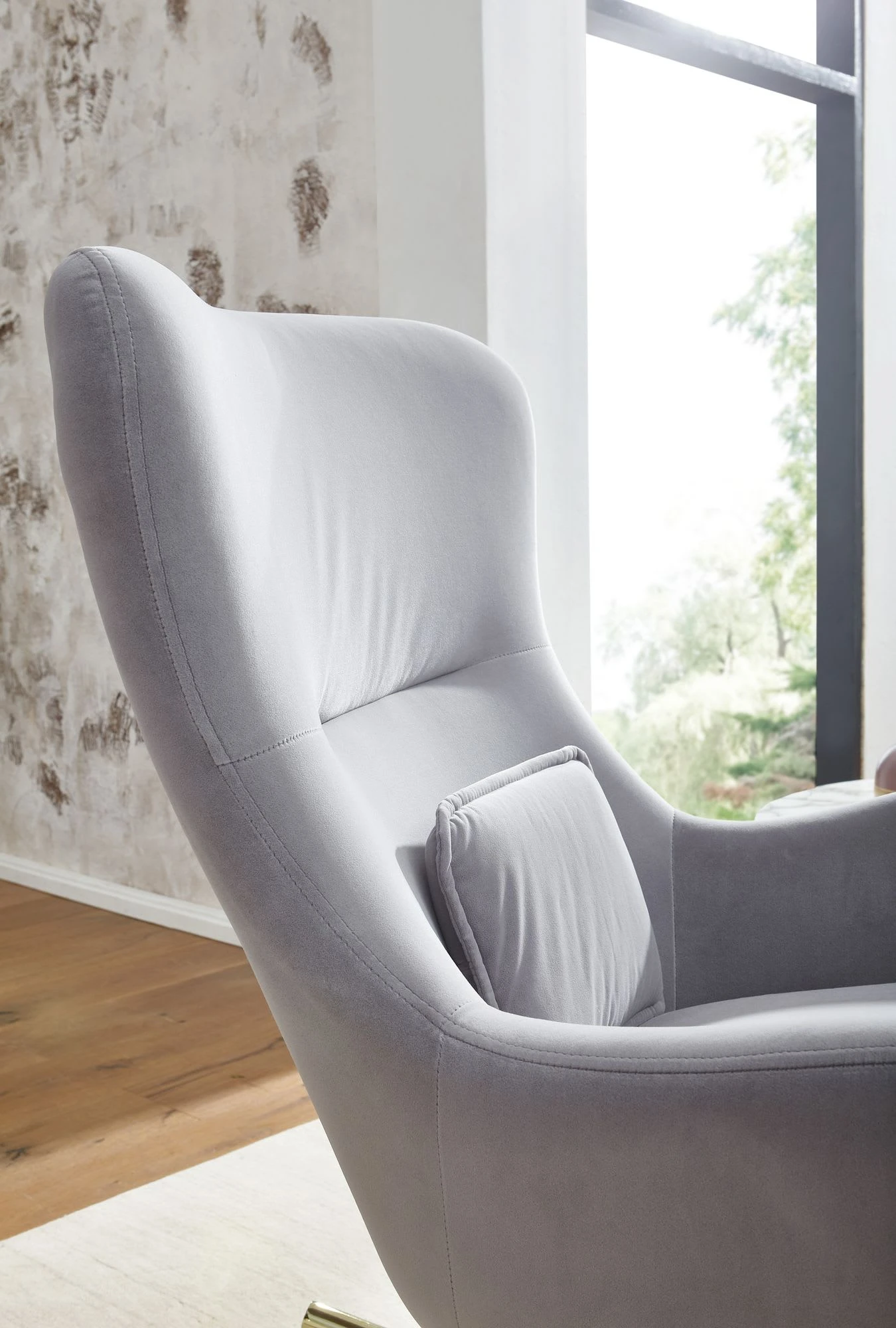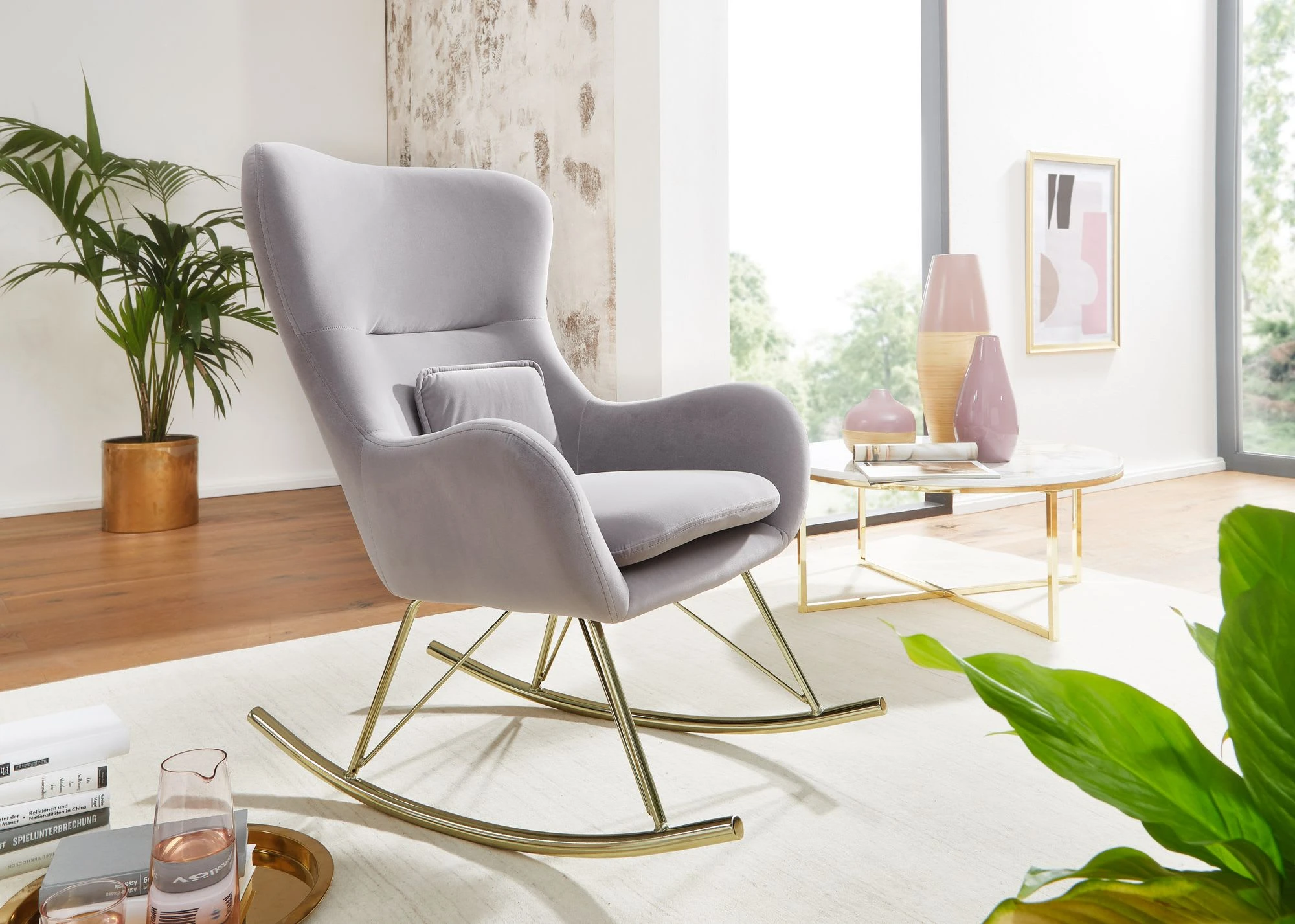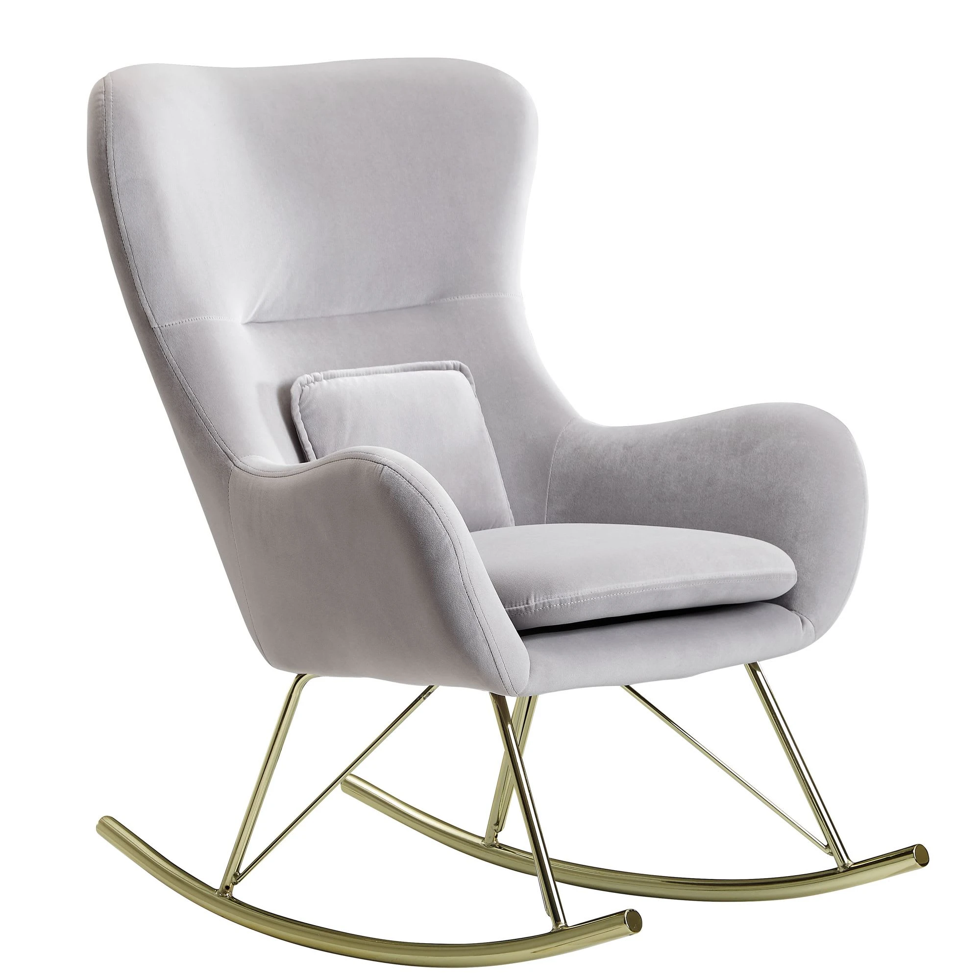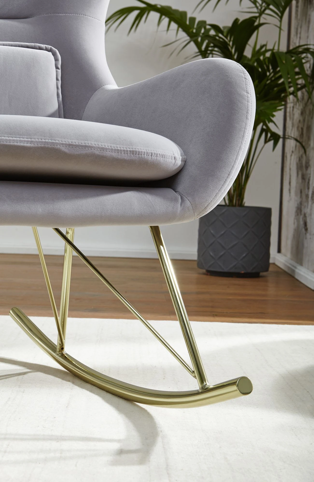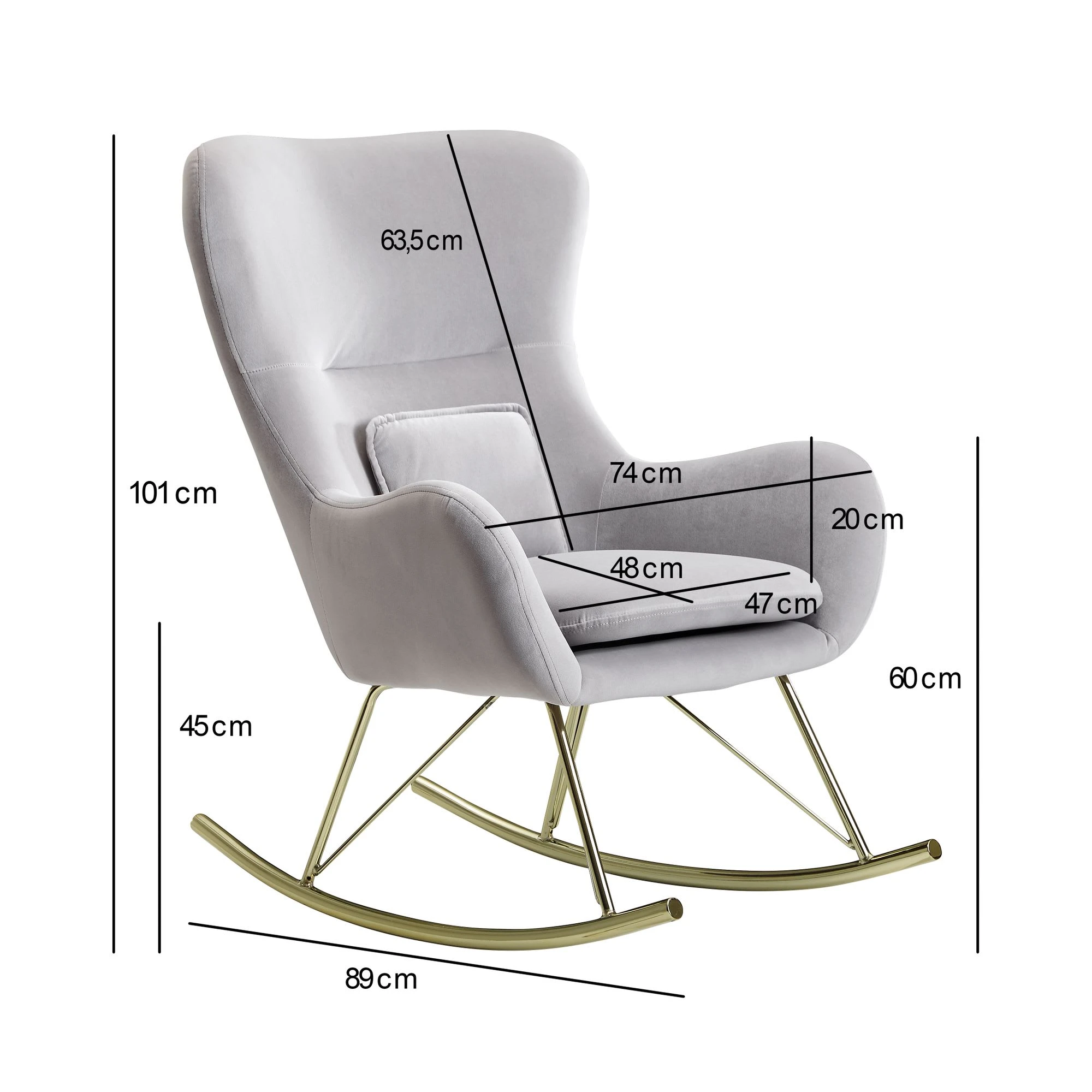 Design Gemütlicher Schaukelstuhl in modernem Design Extra weiche Sitzschale für gemütliche Stunden Wippfunktion aufgrund der gebogenen Kufen Abmessungen Breite: 74 cm Höhe: 101 cm Tiefe: 89 cm Sitzfläche (BxT): 47 x 48 cm Sitzhöhe: 45 cm Höhe Rückenlehne: 63,5 cm Kissen (BxH): 30 x 24 cm Maximalbelastbarkeit: 120 kg Besonderheiten Durch zwei verborgene Klettstreifen ist die Sitzpolsterung abnehmbar Das mitgelieferte Kissen lässt sich nach Belieben einsetzen, da es nicht fest mit dem Sitz verbunden ist Erhöhte Seitenflanken für ein angenehmes Sitzgefühl Aufgrund der hohen Rückenlehne lässt sich Ihr Kopf bequem anlehnen Filzstreifen für die Beine verhindern Kratzer im Fußboden und dem Metall Material Sitzschale: Samt Untergestell: lackiertes Eisen Textilzusammensetzung Bezug: 100% Polyester Lieferumfang Ein Schaukelstuhl ohne Dekoration Montage Lieferung erfolgt zerlegt Leicht verständliche Aufbauanleitung wird mitgeliefert Pflegehinweise Wir empfehlen, frisch entstandene Flecken sofort mit einem Tuch abzutupfen. Bei einer Behandlung mit Natron kann das trockene Pulver einfach auf die betroffene Stelle aufgetragen werden. Bitte über Nacht einwirken lassen und am nächsten Tag das Natron mit einem Staubsauger absaugen.