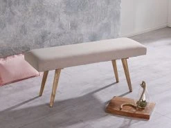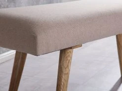 Design Kultige Sitzbank im modern interpretierten Retro-Style Stimmiger Materialmix aus Massivholz und Baumwolle Üppige Polsterung für ein angenehmes Sitzgefühl Abmessungen Breite: 117 cm Höhe: 51 cm Tiefe: 38 cm Polsterhöhe: 12 cm Durchmesser Beine (oben): 6 cm Durchmesser Beine (unten): 3 cm Abstand Boden bis Bankunterseite: 39 cm Farbe Sitzfläche: Beige Beine: Massivholz Mango – mit Klarlack beschichtet Beide Materialien können farblich vom Bild leicht abweichen, da es sich um Naturprodukte handelt Besonderheiten Fester und stabiler Stand dank der robusten Massivholzbeine Sehr weiche Polsterung sorgt für ein angenehmes Sitzgefühl Hochwertiger & strapazierfähiger Sitzbezug aus Stoff Anti-Rutsch-Noppen an den Fußenden, schützen Ihren Fußboden vor Kratzern In liebevoller Handarbeit gefertigt – daher ist jedes Stück ein Unikat Material Sitzflächenbezug: Stoff Beine: Massivholz Mango Materialzusammensetzung Sitzflächenbezug: 100% Baumwolle Lieferumfang 1 Esszimmerbank ohne Dekoration Montage Lieferzustand: teilmontiert – lediglich die Beine müssen angebracht werden Pflegehinweise Die Oberfläche des Holzes mit einem lauwarm angefeuchteten Baumwolltuch reinigen. Empfehlung für die Baumwolle: einen milden Polsterreiniger verwenden, um Flecken zu entfernen. Keine Scheuermittel, scharfen Reinigungsmittel oder tropfnassen Tücher verwenden.