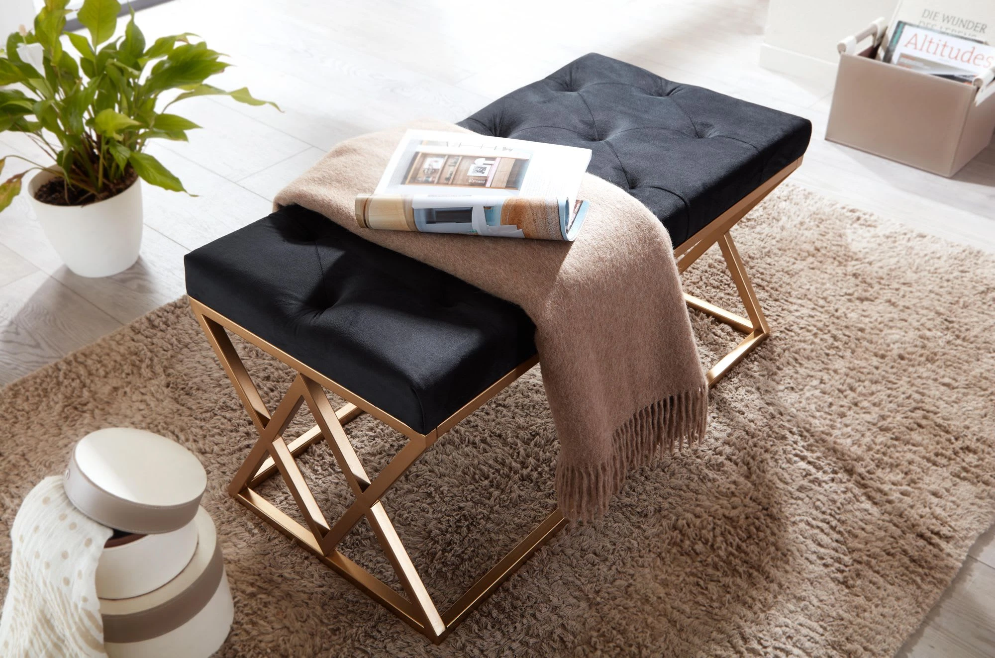 Design Stylische Polsterbank in modernem Design Sitzbank mit goldfarbenem Gestell und dickem Polster Stilvolles Chesterfieldmuster auf der Sitzfläche Abmessungen Breite: 90 cm Höhe: 46 cm Tiefe: 44 cm Sitzfläche (BxT): 90 x 44 cm Sitzhöhe: 46 cm Höhe des Sitzpolsters: ca. 7 cm Weitere Abmessungen finden Sie im Maßbild Farbe Sitzfläche: Schwarz Gestell: Golden Besonderheiten Üppige und breite Sitzfläche bietet einen angenehmen Sitzkomfort Dank der schlanken und kompakten Form lässt sich die Bank in jedem Raum platzieren Jede Bank wurde liebevoll von Hand hergestellt und ist daher ein Unikat Anti-Rutsch-Noppen an den Füßen schützen Ihren Fußboden vor Kratzern Fester und stabiler Stand dank des robusten Metallgestells Empfohlene Maximalbelastbarkeit: 220 kg Material Sitzfläche: Samt Gestell: lackierter Edelstahl Textilzusammensetzung Sitzflächenbezug: 95% Polyester, 5% Baumwolle Lieferumfang Eine Sitzbank ohne Dekoration Montageanleitung und -material liegen der Lieferung bei Montage Lieferzustand: demontiert und sicher verpackt Pflegehinweise Die Oberfläche mit einem lauwarm angefeuchteten Baumwolltuch reinigen. Kein Scheuermittel, scharfe Reinigungsmittel oder tropfnasse Tücher verwenden.