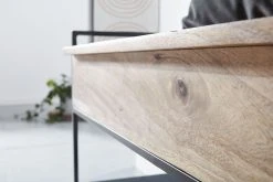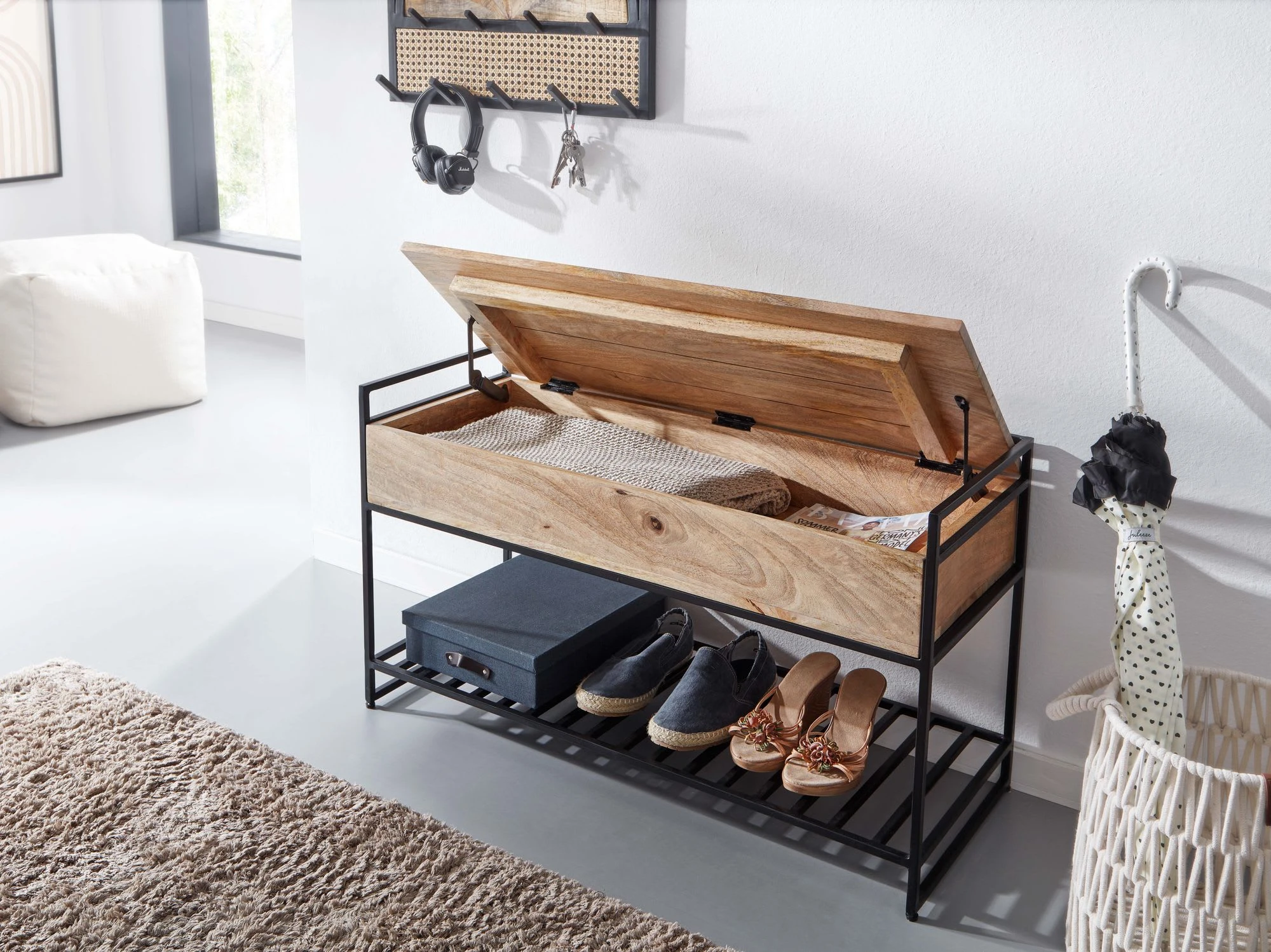 Design Kleine Sitzbank in modernem Design Stimmiger Materialmix aus Massivholz und Metall Praktische Ablage für Schuhe unterhalb der Sitzfläche Abmessungen Breite: 90 cm Höhe: 52 cm Tiefe: 38 cm Sitzhöhe: 48 cm Sitzfläche (BxT): 87 x 38 cm Innenabmessungen Staufach (BxHxT): 83 x 12 x 30 cm Weitere Abmessungen finden Sie im Maßbild Besonderheiten Jede Sitzbank wurde in liebevoller Handarbeit gefertigt und ist somit ein absolutes Unikat Fester und stabiler Stand dank des robusten Metallgestells Anti-Rutsch-Noppen an den Fußenden schützen Ihren Fußboden und das Metall vor unschönen Kratzern Zusätzlichen Stauraum bietet das Fach unter der hochklappbaren Sitzfläche Empfohlene max. Belastbarkeit: 200 kg Hinweis: Die Sitzfläche bleibt nur in dem Winkel geöffnet, der auf den Fotos zu sehen ist Material Sitzfläche und Staufach: Mango Massivholz Rahmen und Schuhablage: pulverbeschichtetes Eisen Lieferumfang Eine Sitzbank ohne Dekoration Montage Lieferzustand: komplett montiert und sicher verpackt Pflegehinweise Die Oberfläche mit einem lauwarm angefeuchteten Baumwolltuch reinigen. Keine Scheuermittel, scharfe Reinigungsmittel oder tropfnasse Tücher verwenden.
