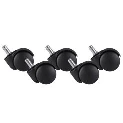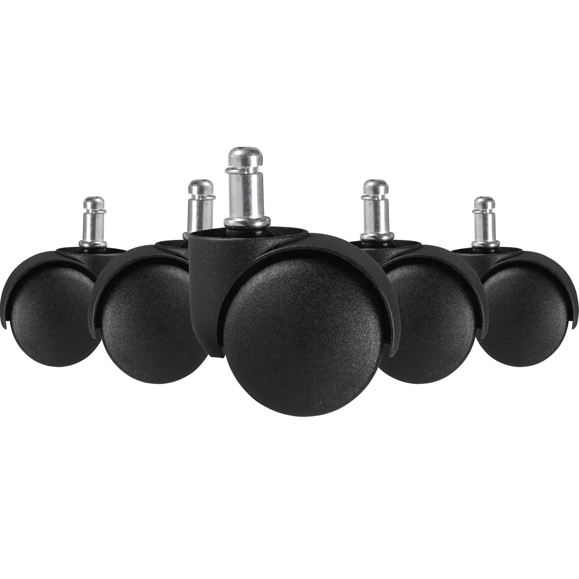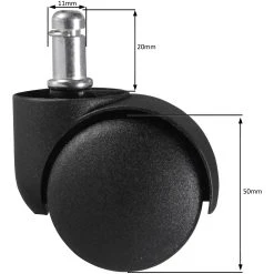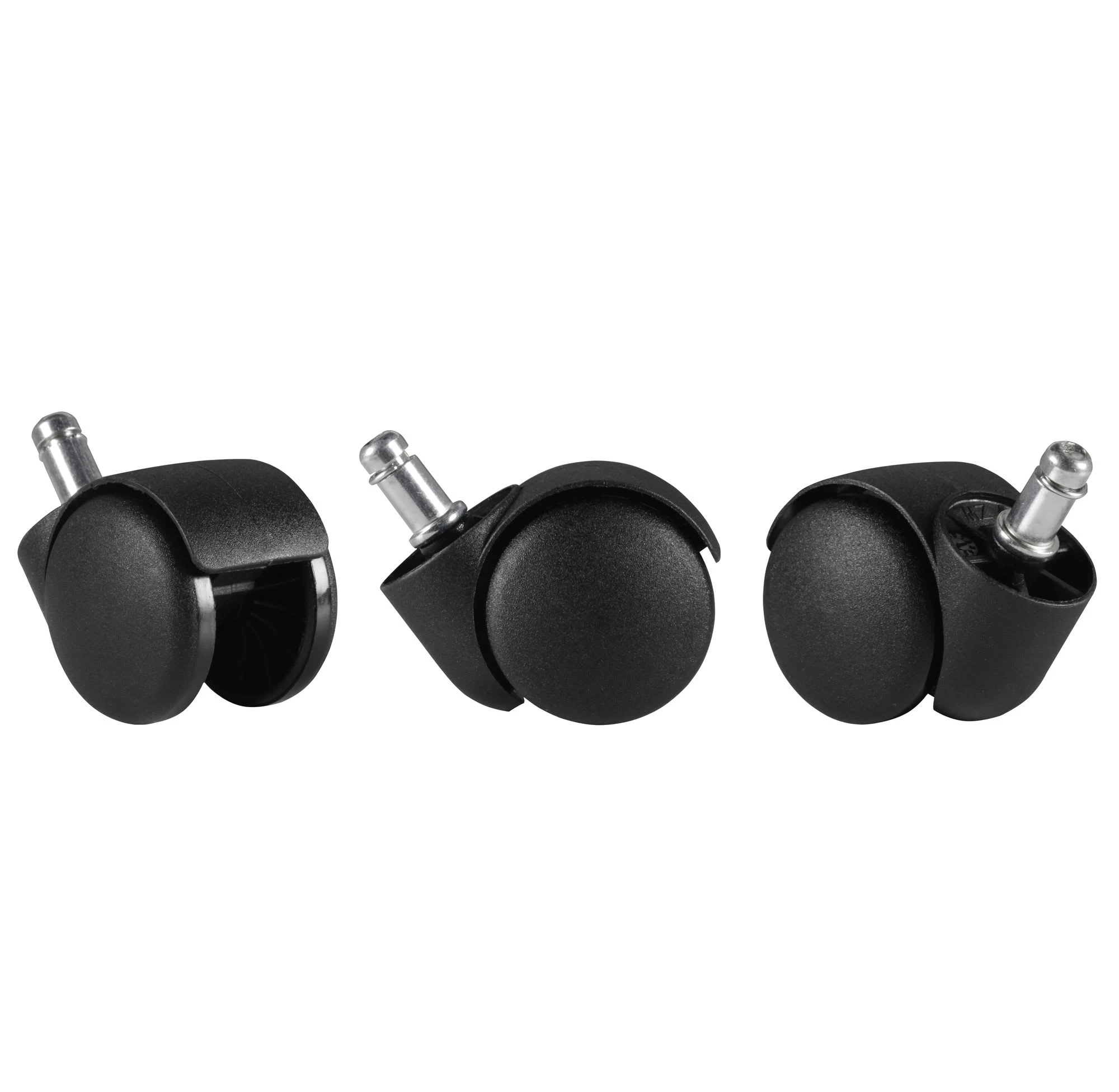 Design Teppichbodenrollen für Bürostühle (5er Set) Hochwertiger Kunststoff Farbe Schwarz Besonderheiten Durchmesser PIN 11mm Stiftlänge: 20 mm Rollendurchmesser 50 mm Geeignet für Bürostühle mit 11mm PIN (Durchmesser des Metallstiftes) ungebremste Laufrollen Geeignet für Teppichboden Filzboden Material 100% Polyurethan Lieferumfang 5 Rollen Ohne Dekoration