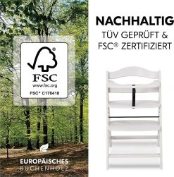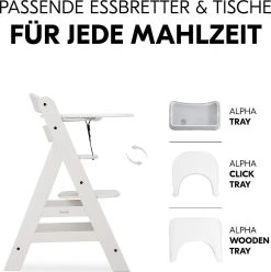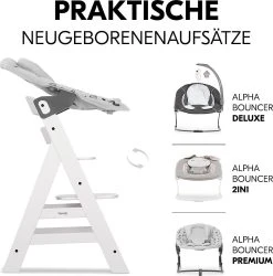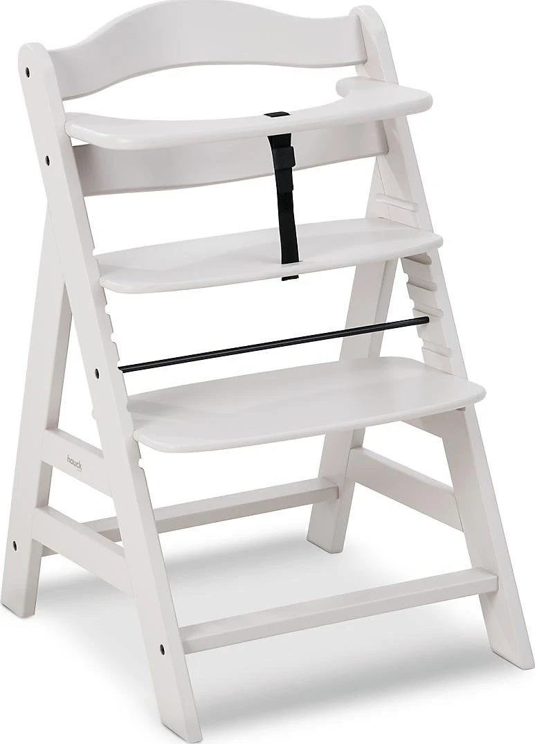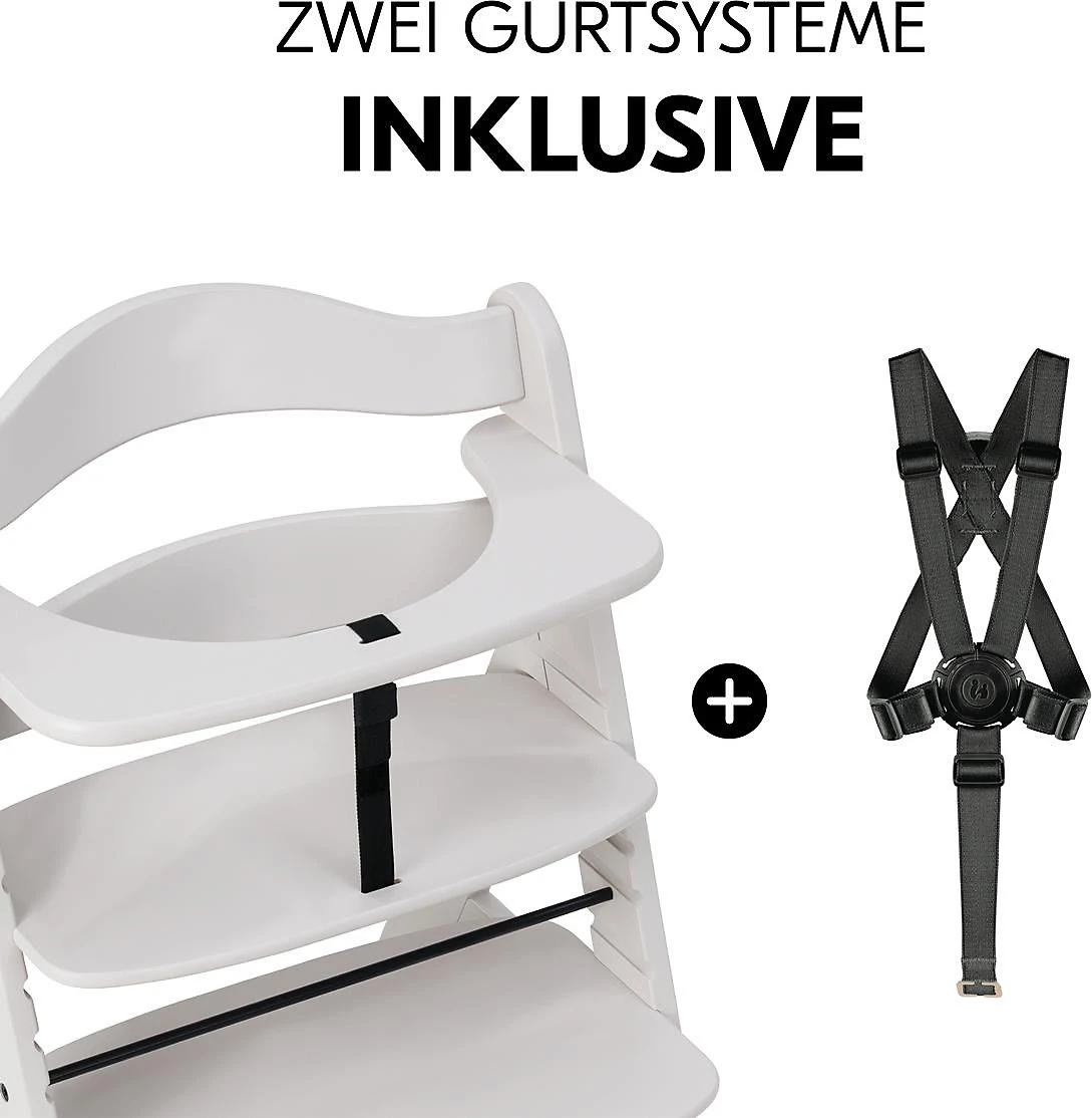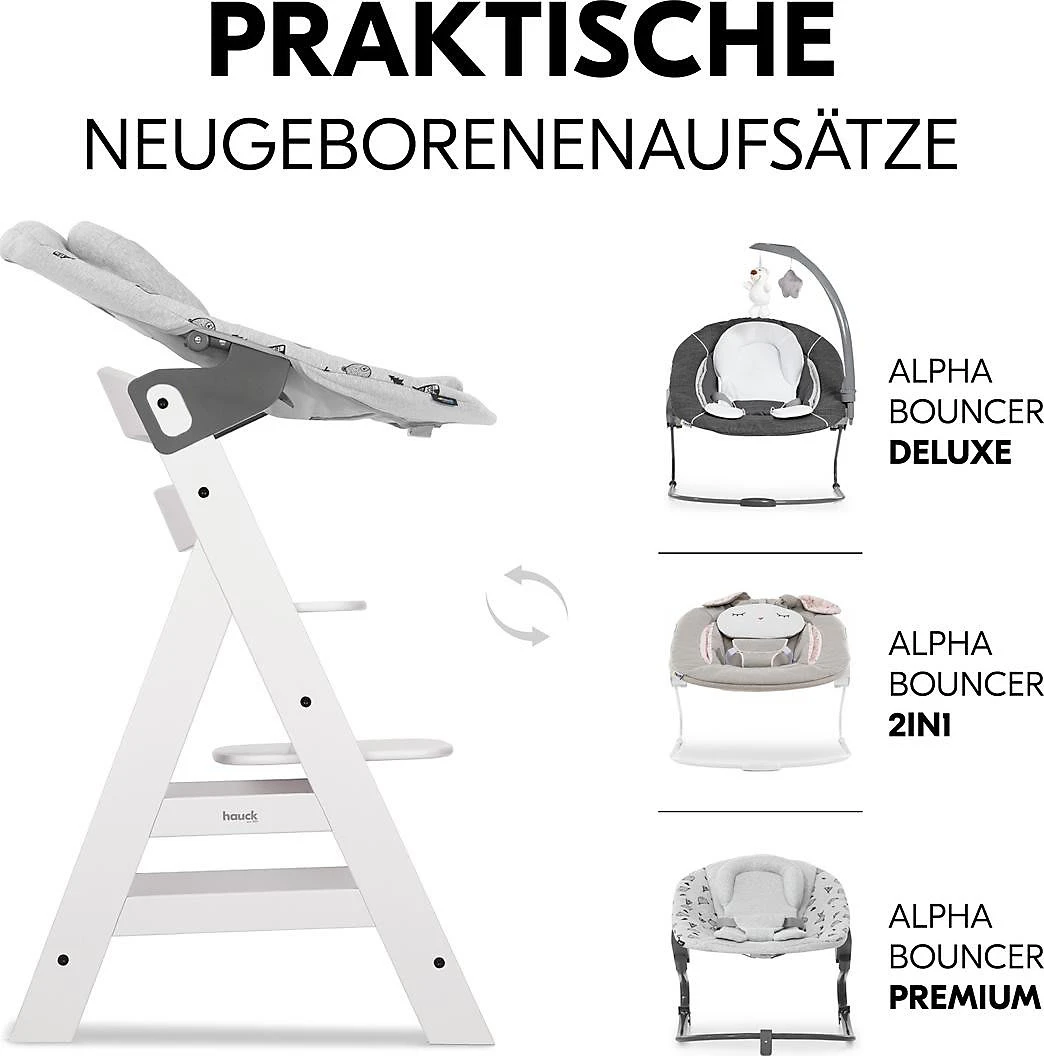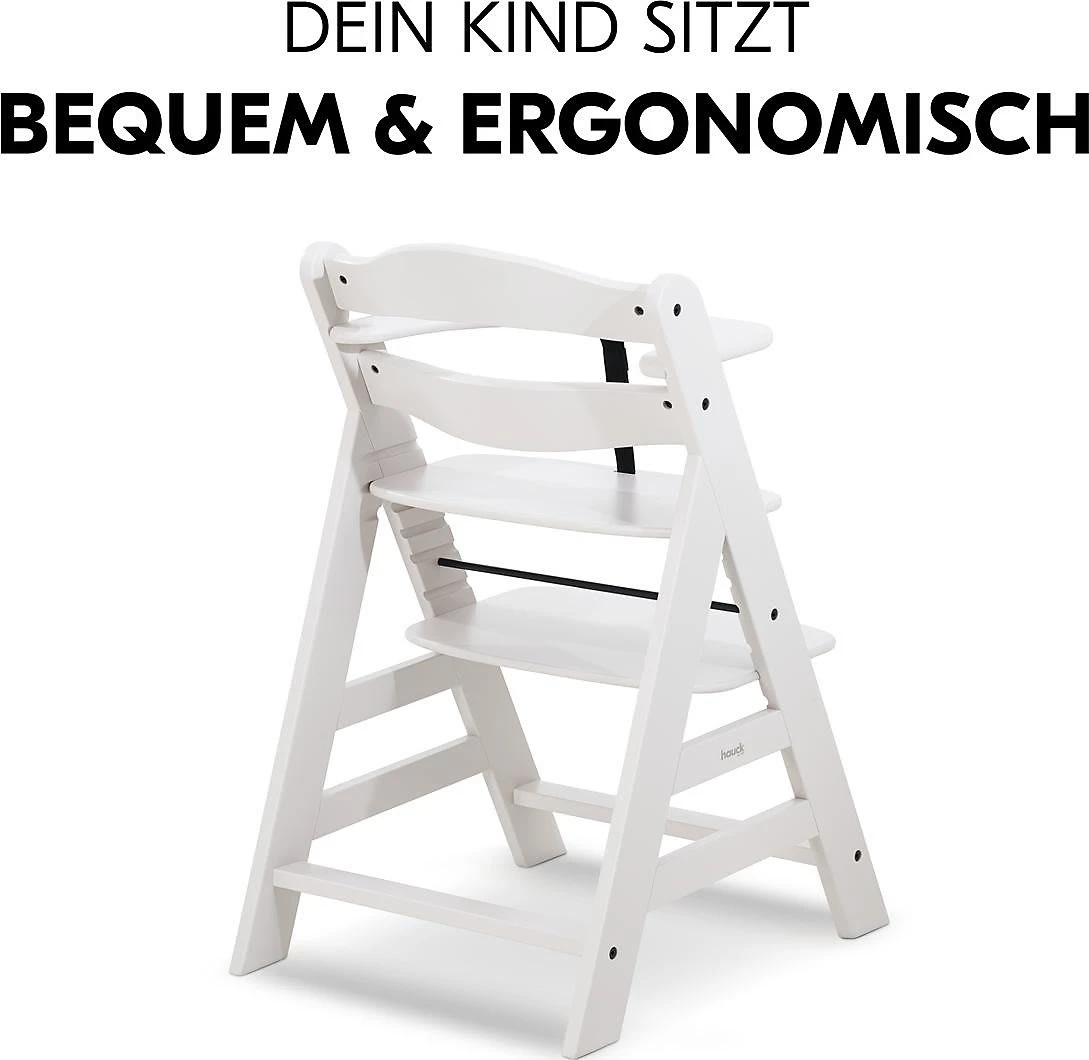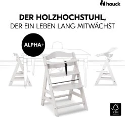 So sitzt Ihr Nachwuchs sicher mit am Tisch – mit Alpha Plus, dem Hochstuhl, der mitwächst. Fußstütze und Sitzplatte sind in Höhe und Tiefe verstellbar, wodurch der Hochstuhl vom 6. Monat bis etwa zum 12. Lebensjahr genutzt werden kann. Danach kann er zu einem richtigen Stuhl umgebaut werden. Als Hochstuhl liegt die maximale Belastbarkeit bei etwa 15 kg. Die Seitenteile sind aus Massivholz, Sitz- und Fußteil aus Verbundplatten. Der Hochstuhl besteht aus nachhaltiger Buche, wodurch Sie beim Kauf kein schlechtes Gewissen haben müssen. Auch um die Sicherheit Ihres Lieblings müssen Sie sich nicht sorgen: Ein Vorderbügel, 5-Punkt-Gurt und ein Schrittgurt wiegen Ihr Kind in Sicherheit. Mit dem separat erhältlichen Alpha Bouncer lässt sich der Alpha Plus im Handumdrehen in eine Wippe umfunktionieren.