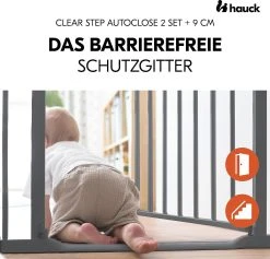 Mit dem Türschutzgitter Clear Step Autoclose 2 von hauck können Türen und Treppen kindersicher gestaltet werden. Der sehr flache Durchgang ermöglicht ein stolperfreies Hindurchgehen. Durch den Magnetverschluss schließt das Gitter anschließend automatisch, egal, in welchem Winkel es losgelassen wird. Der zusätzliche Stopper ermöglicht es, die Tür in eine Richtung zu sperren.