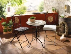 schwarz lackiertes Metall, aufwändig gearbeitet, Lehneneinsatz aus schwerem Steinmosaik, Belastbarkeit ca. 100 kg