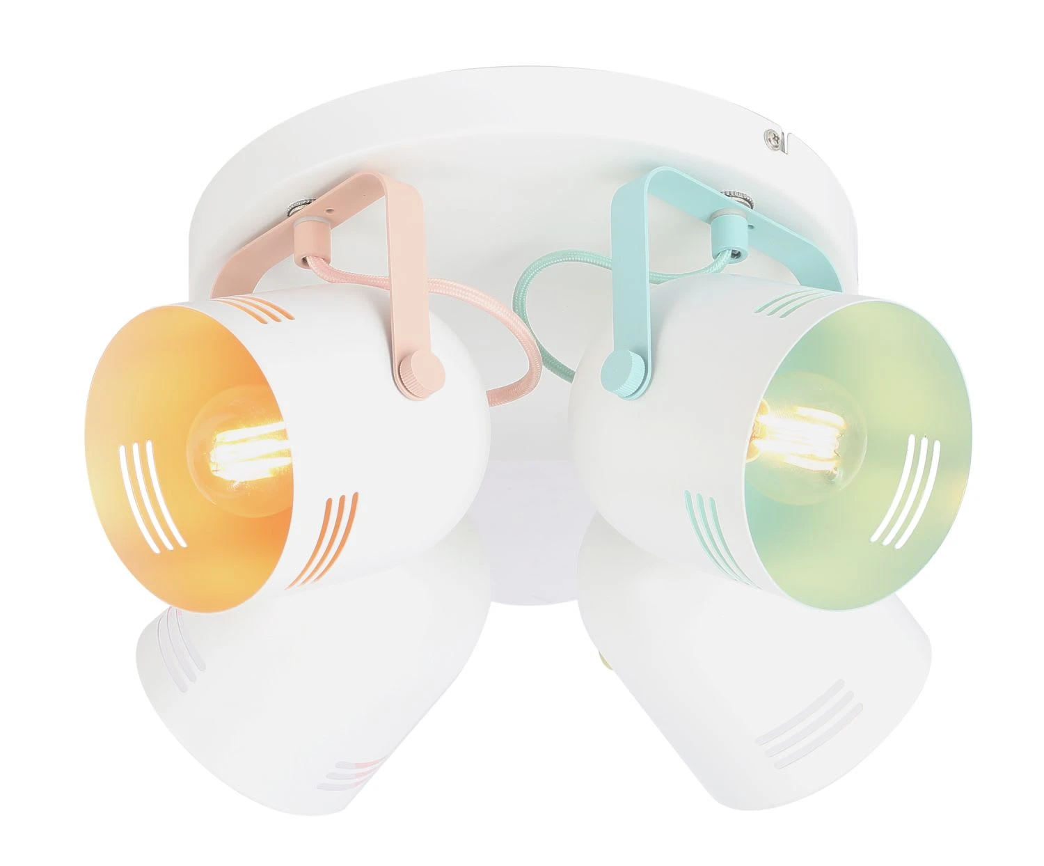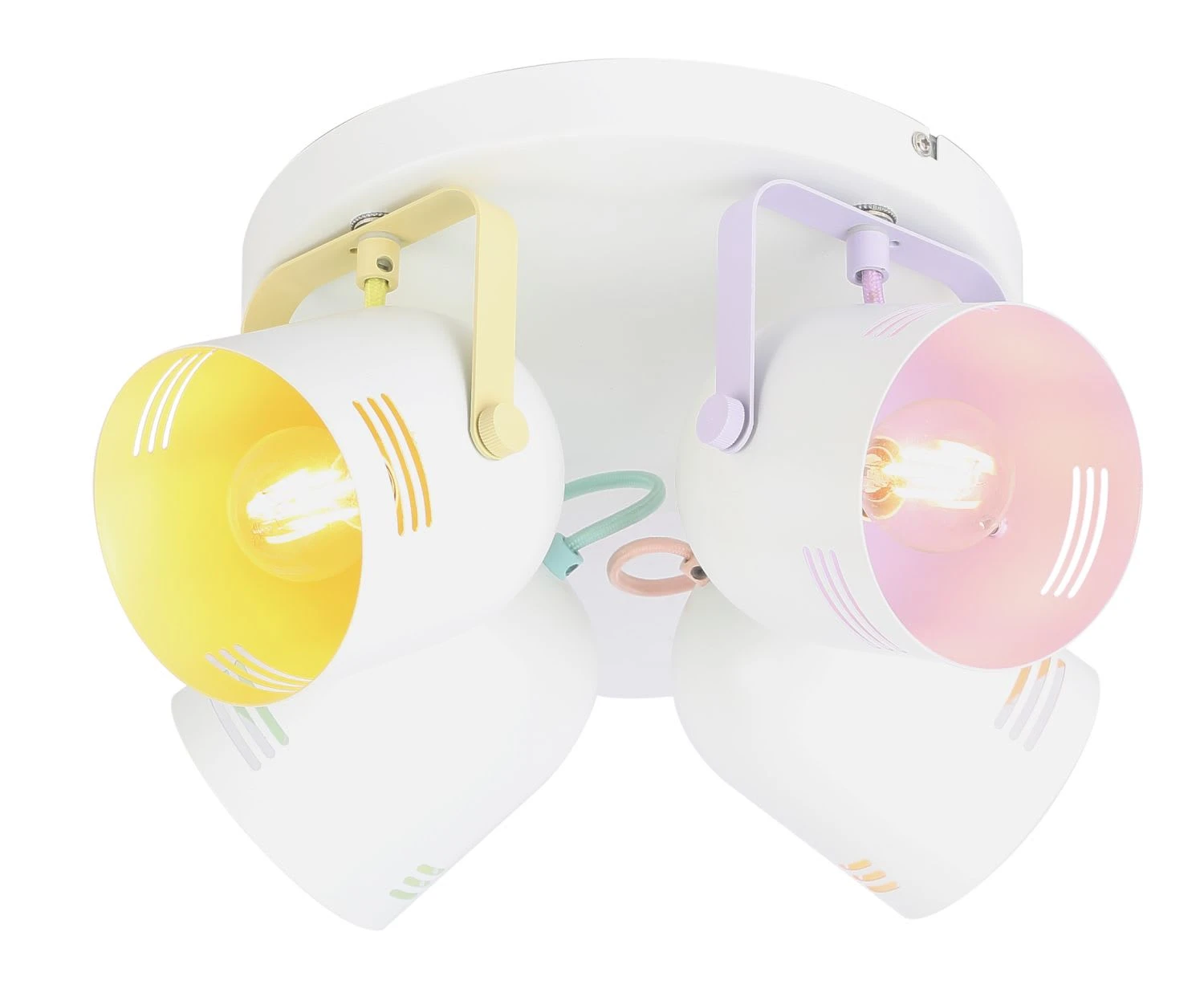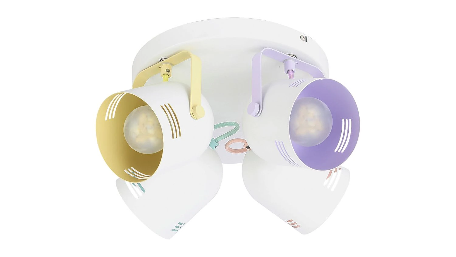 Fassung: 4x E14 bis 40W | Farbe: Weiß, Gelb, Lila | Material: Metall | Spannung: 230V | Spritzschutzklasse:IP20 | Bunte Deckenleuchte aus Metall für Kinder | Kinderlampe mit individuell verstellbaren Leuchtkörpern | Besonders dekorativ dank unterschiedlichen Innenseiten der Leuchtkörper | Für jedes Kinderzimmer von Jungen und Mädchen geeignet | Helligkeit und Lichtfarbe können durch selbst gewähltes Leuchtmittel der Fassung E14 beeinflusst werden – auch LED | nicht inklusive