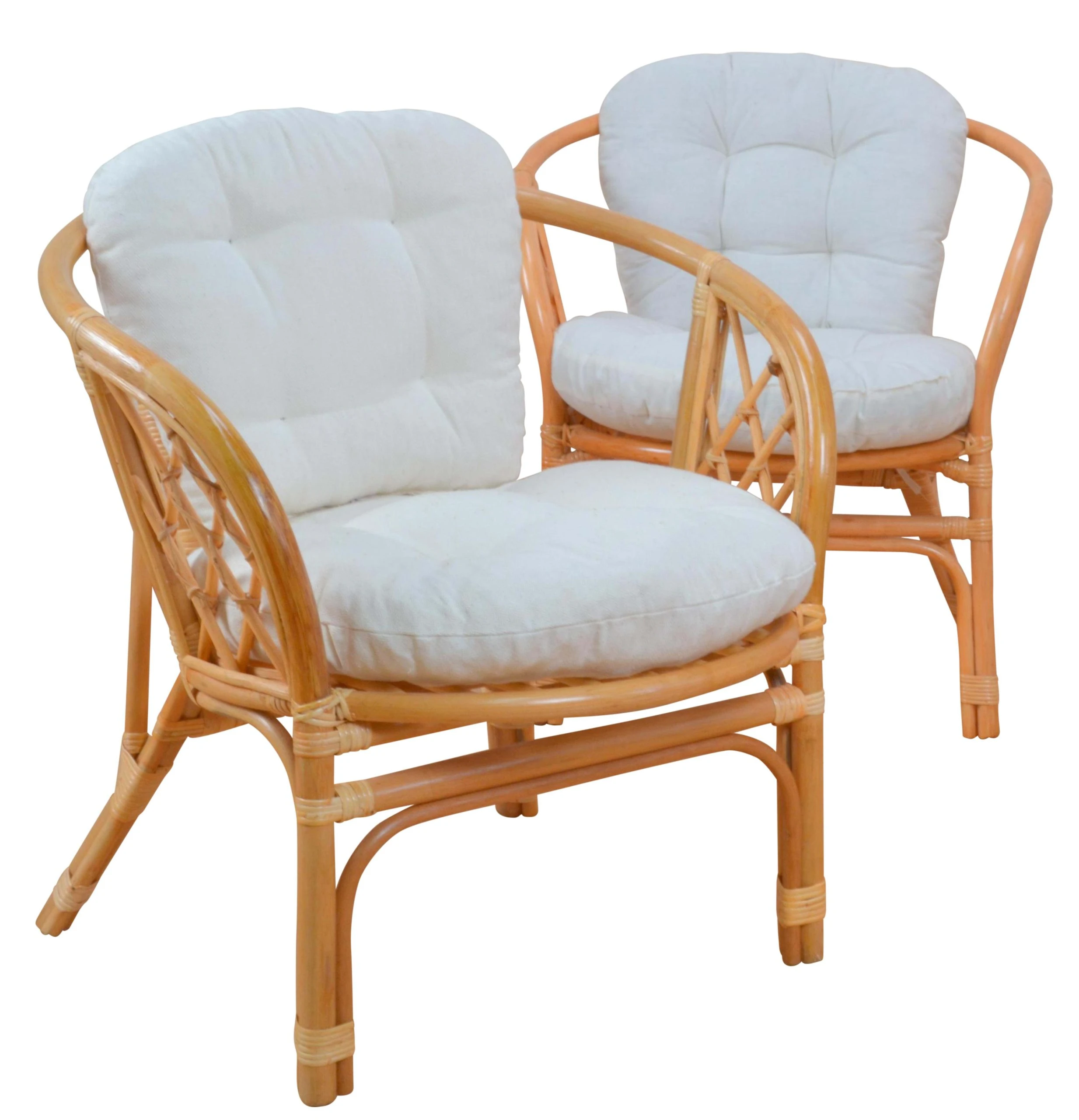 Bequeme Rattansessel für den Innenbereich, handgeflochten, Oberfläche honigfarben gebeizt und lackiert. Inklusive der passenden extra stark gepolsterten Sitz- und Rückenkissen, mit Schaumstoffpolsterung. Diese sind formstabil abgesteppt und mit Befestigungsbändern ausgestattet, damit sie am Sessel fixiert werden können. Bezug ist ecrufarben, nicht waschbar. Nicht für den Außenbereich geeignet.