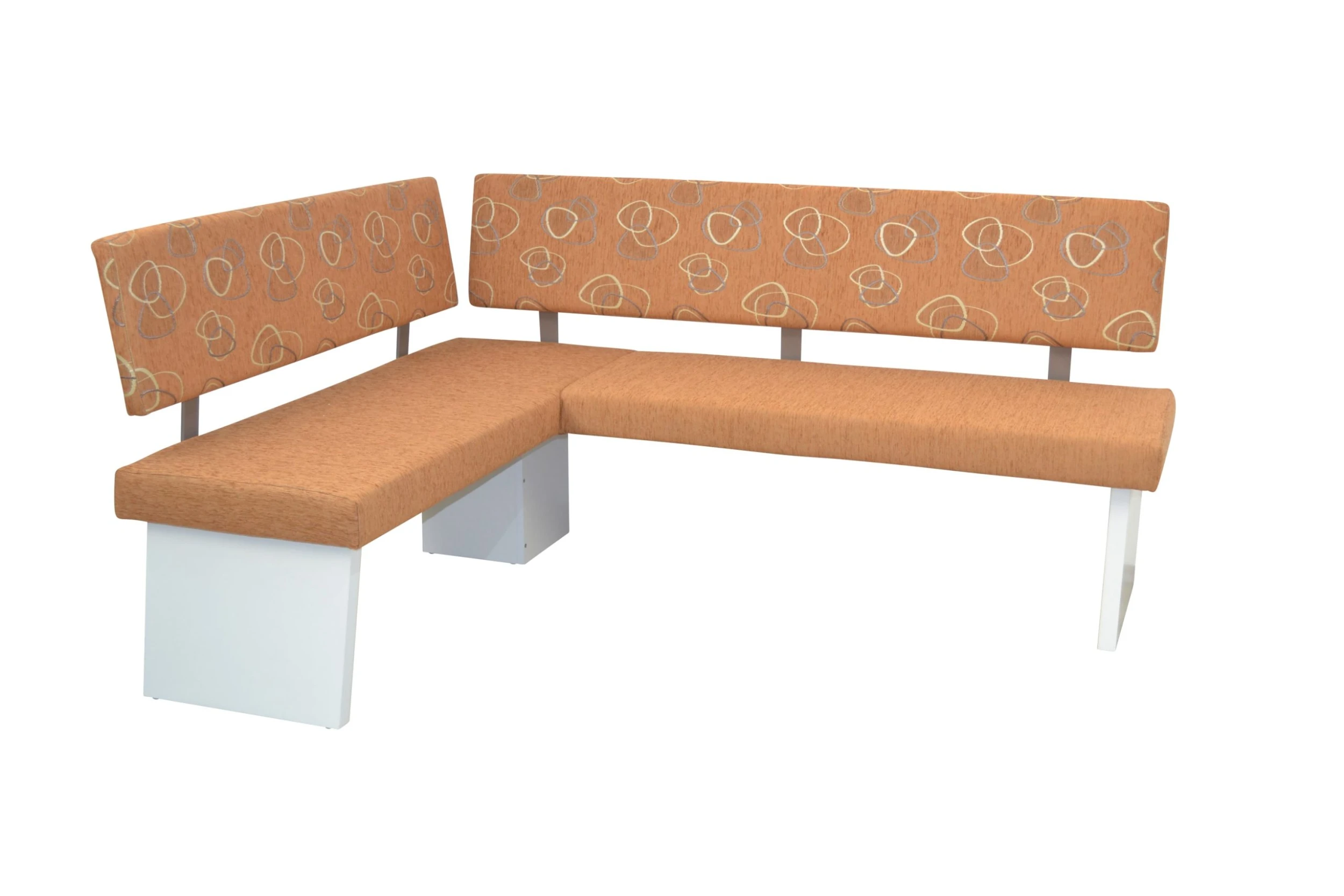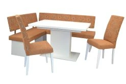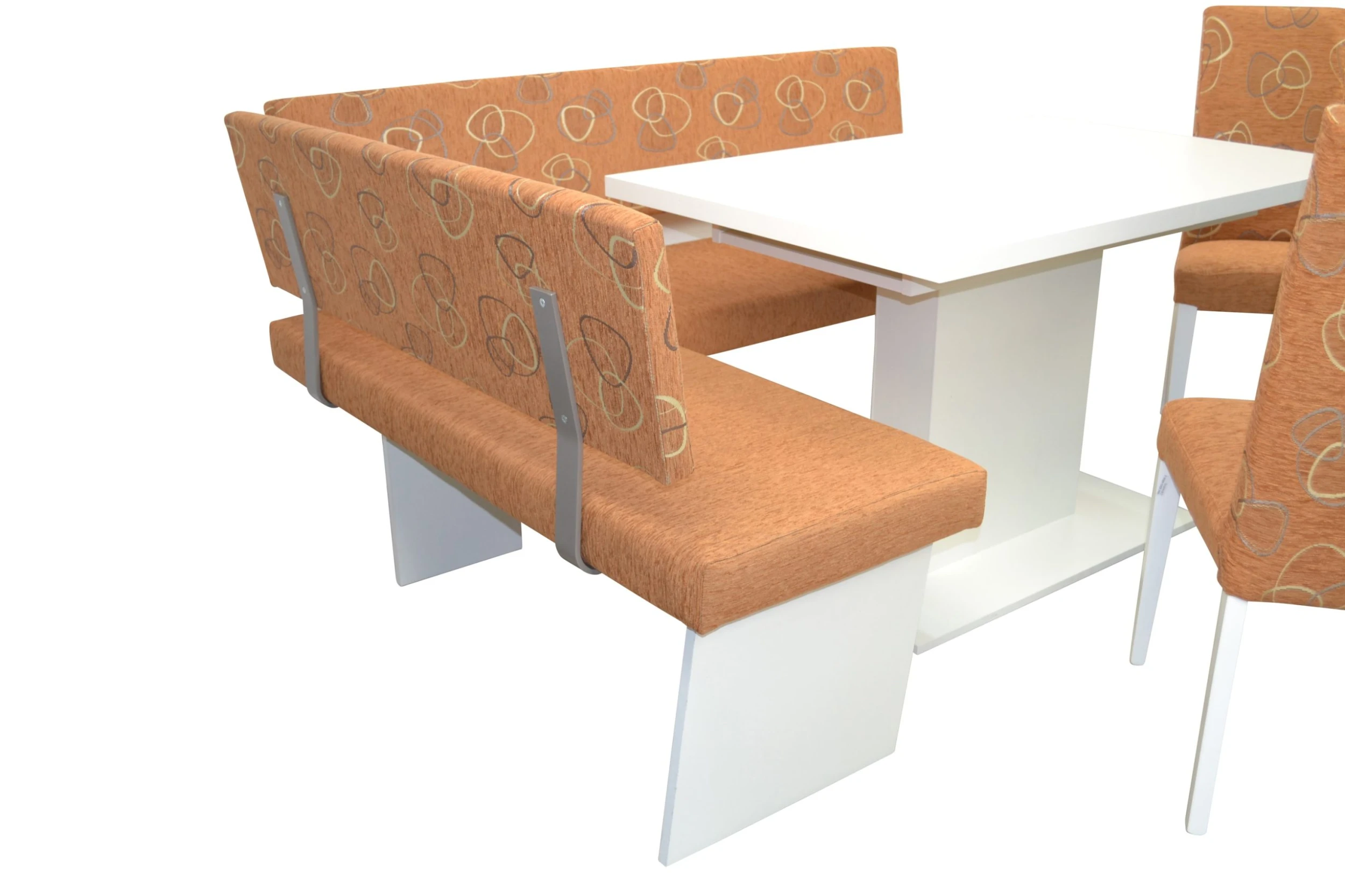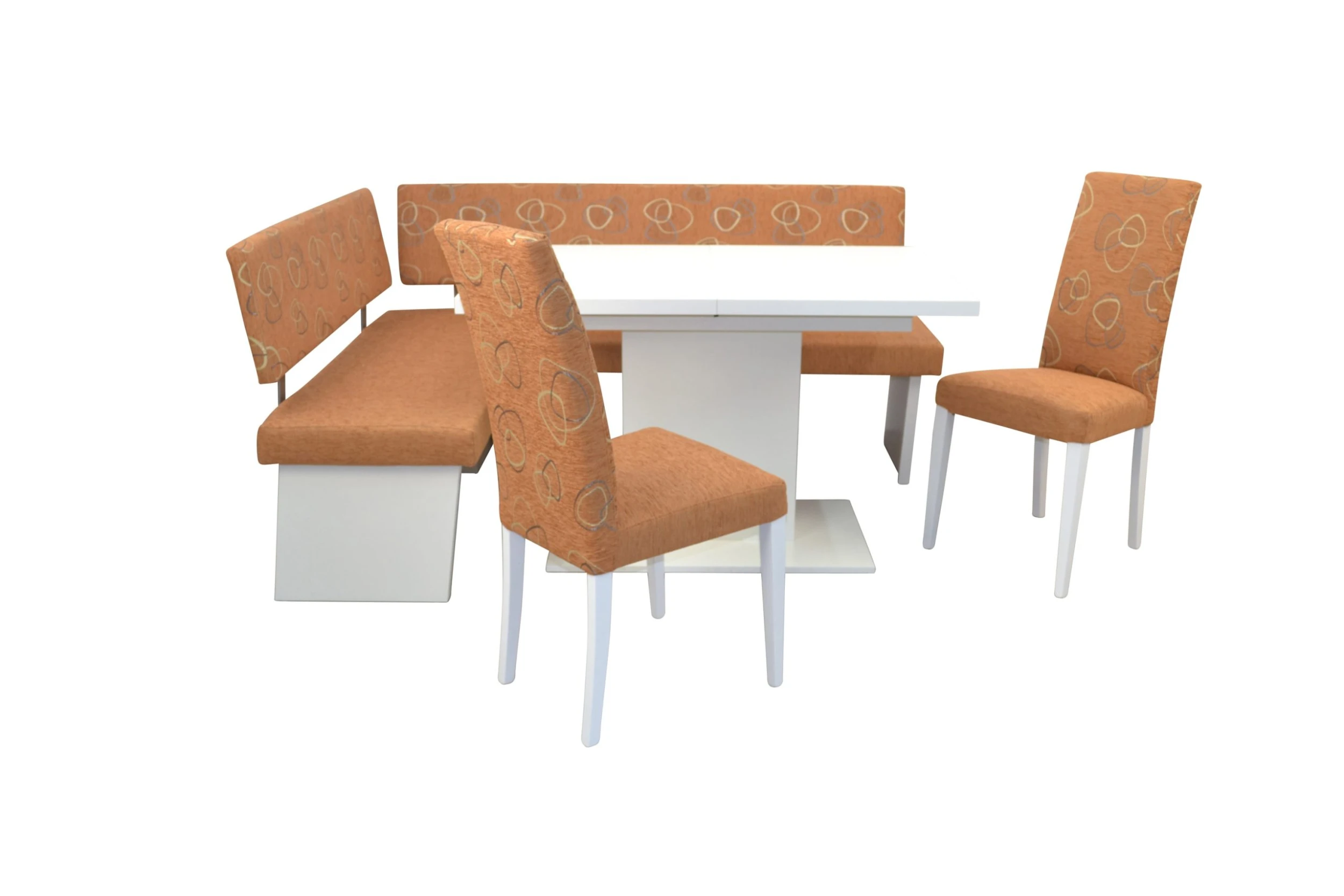 Moderne Eckbankbankgruppe 4tlg. bestehend aus einer Eckbank 140×180 cm, einen Esstisch 120×80 cm und zwei Polsterstühlen, in drei Stoffkombinationen lieferbar. Eckbank mit einem stabilen, hochwertigen Gestell aus Holzwerkstoff (Melaminplatten) gefertigt, die mit einem pflegeleichten, glatten Holzdekor, weiß beschichtet ist. Sitz und Rücken mit einem bequemen, extra starken Schaumstoffkern gepolstert. Sitzflächen mit einem unifarbenen Stoff und Rücken mit einem gemusterten Stoffbezug, bezogen. Rücken der Eckbank halb offen, mit hochwertigen Eisenbeschlägen, silberfarben, befestigt. Die Eckbank ist frei im Raum stellbar. Schenkel wahlweise rechts/links montierbar. Die Beine der Polsterstühle sind aus Massivholz Buche, weiß lackiert. Sitz und Rücken schaumstoffgepolstert und passend zur Eckbank mit den Stoffbezügen bezogen. Der Säulenesstisch ist komplett aus Holzwerkstoff gefertigt und mit einem pflegeleichten, glatten Melaminholzdekor, weiß, bezogen. Lieferung der Eckbank und vom Esstisch erfolgt zur Selbstmontage, inklusive Aufbauanleitung. Stühle werden montiert angeliefert. Maße ca. cm Eckbank: Schenkelmaß 140×180 cm, Höhe 89 cm, Tiefe 53 cm. Sitzhöhe ca. 45 cm, Sitztiefe ca. 43 cm. Belastbarkeit ca. 440 kg. Maße ca. cm Esstisch: (B/H/T) 120/75/80. Maße ca. cm Stuhl: (B/H/T) 46/100/57, Sitzhöhe ca. 50 cm, Sitztiefe ca. 37 cm.