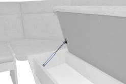 Gestell der Eckbank ist aus Holzwerkstoff (Melamin-Spanplatten) und mit einem Melamin-Holzdekor, weiß, beschichtet. Die schaumstoffgepolsterten Sitzflächen sind aufklappbar, darunter Stauraum. Ecke fest gepolstert. Rückenflächen ebenfalls schaumstoffgepolstert und formstabil abgenäht. Die Sitzflächen sind mit hochwertigen Gasdruckfedern gearbeitet, dadurch ist ein sicheres, sanftes Schließen der Sitzflächen gewährleistet. Sitzfläche und Rückenfläche sind mit einem Samtvelour-Stoffbezug (100% Polyamid) mit leichter Struktur, bezogen. Maße ca. cm: Eckbank Schenkelmaß (Stellfläche) 125×165 cm, Schenkel rechts/links montierbar, Tiefe ca. 57 cm, Höhe ca. 85 cm. Sitzhöhe ca. 45 cm. Lieferung der Eckbank erfolgt zur Selbstmontage, inklusive Aufbauanleitung.