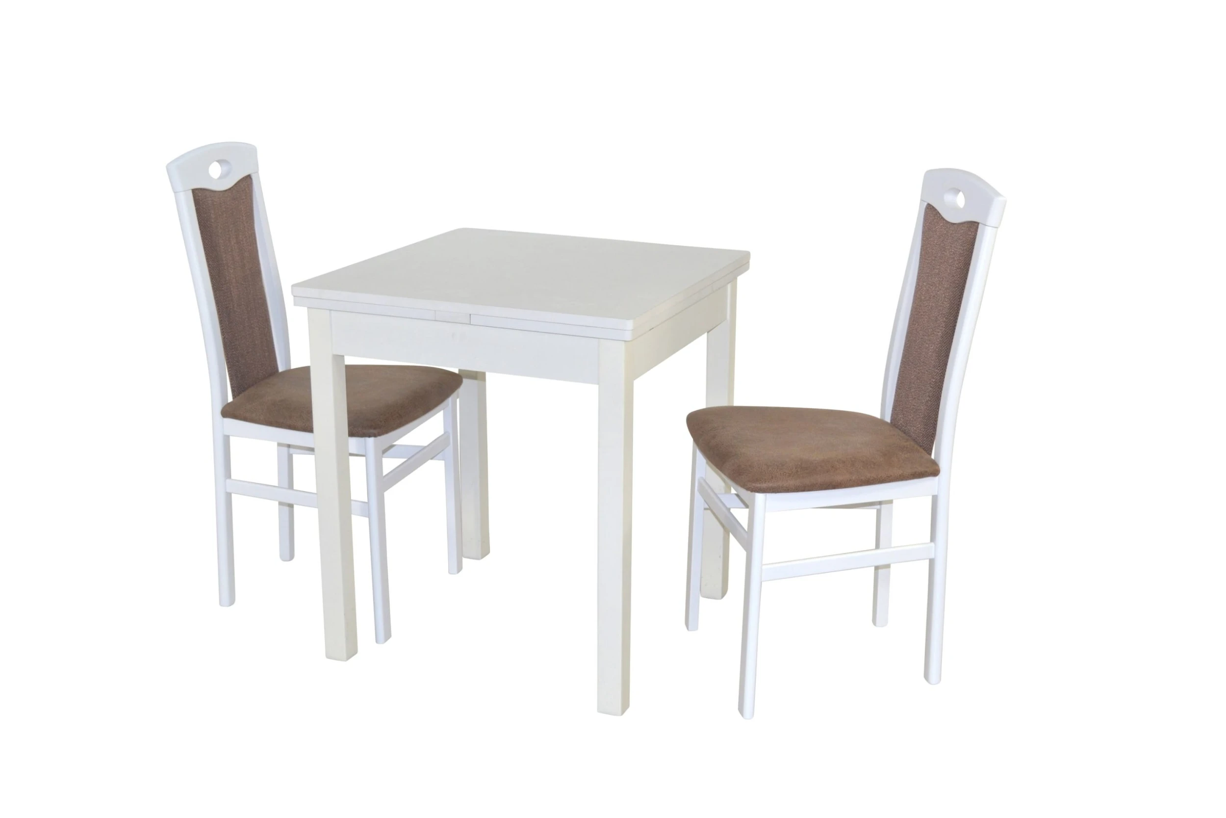 Hochwertige 3tlg. Essgruppe bestehend aus 2 Massivholzstühlen und 1 Esstisch mit zwei Ansteckplatten zum Vergrößern. Stühle aus Massivholz Buche, weiß lackiert. Sitz und Rücken sind bequem schaumstoffgepolstert und mit attraktiven Stoffbezügen bezogen. Sitz mit einem Bezug in Kunstlederoptik (100% Polyester), Rücken mit einem Strukturstoffbezug (90% Polyester/10% Rayon). Praktisch die eingearbeitete Griffmuschel im oberen Rückenbereich. Esstisch mit zwei Ansteckplatten (je ca. 30 cm breit), die rechts/links unter der Tischplatte eingeschogen sind, dadurch lässt sich die Tischplatte einfach und schnell von 67 cm bis auf 127 cm vergrößern. Beine vom Esstisch aus Massivholz Buche, weiß lackiert. Platten aus Holzwerkstoff die mit einem pflegeleichten Melamin-Holzdekor, weiß, beschichtet sind. Die Stühle werden montiert angeliefert, der Esstisch flach verpackt zur Selbstmontage, inklusive Aufbauanleitung. Maße ca. cm je Stuhl: (B/H/T) 45/95/48. Sitzhöhe ca. 46 cm, Sitztiefe ca. 39 cm. Maße ca. cm Esstisch: (B/H/T) 67-127/75/67.