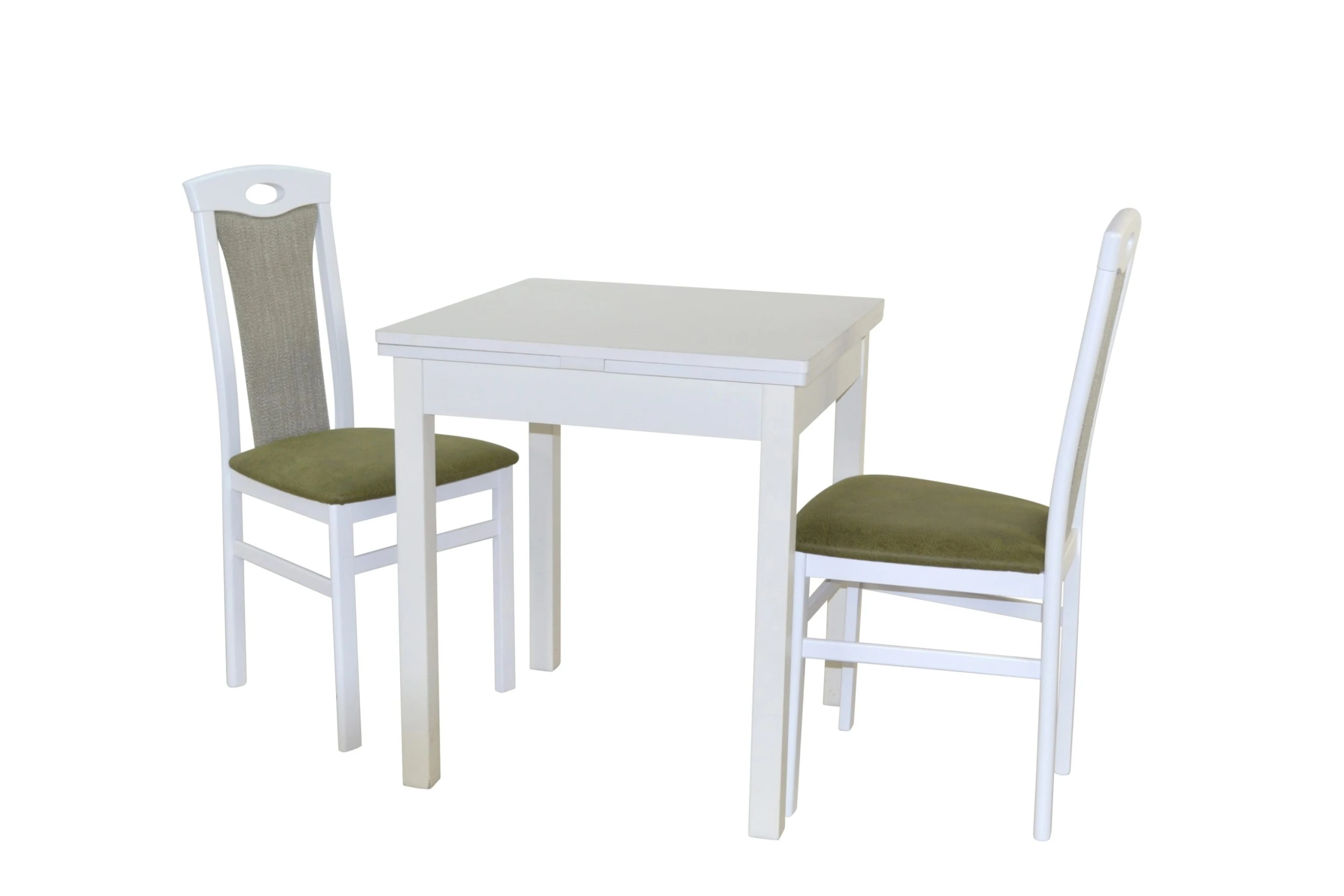 Hochwertige 3tlg. Essgruppe bestehend aus 2 Massivholzstühlen und 1 Esstisch mit zwei Ansteckplatten zum Vergrößern. Stühle aus Massivholz Buche, weiß lackiert. Sitz und Rücken sind bequem schaumstoffgepolstert und mit attraktiven Stoffbezügen bezogen. Sitz mit einem Bezug in Kunstlederoptik (100% Polyester), Rücken mit einem Strukturstoffbezug (90% Polyester/10% Rayon). Praktisch die eingearbeitete Griffmuschel im oberen Rückenbereich. Esstisch mit zwei Ansteckplatten (je ca. 30 cm breit), die rechts/links unter der Tischplatte eingeschogen sind, dadurch lässt sich die Tischplatte einfach und schnell von 67 cm bis auf 127 cm vergrößern. Beine vom Esstisch aus Massivholz Buche, weiß lackiert. Platten aus Holzwerkstoff die mit einem pflegeleichten Melamin-Holzdekor, weiß, beschichtet sind. Die Stühle werden montiert angeliefert, der Esstisch flach verpackt zur Selbstmontage, inklusive Aufbauanleitung. Maße ca. cm je Stuhl: (B/H/T) 45/95/48. Sitzhöhe ca. 46 cm, Sitztiefe ca. 39 cm. Maße ca. cm Esstisch: (B/H/T) 67-127/75/67.