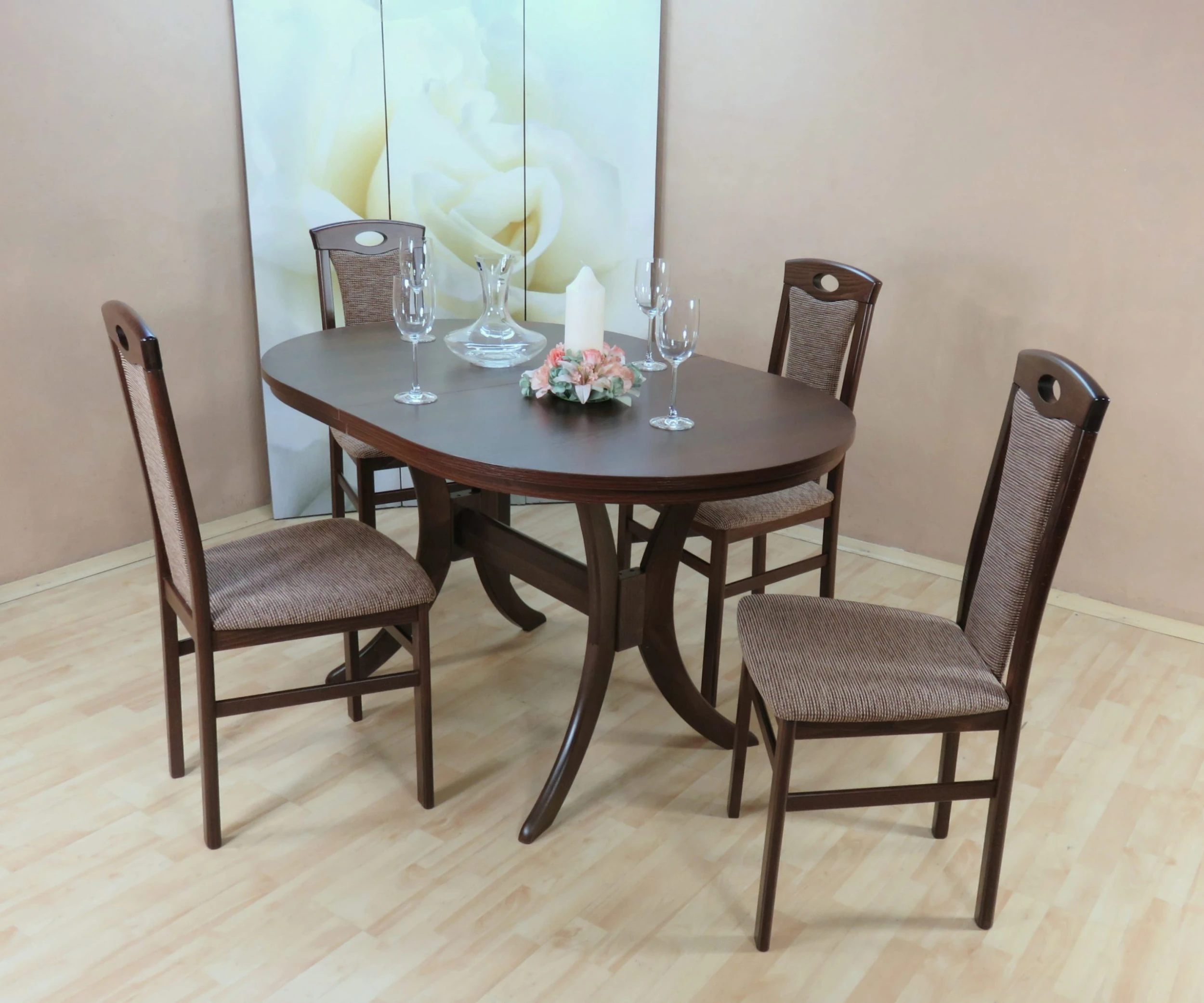 Eine teilmassive Essgruppe welche für formschönes Design mit viel Sinn für Gemütlichkeit steht. Eine ideale Kombination für Esszimmer oder Küchen. Verbringen Sie gemütliche Stunden mit Ihren Freunden und Bekannten. Die Sitz-und halboffenen Rückenkissen sind mit Schaumstoff gepolstert und einem strapazierfähigen Strukturstoff bezogen. Lieferbar in unterschiedlichen Farbvarianten mit farblich harmonierenten Stoffbezügen. Die Stühle und das Untergestell des eleganten ovalen Esstisches sind aus massivem Bucheholz während die Tischplatte mit einer robusten, pflegeleichten Melaminoberfläche in Holzoptik aufwartet. Die Auszugfunktion ist ausgestattet mit einer ca. 40 cm breiten Einlegeplatte, welche im Tisch verstaubar ist, und sorgt bei mehr Platzbedarf für eine schnelle Vergrößerung z.B. bei einen Spieleabend. Einfache Reinigung nur mit einem leicht feuchten Tuch abwischen und trocken nachpolieren. Die Verarbeitung aller Einzelteile garantiert eine hohe Stabilität und lange Nutzungsdauer. Schaffen Sie eine freundliche und behagliche Atmosphäre in Ihrem Zuhause.
