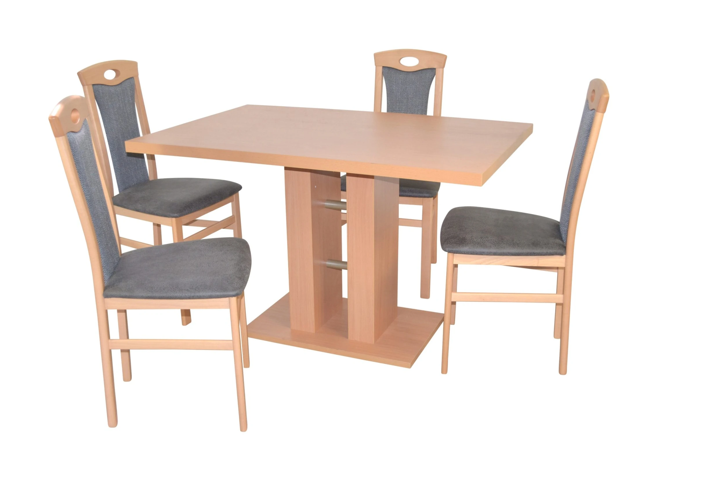 Hochwertige 5tlg. Essgruppe bestehend aus 4 Massivholzstühlen und 1 Esstisch. Stühle aus Massivholz Buche, buchefarben gebeizt und lackiert. Sitz und Rücken sind bequem schaumstoffgepolstert und mit attraktiven Stoffbezügen bezogen. Sitz mit einem Bezug in Kunstlederoptik (100% Polyester), Rücken mit einem Strukturstoffbezug (90% Polyester/10% Rayon). Praktisch die eingearbeitete Griffmuschel im oberen Rückenbereich. Esstisch mit einem modernen Säulengestell komplett aus Holzwerkstoff gefertigt und mit einem strapazierfähigen, pflegeleichten Melamin-Holzdekor, Buche-Nachbildung, beschichtet. Zusätzlich 2 silberfarbene Rohre im Säulengestell kombiniert. Die Stühle werden montiert angeliefert, der Esstisch flach verpackt zur Selbstmontage, inklusive Aufbauanleitung. Maße ca. cm je Stuhl: (B/H/T) 45/95/48. Sitzhöhe ca. 46 cm, Sitztiefe ca. 39 cm. Maße ca. cm Esstisch: (B/H/T) 120/75/80