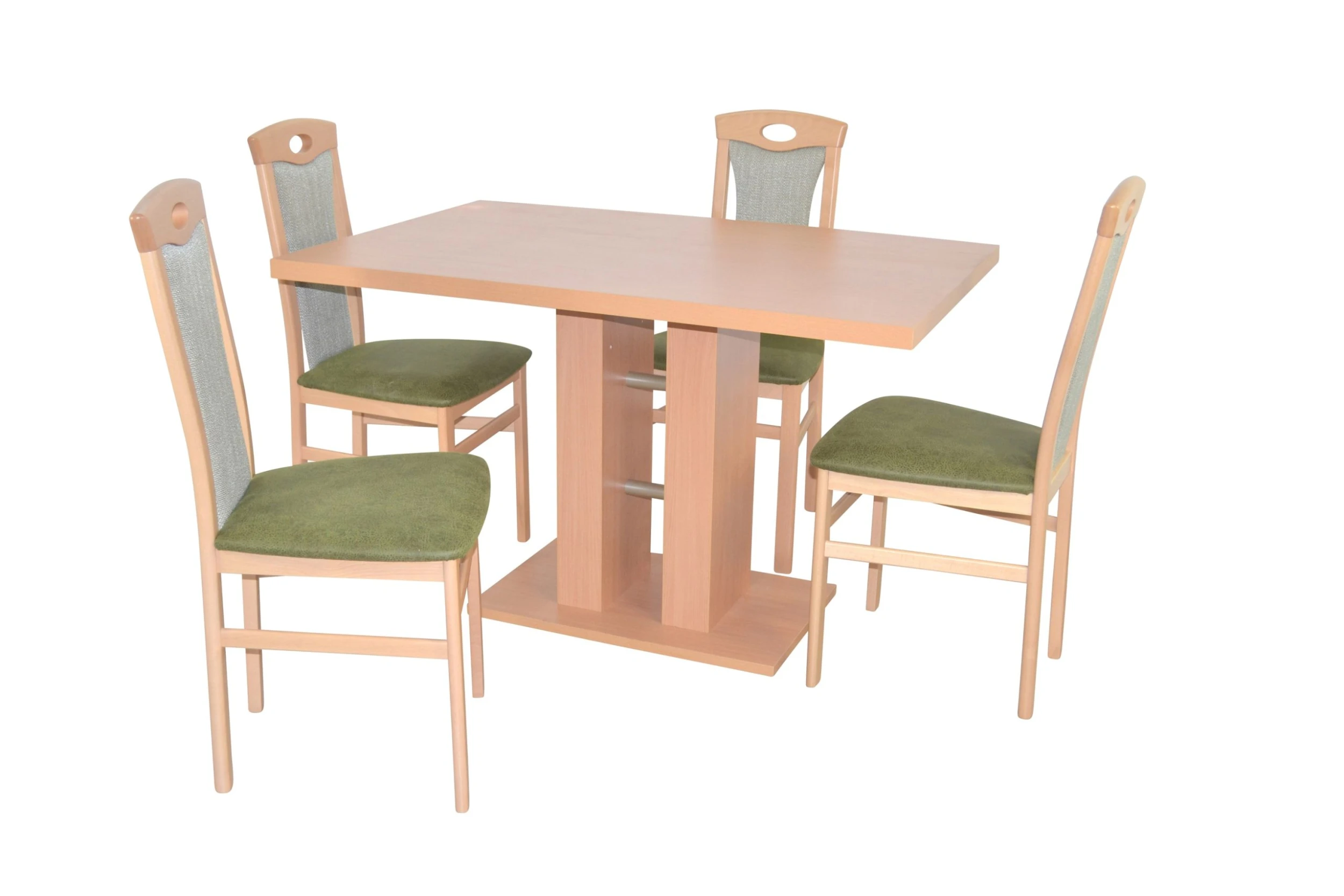 Hochwertige 5tlg. Essgruppe bestehend aus 4 Massivholzstühlen und 1 Esstisch. Stühle aus Massivholz Buche, buchefarben gebeizt und lackiert. Sitz und Rücken sind bequem schaumstoffgepolstert und mit attraktiven Stoffbezügen bezogen. Sitz mit einem Bezug in Kunstlederoptik (100% Polyester), Rücken mit einem Strukturstoffbezug (90% Polyester/10% Rayon). Praktisch die eingearbeitete Griffmuschel im oberen Rückenbereich. Esstisch mit einem modernen Säulengestell komplett aus Holzwerkstoff gefertigt und mit einem strapazierfähigen, pflegeleichten Melamin-Holzdekor, Buche-Nachbildung, beschichtet. Zusätzlich 2 silberfarbene Rohre im Säulengestell kombiniert. Die Stühle werden montiert angeliefert, der Esstisch flach verpackt zur Selbstmontage, inklusive Aufbauanleitung. Maße ca. cm je Stuhl: (B/H/T) 45/95/48. Sitzhöhe ca. 46 cm, Sitztiefe ca. 39 cm. Maße ca. cm Esstisch: (B/H/T) 120/75/80