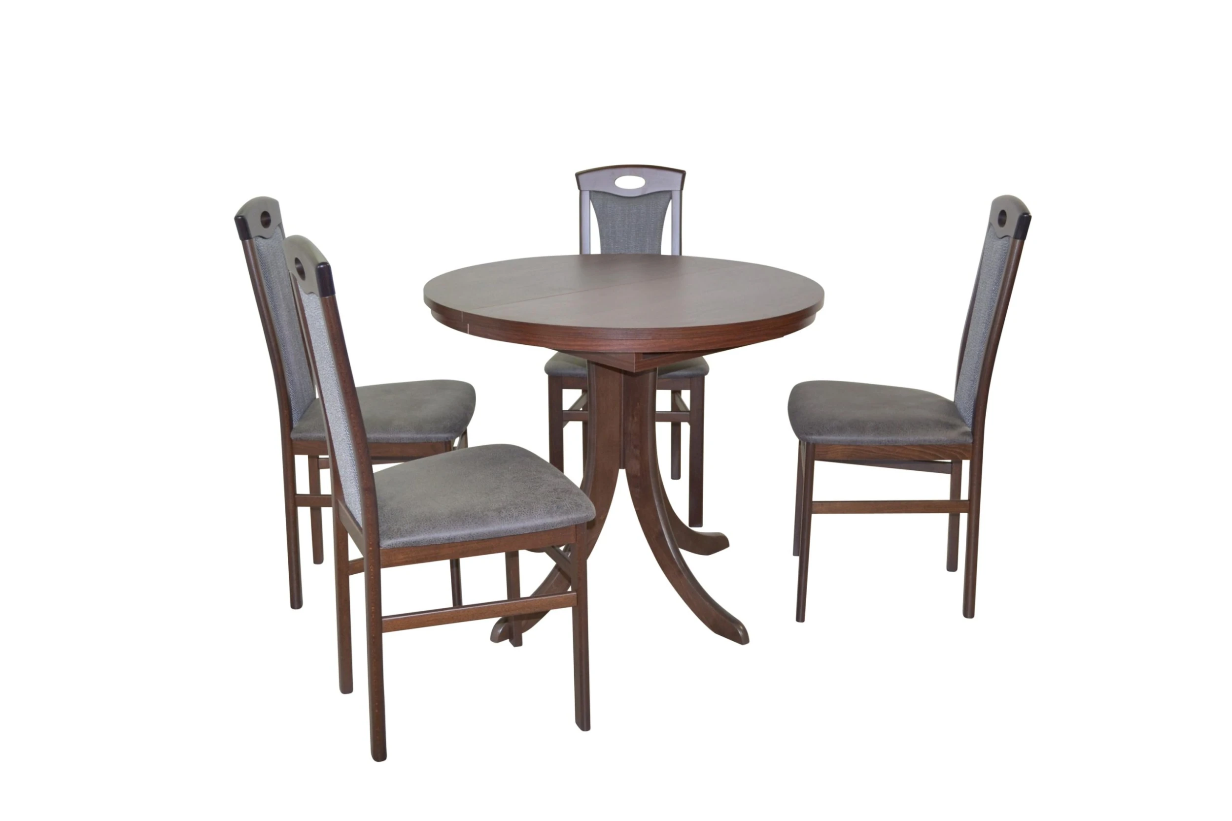 Hochwertige 5tlg. Essgruppe bestehend aus 4 Massivholzstühlen und 1 Esstisch mit zwei Ansteckplatten zum Vergrößern. Stühle aus Massivholz Buche, nussbaumfarben gebeizt und lackiert. Sitz und Rücken sind bequem schaumstoffgepolstert und mit attraktiven Stoffbezügen bezogen. Sitz mit einem Bezug in Kunstlederoptik (100% Polyester), Rücken mit einem Strukturstoffbezug (90% Polyester/10% Rayon). Praktisch die eingearbeitete Griffmuschel im oberen Rückenbereich. Esstisch mit einer runden Tischplatte die ausziehbar ist, darunter eingelegt ist eine Einlegeplatte ca. 35 cm breit, dadurch lässt sich die Tischplatte einfach und schnell von 90 cm bis auf 125 cm vergrößern. Gestell vom Esstisch aus Massivholz Buche, nussbaumfarben gebeizt und lackiert. Platten aus Holzwerkstoff die mit einem pflegeleichten Melamin-Holzdekor, Nussbaum-Nachbildung, beschichtet sind. Die Stühle werden montiert angeliefert, der Esstisch flach verpackt zur Selbstmontage, inklusive Aufbauanleitung. Maße ca. cm je Stuhl: (B/H/T) 45/95/48. Sitzhöhe ca. 46 cm, Sitztiefe ca. 39 cm. Maße ca. cm Esstisch: (B/H/T) 90-125/75/90.