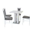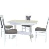 Hochwertige 5tlg. Essgruppe bestehend aus 4 Massivholzstühlen und 1 Esstisch mit zwei Ansteckplatten zum Vergrößern. Stühle aus Massivholz Buche, weiß lackiert. Sitz und Rücken sind bequem schaumstoffgepolstert und mit attraktiven Stoffbezügen bezogen. Sitz mit einem Bezug in Kunstlederoptik (100% Polyester), Rücken mit einem Strukturstoffbezug (90% Polyester/10% Rayon). Praktisch die eingearbeitete Griffmuschel im oberen Rückenbereich. Esstisch mit einer runden Tischplatte die ausziehbar ist, darunter eingelegt ist eine Einlegeplatte ca. 35 cm breit, dadurch lässt sich die Tischplatte einfach und schnell von 90 cm bis auf 125 cm vergrößern. Gestell vom Esstisch aus Massivholz Buche, weiß lackiert. Platten aus Holzwerkstoff die mit einem pflegeleichten Melamin-Holzdekor, weiß, beschichtet sind. Die Stühle werden montiert angeliefert, der Esstisch flach verpackt zur Selbstmontage, inklusive Aufbauanleitung. Maße ca. cm je Stuhl: (B/H/T) 45/95/48. Sitzhöhe ca. 46 cm, Sitztiefe ca. 39 cm. Maße ca. cm Esstisch: (B/H/T) 90-125/75/90.