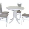 Hochwertige 5tlg. Essgruppe bestehend aus 4 Massivholzstühlen und 1 Esstisch mit zwei Ansteckplatten zum Vergrößern. Stühle aus Massivholz Buche, nussbaumfarben gebeizt und lackiert. Sitz und Rücken sind bequem schaumstoffgepolstert und mit attraktiven Stoffbezügen bezogen. Sitz mit einem Bezug in Kunstlederoptik (100% Polyester), Rücken mit einem Strukturstoffbezug (90% Polyester/10% Rayon). Praktisch die eingearbeitete Griffmuschel im oberen Rückenbereich. Esstisch mit einer runden Tischplatte die ausziehbar ist, darunter eingelegt ist eine Einlegeplatte ca. 35 cm breit, dadurch lässt sich die Tischplatte einfach und schnell von 90 cm bis auf 125 cm vergrößern. Gestell vom Esstisch aus Massivholz Buche, nussbaumfarben gebeizt und lackiert. Platten aus Holzwerkstoff die mit einem pflegeleichten Melamin-Holzdekor, Nussbaum-Nachbildung, beschichtet sind. Die Stühle werden montiert angeliefert, der Esstisch flach verpackt zur Selbstmontage, inklusive Aufbauanleitung. Maße ca. cm je Stuhl: (B/H/T) 45/95/48. Sitzhöhe ca. 46 cm, Sitztiefe ca. 39 cm. Maße ca. cm Esstisch: (B/H/T) 90-125/75/90.