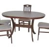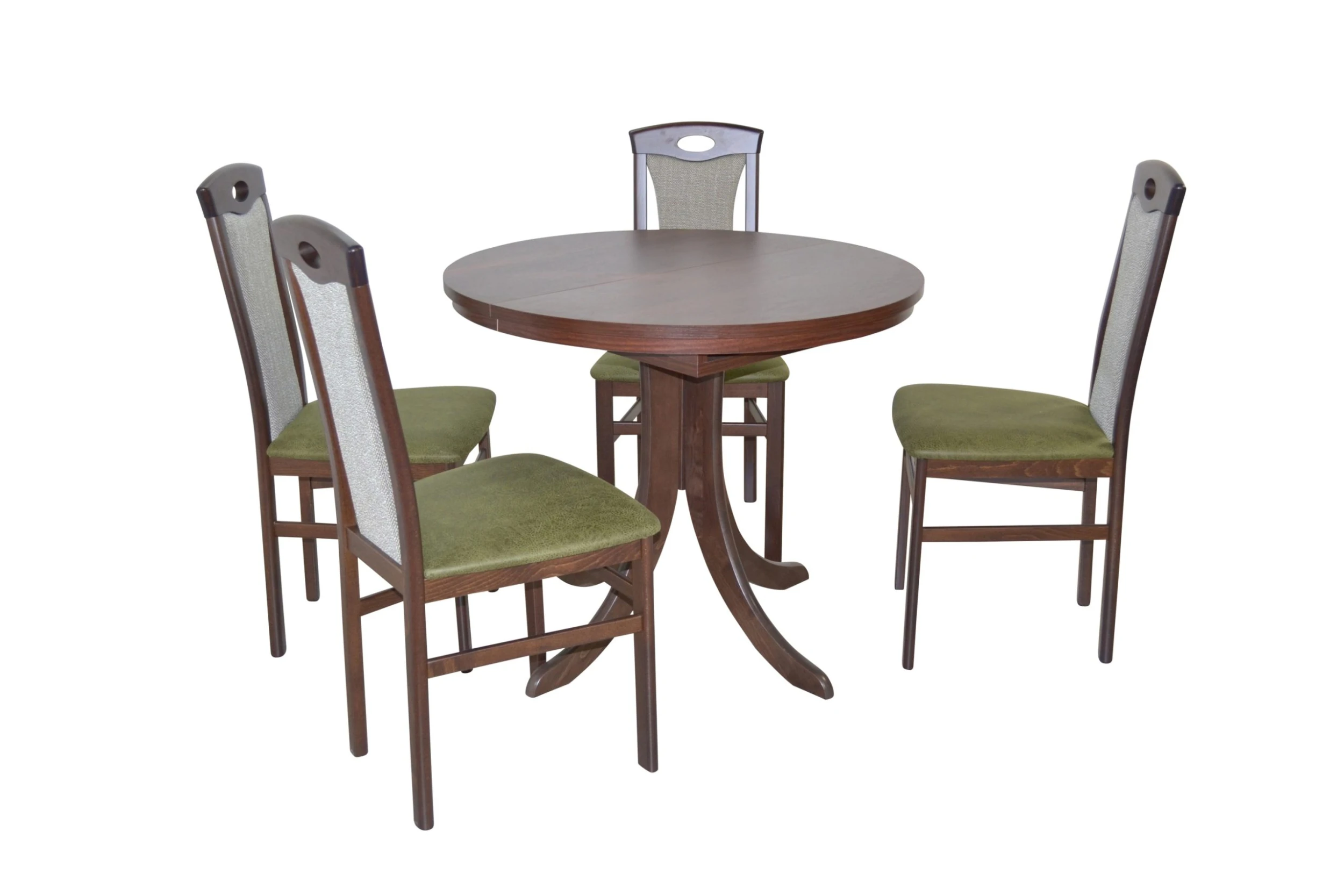 Hochwertige 5tlg. Essgruppe bestehend aus 4 Massivholzstühlen und 1 Esstisch mit zwei Ansteckplatten zum Vergrößern. Stühle aus Massivholz Buche, nussbaumfarben gebeizt und lackiert. Sitz und Rücken sind bequem schaumstoffgepolstert und mit attraktiven Stoffbezügen bezogen. Sitz mit einem Bezug in Kunstlederoptik (100% Polyester), Rücken mit einem Strukturstoffbezug (90% Polyester/10% Rayon). Praktisch die eingearbeitete Griffmuschel im oberen Rückenbereich. Esstisch mit einer runden Tischplatte die ausziehbar ist, darunter eingelegt ist eine Einlegeplatte ca. 35 cm breit, dadurch lässt sich die Tischplatte einfach und schnell von 90 cm bis auf 125 cm vergrößern. Gestell vom Esstisch aus Massivholz Buche, nussbaumfarben gebeizt und lackiert. Platten aus Holzwerkstoff die mit einem pflegeleichten Melamin-Holzdekor, Nussbaum-Nachbildung, beschichtet sind. Die Stühle werden montiert angeliefert, der Esstisch flach verpackt zur Selbstmontage, inklusive Aufbauanleitung. Maße ca. cm je Stuhl: (B/H/T) 45/95/48. Sitzhöhe ca. 46 cm, Sitztiefe ca. 39 cm. Maße ca. cm Esstisch: (B/H/T) 90-125/75/90.