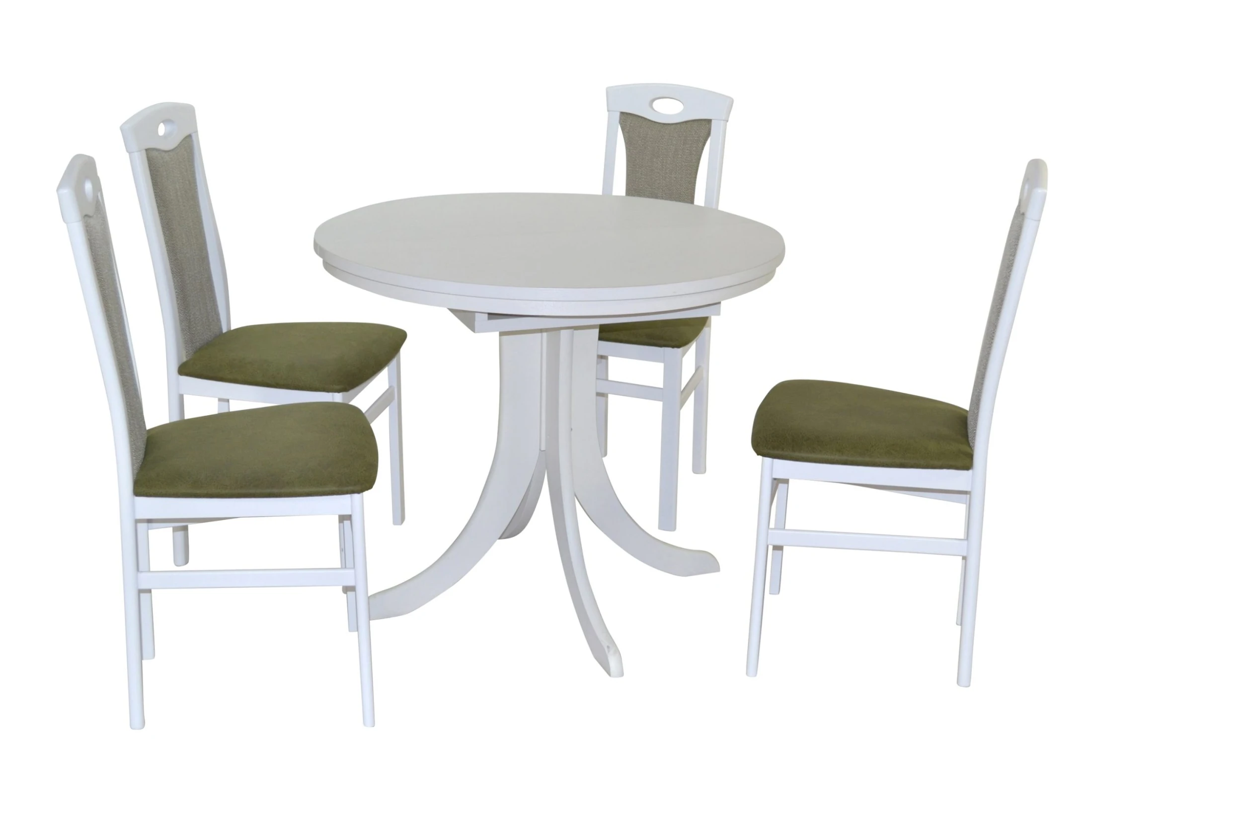 Hochwertige 5tlg. Essgruppe bestehend aus 4 Massivholzstühlen und 1 Esstisch mit zwei Ansteckplatten zum Vergrößern. Stühle aus Massivholz Buche, weiß lackiert. Sitz und Rücken sind bequem schaumstoffgepolstert und mit attraktiven Stoffbezügen bezogen. Sitz mit einem Bezug in Kunstlederoptik (100% Polyester), Rücken mit einem Strukturstoffbezug (90% Polyester/10% Rayon). Praktisch die eingearbeitete Griffmuschel im oberen Rückenbereich. Esstisch mit einer runden Tischplatte die ausziehbar ist, darunter eingelegt ist eine Einlegeplatte ca. 35 cm breit, dadurch lässt sich die Tischplatte einfach und schnell von 90 cm bis auf 125 cm vergrößern. Gestell vom Esstisch aus Massivholz Buche, weiß lackiert. Platten aus Holzwerkstoff die mit einem pflegeleichten Melamin-Holzdekor, weiß, beschichtet sind. Die Stühle werden montiert angeliefert, der Esstisch flach verpackt zur Selbstmontage, inklusive Aufbauanleitung. Maße ca. cm je Stuhl: (B/H/T) 45/95/48. Sitzhöhe ca. 46 cm, Sitztiefe ca. 39 cm. Maße ca. cm Esstisch: (B/H/T) 90-125/75/90.