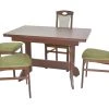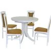 Hochwertige 5tlg. Essgruppe bestehend aus 4 Massivholzstühlen und 1 Esstisch mit zwei Ansteckplatten zum Vergrößern. Stühle aus Massivholz Buche, nussbaumfarben gebeizt und lackiert. Sitz und Rücken sind bequem schaumstoffgepolstert und mit attraktiven Stoffbezügen bezogen. Sitz mit einem Bezug in Kunstlederoptik (100% Polyester), Rücken mit einem Strukturstoffbezug (90% Polyester/10% Rayon). Praktisch die eingearbeitete Griffmuschel im oberen Rückenbereich. Esstisch mit einer runden Tischplatte die ausziehbar ist, darunter eingelegt ist eine Einlegeplatte ca. 35 cm breit, dadurch lässt sich die Tischplatte einfach und schnell von 90 cm bis auf 125 cm vergrößern. Gestell vom Esstisch aus Massivholz Buche, nussbaumfarben gebeizt und lackiert. Platten aus Holzwerkstoff die mit einem pflegeleichten Melamin-Holzdekor, Nussbaum-Nachbildung, beschichtet sind. Die Stühle werden montiert angeliefert, der Esstisch flach verpackt zur Selbstmontage, inklusive Aufbauanleitung. Maße ca. cm je Stuhl: (B/H/T) 45/95/48. Sitzhöhe ca. 46 cm, Sitztiefe ca. 39 cm. Maße ca. cm Esstisch: (B/H/T) 90-125/75/90.