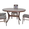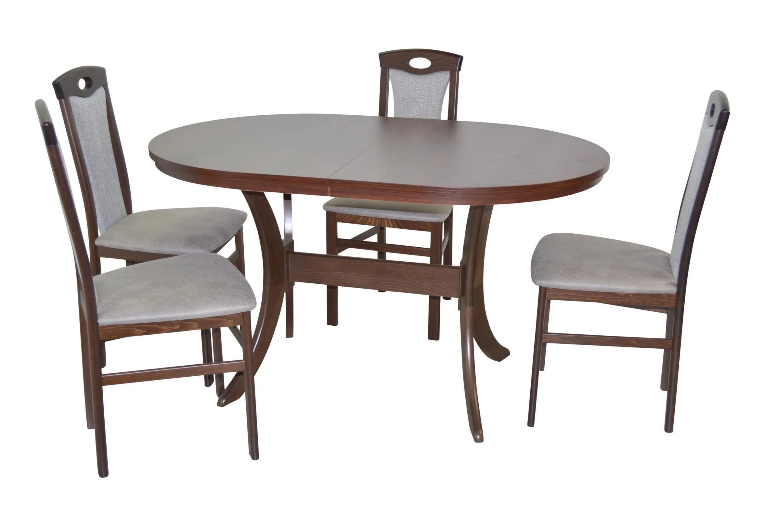 Hochwertige 5tlg. Essgruppe bestehend aus 4 Massivholzstühlen und 1 Esstisch mit zwei Ansteckplatten zum Vergrößern. Stühle aus Massivholz Buche, nussbaumfarben gebeizt und lackiert. Sitz und Rücken sind bequem schaumstoffgepolstert und mit attraktiven Stoffbezügen bezogen. Sitz mit einem Bezug in Kunstlederoptik (100% Polyester), Rücken mit einem Strukturstoffbezug (90% Polyester/10% Rayon). Praktisch die eingearbeitete Griffmuschel im oberen Rückenbereich. Esstisch mit einer ovalen Tischplatte die ausziehbar ist, darunter eingelegt ist eine Einlegeplatte ca. 40 cm breit, dadurch lässt sich die Tischplatte einfach und schnell von 135 – 175 cm vergrößern. Gestell vom Esstisch aus Massivholz Buche, nussbaumfarben gebeizt und lackiert. Platten aus Holzwerkstoff die mit einem pflegeleichten Melamin-Holzdekor, Nussbaum-Nachbildung, beschichtet sind. Die Stühle werden montiert angeliefert, der Esstisch flach verpackt zur Selbstmontage, inklusive Aufbauanleitung. Maße ca. cm je Stuhl: (B/H/T) 45/95/48. Sitzhöhe ca. 46 cm, Sitztiefe ca. 39 cm. Maße ca. cm Esstisch: (B/H/T) 135-175/76/90.