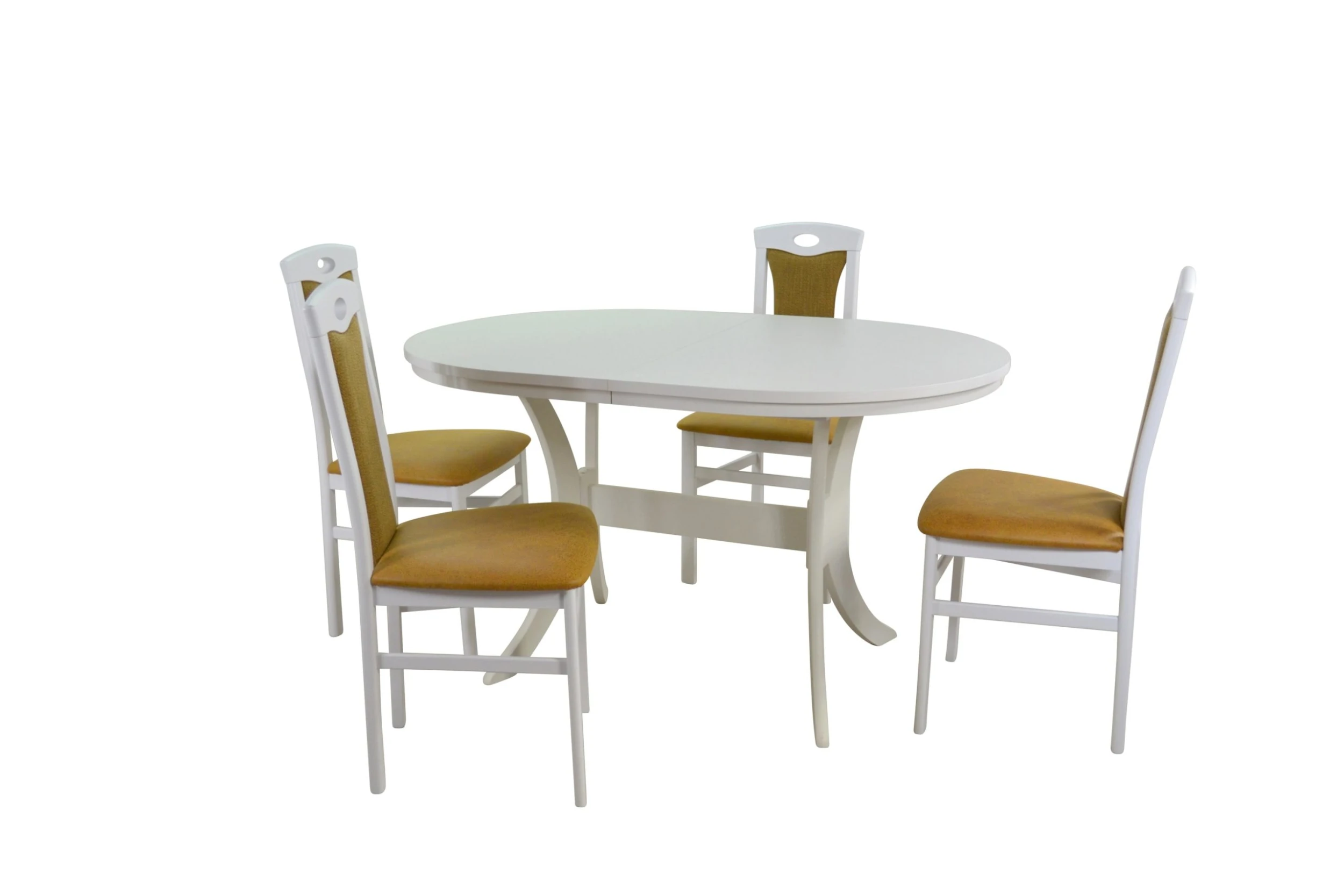 Hochwertige 5tlg. Essgruppe bestehend aus 4 Massivholzstühlen und 1 Esstisch mit zwei Ansteckplatten zum Vergrößern. Stühle aus Massivholz Buche, weiß lackiert. Sitz und Rücken sind bequem schaumstoffgepolstert und mit attraktiven Stoffbezügen bezogen. Sitz mit einem Bezug in Kunstlederoptik (100% Polyester), Rücken mit einem Strukturstoffbezug (90% Polyester/10% Rayon). Praktisch die eingearbeitete Griffmuschel im oberen Rückenbereich. Esstisch mit einer ovalen Tischplatte die ausziehbar ist, darunter eingelegt ist eine Einlegeplatte ca. 40 cm breit, dadurch lässt sich die Tischplatte einfach und schnell von 135 – 175 cm vergrößern. Gestell vom Esstisch aus Massivholz Buche, weiß lackiert. Platten aus Holzwerkstoff die mit einem pflegeleichten Melamin-Holzdekor, weiß, beschichtet sind. Die Stühle werden montiert angeliefert, der Esstisch flach verpackt zur Selbstmontage, inklusive Aufbauanleitung. Maße ca. cm je Stuhl: (B/H/T) 45/95/48. Sitzhöhe ca. 46 cm, Sitztiefe ca. 39 cm. Maße ca. cm Esstisch: (B/H/T) 135-175/76/90.