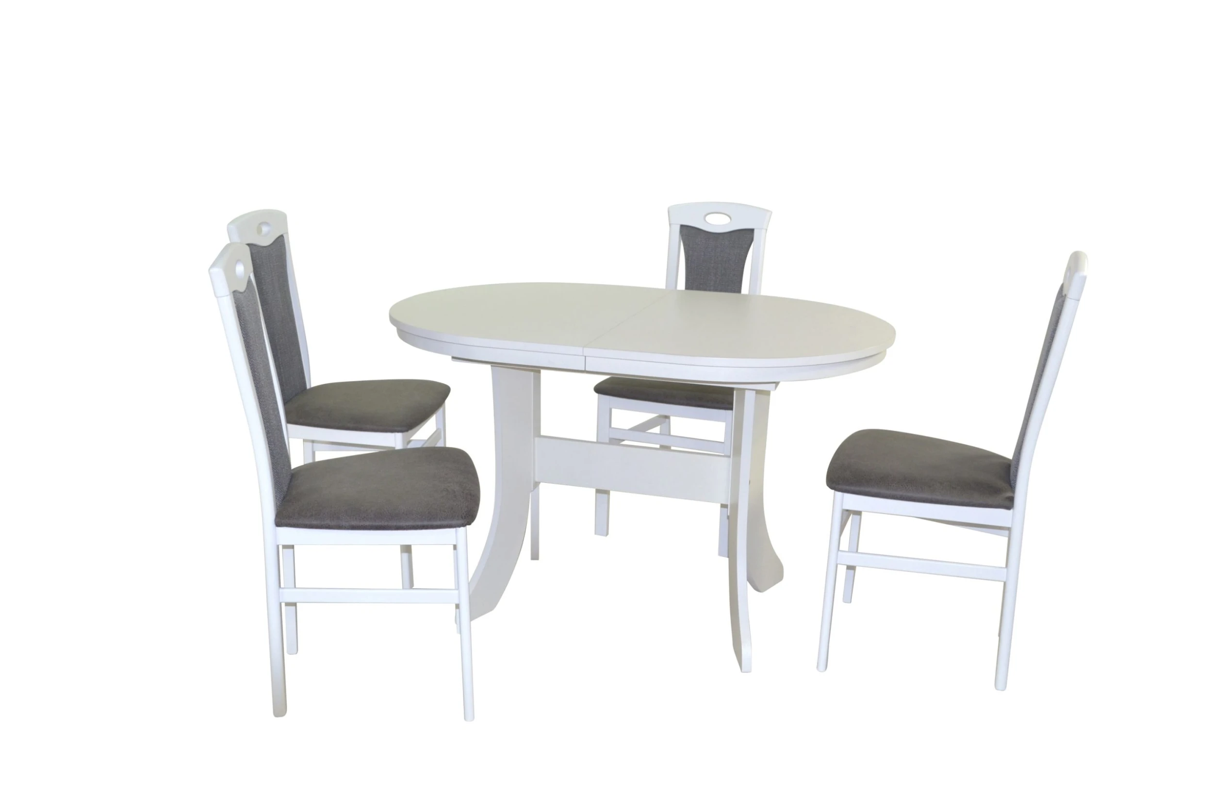 Hochwertige 5tlg. Essgruppe bestehend aus 4 Massivholzstühlen und 1 Esstisch. Stühle aus Massivholz Buche, weiß lackiert. Sitz und Rücken sind bequem schaumstoffgepolstert und mit attraktiven Stoffbezügen bezogen. Sitz mit einem Bezug in Kunstlederoptik (100% Polyester), Rücken mit einem Strukturstoffbezug (90% Polyester/10% Rayon). Praktisch die eingearbeitete Griffmuschel im oberen Rückenbereich. Esstisch mit einem modernen, stabilen Gestell komplett aus Holzwerkstoff gefertigt und mit einem strapazierfähigen, pflegeleichten Melamin-Holzdekor, weiß, beschichtet. Die ovale Tischplatte ist ausziehbar, darunter ist eine ca. 40 cm breite Einlegeplatte, die sich problemlos dazwischen einlegen lässt und der Tisch schnell und einfach von 120 cm bis auf 160 cm vergrößerbar ist. Die Stühle werden montiert angeliefert, der Esstisch flach verpackt zur Selbstmontage, inklusive Aufbauanleitung. Maße ca. cm je Stuhl: (B/H/T) 45/95/48. Sitzhöhe ca. 46 cm, Sitztiefe ca. 39 cm. Maße ca. cm Esstisch: (BxHxT) 120-160x75x80.