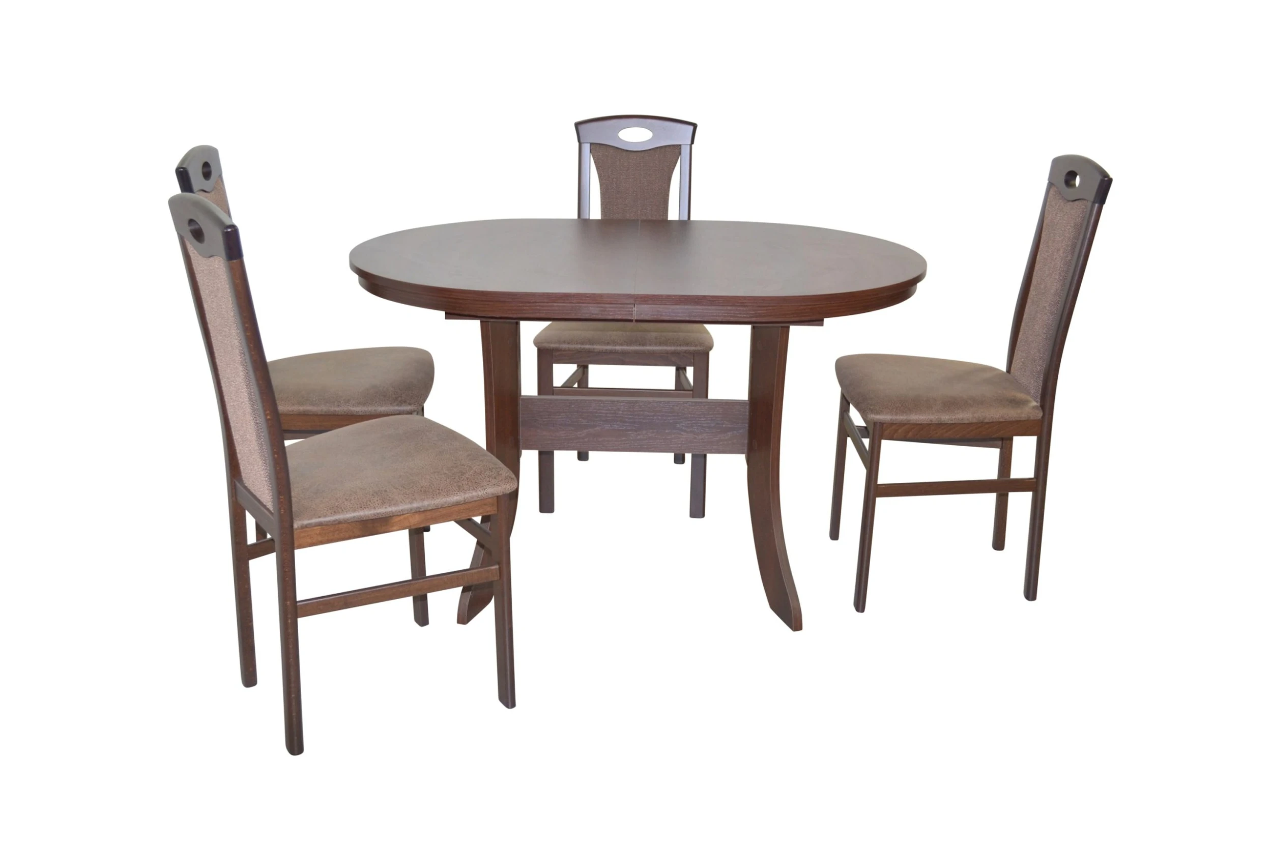Hochwertige 5tlg. Essgruppe bestehend aus 4 Massivholzstühlen und 1 Esstisch. Stühle aus Massivholz Buche, nussbaumfarben gebeizt und lackiert. Sitz und Rücken sind bequem schaumstoffgepolstert und mit attraktiven Stoffbezügen bezogen. Sitz mit einem Bezug in Kunstlederoptik (100% Polyester), Rücken mit einem Strukturstoffbezug (90% Polyester/10% Rayon). Praktisch die eingearbeitete Griffmuschel im oberen Rückenbereich. Esstisch mit einem modernen, stabilen Gestell komplett aus Holzwerkstoff gefertigt und mit einem strapazierfähigen, pflegeleichten Melamin-Holzdekor, Nussbaum-Nachbildung, beschichtet. Die ovale Tischplatte ist ausziehbar, darunter ist eine ca. 40 cm breite Einlegeplatte, die sich problemlos dazwischen einlegen lässt und der Tisch schnell und einfach von 120 cm bis auf 160 cm vergrößerbar ist. Die Stühle werden montiert angeliefert, der Esstisch flach verpackt zur Selbstmontage, inklusive Aufbauanleitung. Maße ca. cm je Stuhl: (B/H/T) 45/95/48. Sitzhöhe ca. 46 cm, Sitztiefe ca. 39 cm. Maße ca. cm Esstisch: (BxHxT) 120-160x75x80.