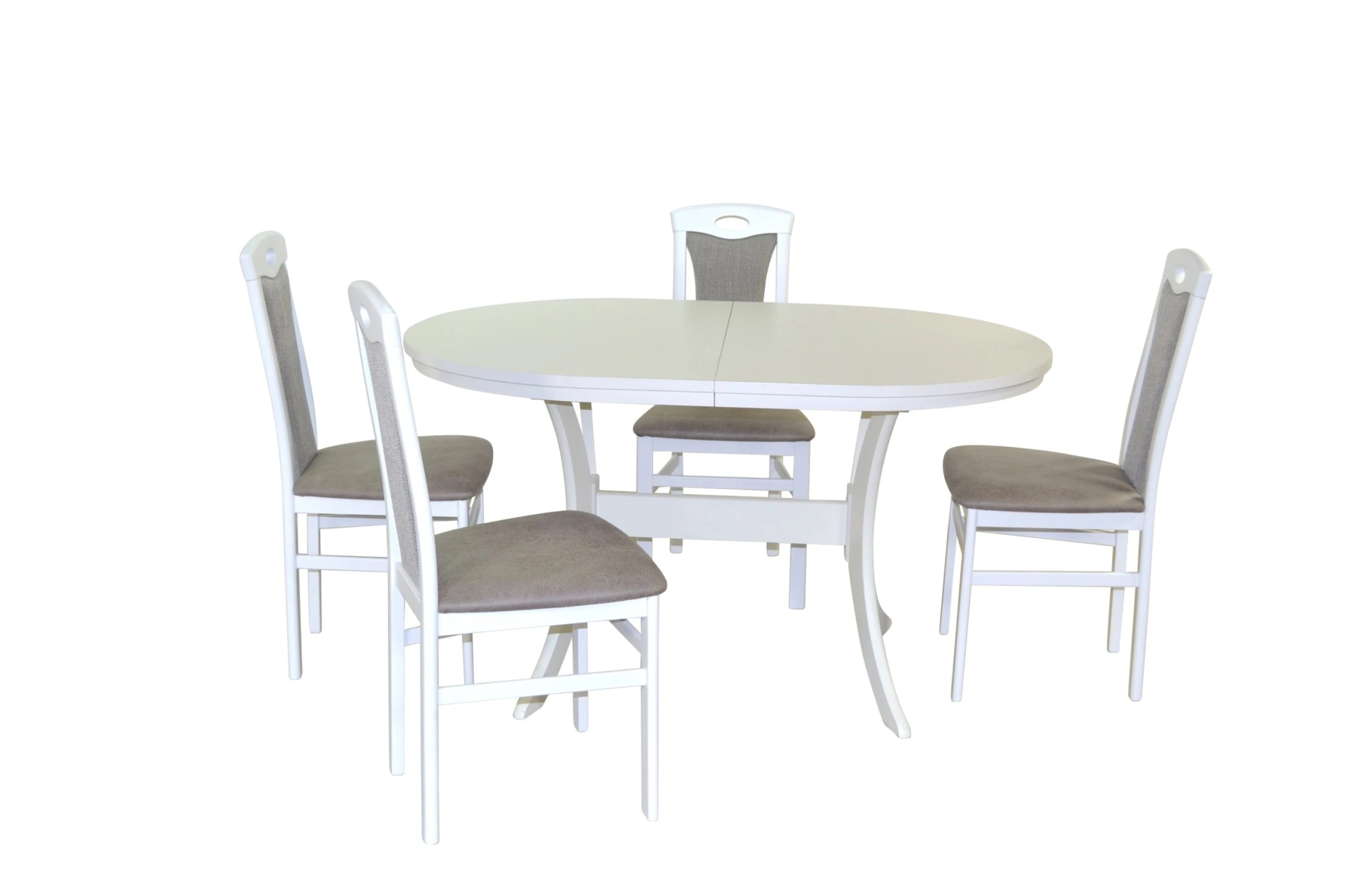 Hochwertige 5tlg. Essgruppe bestehend aus 4 Massivholzstühlen und 1 Esstisch. Stühle aus Massivholz Buche, weiß lackiert. Sitz und Rücken sind bequem schaumstoffgepolstert und mit attraktiven Stoffbezügen bezogen. Sitz mit einem Bezug in Kunstlederoptik (100% Polyester), Rücken mit einem Strukturstoffbezug (90% Polyester/10% Rayon). Praktisch die eingearbeitete Griffmuschel im oberen Rückenbereich. Esstisch mit einem modernen, stabilen Gestell komplett aus Holzwerkstoff gefertigt und mit einem strapazierfähigen, pflegeleichten Melamin-Holzdekor, weiß, beschichtet. Die ovale Tischplatte ist ausziehbar, darunter ist eine ca. 40 cm breite Einlegeplatte, die sich problemlos dazwischen einlegen lässt und der Tisch schnell und einfach von 120 cm bis auf 160 cm vergrößerbar ist. Die Stühle werden montiert angeliefert, der Esstisch flach verpackt zur Selbstmontage, inklusive Aufbauanleitung. Maße ca. cm je Stuhl: (B/H/T) 45/95/48. Sitzhöhe ca. 46 cm, Sitztiefe ca. 39 cm. Maße ca. cm Esstisch: (BxHxT) 120-160x75x80.