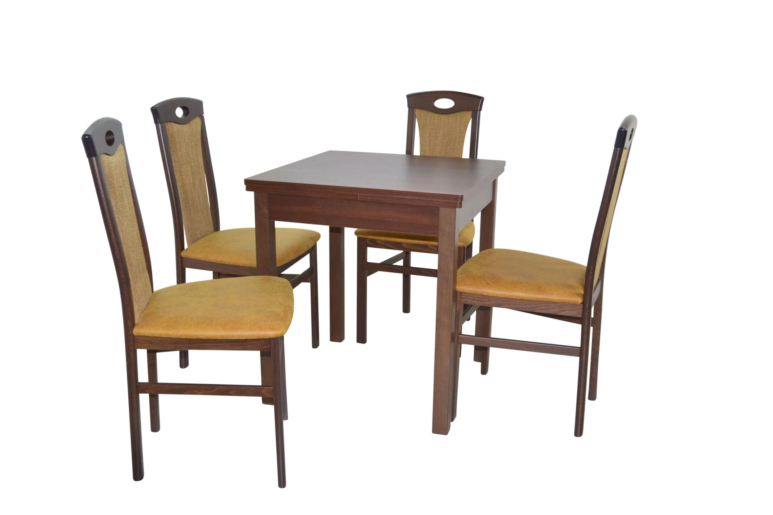 Hochwertige 5tlg. Essgruppe bestehend aus 4 Massivholzstühlen und 1 Esstisch mit zwei Ansteckplatten zum Vergrößern. Stühle aus Massivholz Buche, nussbaumfarben gebeizt und lackiert. Sitz und Rücken sind bequem schaumstoffgepolstert und mit attraktiven Stoffbezügen bezogen. Sitz mit einem Bezug in Kunstlederoptik (100% Polyester), Rücken mit einem Strukturstoffbezug (90% Polyester/10% Rayon). Praktisch die eingearbeitete Griffmuschel im oberen Rückenbereich. Esstisch mit zwei Ansteckplatten (je ca. 30 cm breit), die rechts/links unter der Tischplatte eingeschogen sind, dadurch lässt sich die Tischplatte einfach und schnell von 67 cm bis auf 127 cm vergrößern. Beine vom Esstisch aus Massivholz Buche, nussbaumfarben gebeizt und lackiert. Platten aus Holzwerkstoff die mit einem pflegeleichten Melamin-Holzdekor, Nussbaum-Nachbildung, beschichtet sind. Die Stühle werden montiert angeliefert, der Esstisch flach verpackt zur Selbstmontage, inklusive Aufbauanleitung. Maße ca. cm je Stuhl: (B/H/T) 45/95/48. Sitzhöhe ca. 46 cm, Sitztiefe ca. 39 cm. Maße ca. cm Esstisch: (B/H/T) 67-127/75/67.